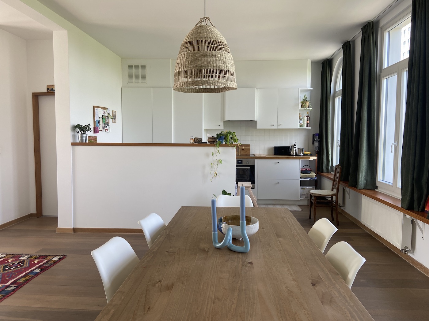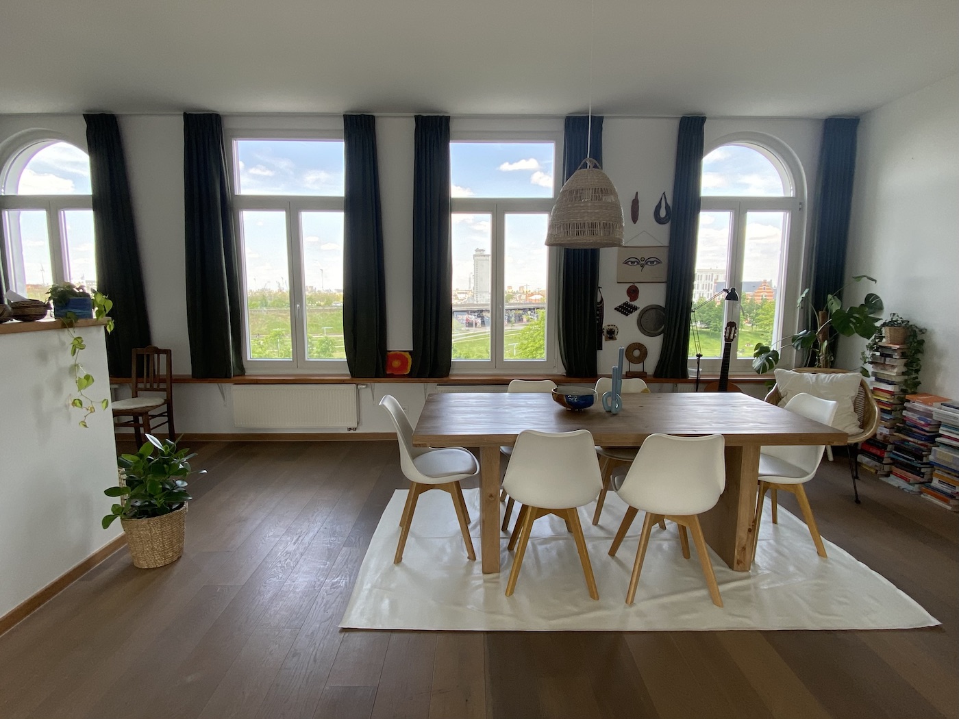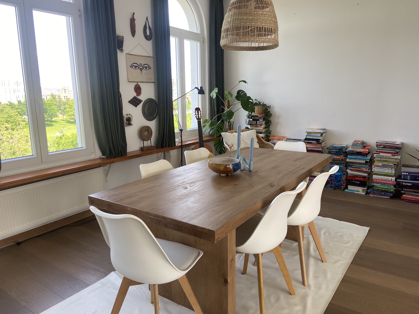 This bright, quiet sanctuary offers ample space to unwind and relax after a full day of sightseeing. The living space is versatile, with various tables and a dedicated desk, perfect for working or engaging in creative projects. You can practice yoga in a serene room or bask in the sunshine in the living room. On sunny days, open the big windows and enjoy the day on the balcony. The large kitchen is ideal for preparing your favorite meals, and the dinner table overlooking the park is perfect for evening conversations. The bedrooms and bathroom are situated upstairs, providing a peaceful retreat to wind down from the day.