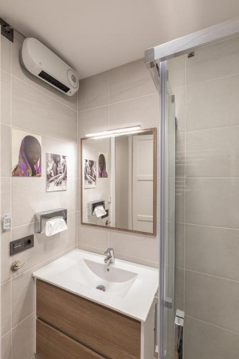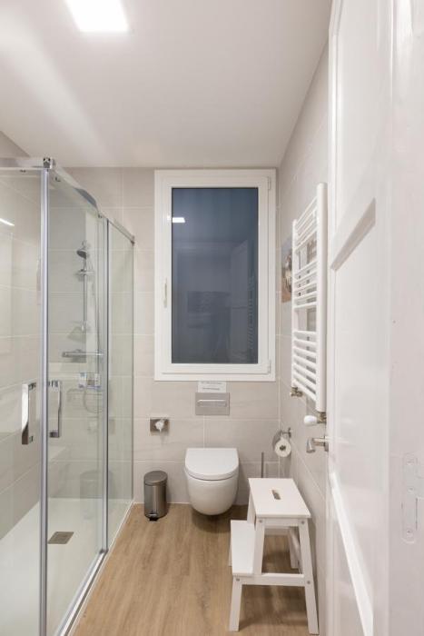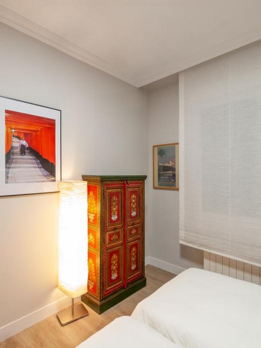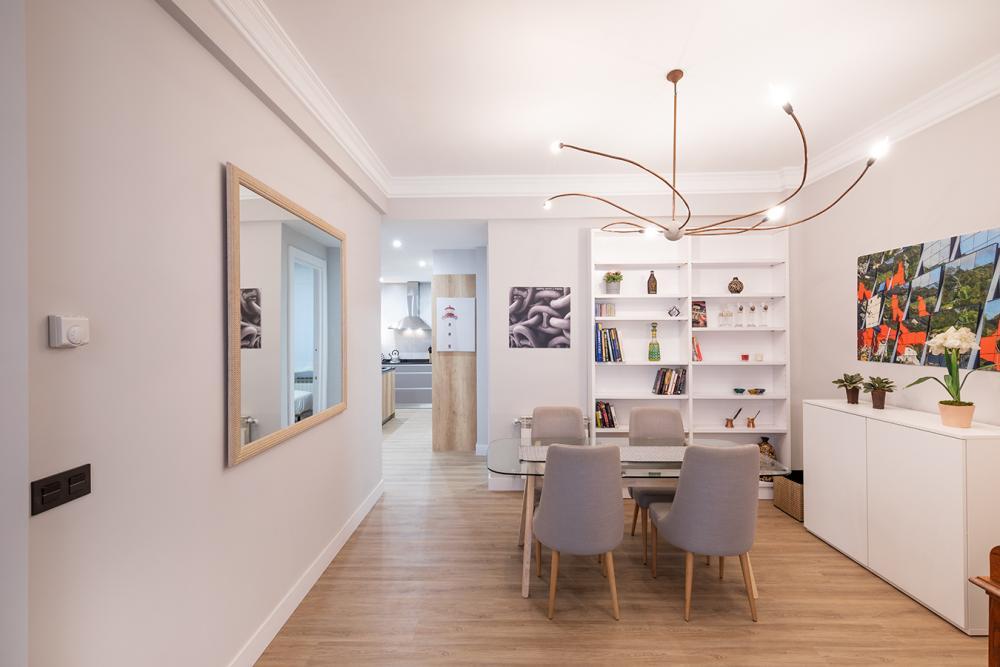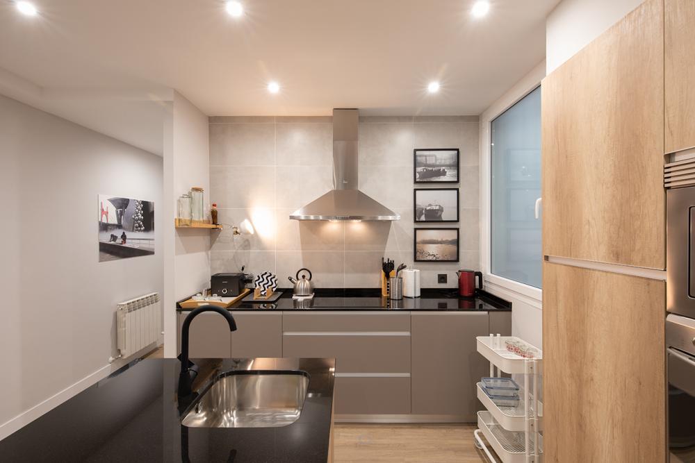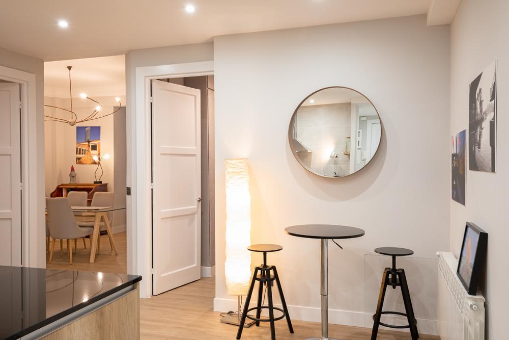 When you enter this apartment in Bilbao, you will notice the spacious feeling you get. The apartment is recently renovated and contemporarily decorated. The open kitchen concept gives you enough counter space for all your culinary adventures. You are in Basque country, home of some of the greatest Michelin-star restaurants. The kitchen has a modern breakfast nook with two stools and a high top table.