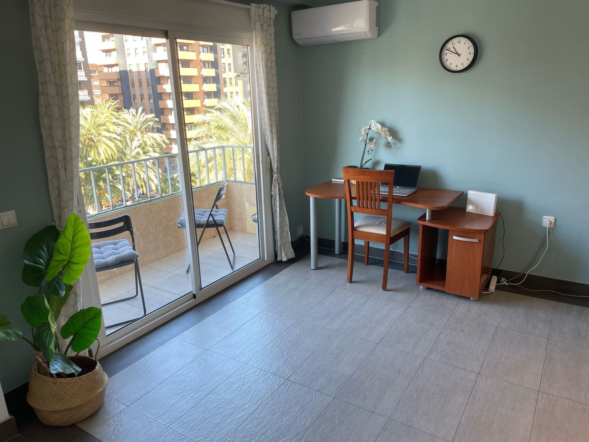 In the living room, you will find a lot of use of white furniture and white tiles to enhance the light that penetrates the apartment. The living room is equipped with a comfortable long sofa and also has room for a small desk. In the living room, you can also find a dining table with 4 chairs. The living room also gives you access to a typical Valencian balcony that will be cool in the Summer.