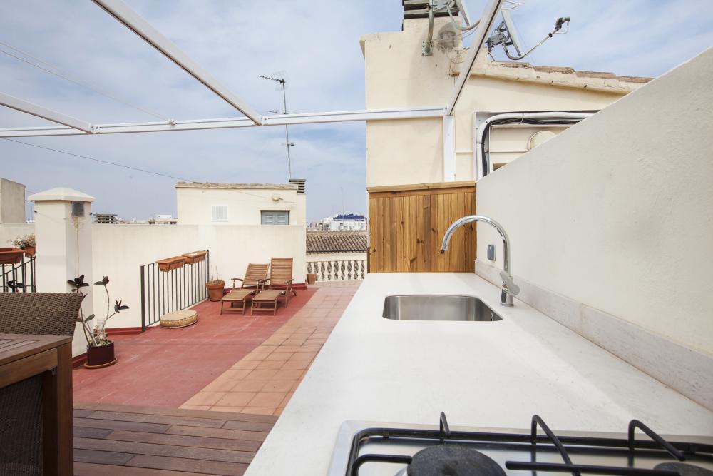 The location just across of the river Turia is great as this is a tranquil area but you are steps away from the hustle and bustle of the city. When you watch the video and the pictures of this apartment, you can not not notice the multilevel rooftop terrace. It spans over the complete roof and is in typical Spanish style overlooking the city. This rooftop terrace is great for entertaining, relaxing or even cooking. The terrace has a complete outdoor kitchen and a big dining table that sits up to 6 people very comfortably. It is also the location of your washer. The patio also comes with two comfortable lawn chairs.