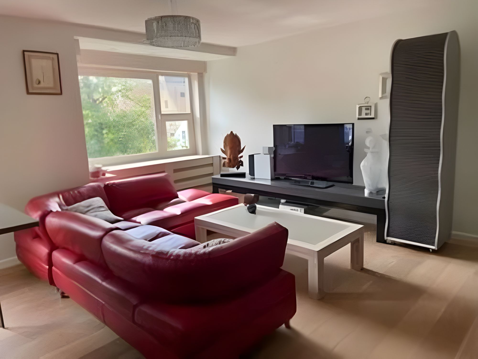- Bright Living Area: The spacious living room features large windows that fill the space with natural light, a cozy red couch perfect for relaxing, and a large TV for entertainment.