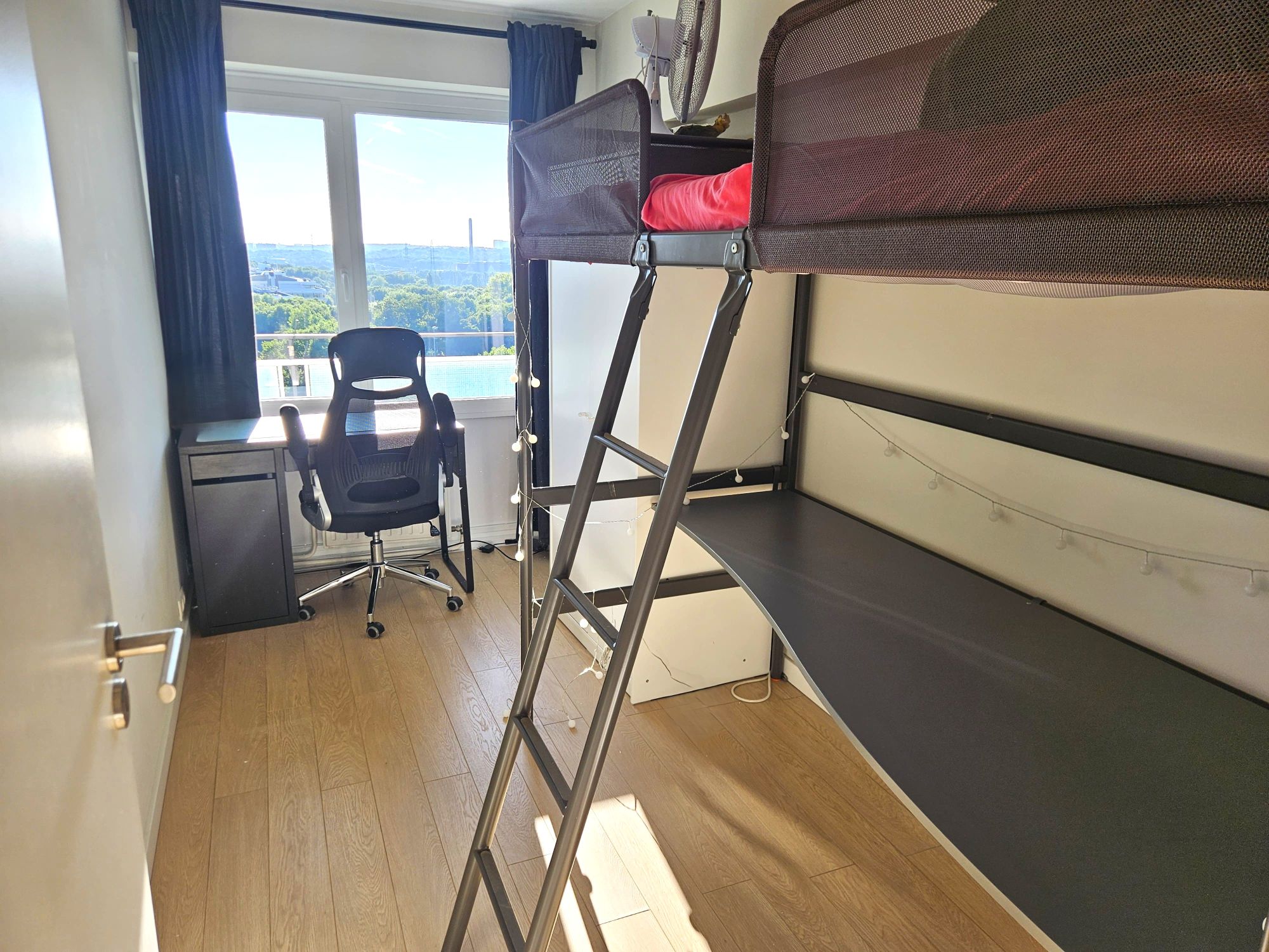 The layout is ideal for working from home or commuting into Brussels. One bedroom features a queen-size bed, while the second is designed as a hybrid space with a bunk bed and two desks—perfect for remote work or study. A bright living room includes a sofabed for occasional visitors, and the open kitchen comes with modern appliances including an oven, microwave, toaster, dishwasher, and more. The apartment is fully furnished and move-in ready, with heating, high-speed Wi-Fi, a washing machine, and private parking in a box garage for added convenience.