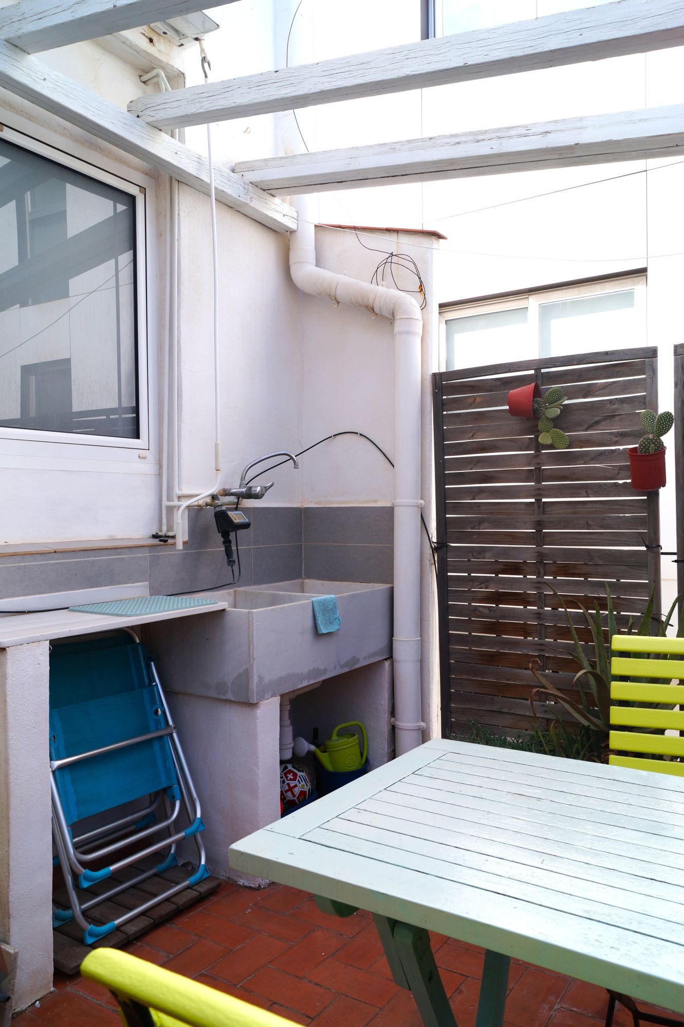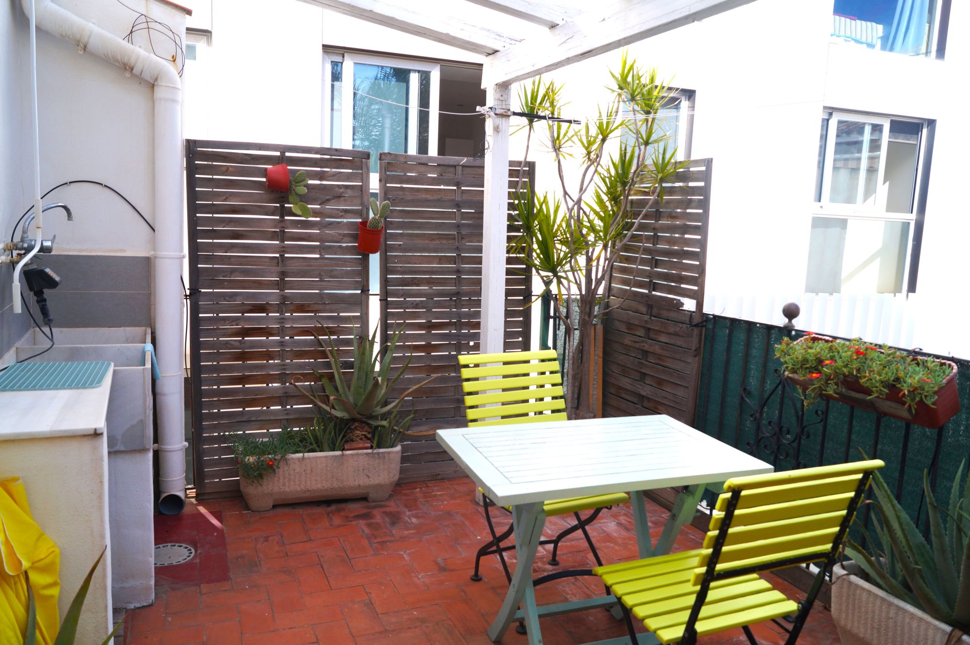 The standout feature is the large private terrace, equipped with outdoor furniture and surrounded by plants — perfect for enjoying the Mediterranean sun, working outdoors, or simply unwinding after a day of work.