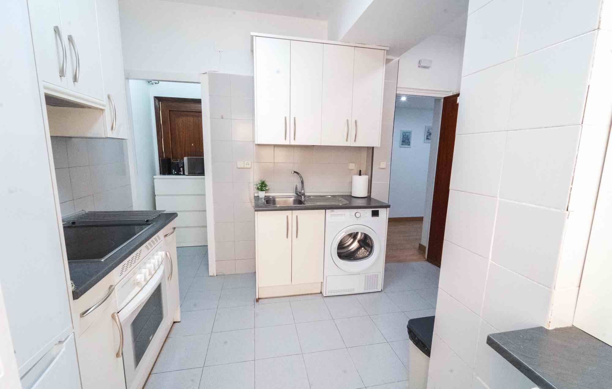 The kitchen of Bernabeu - Coliving Madrid by Globexs is fully equipped with an oven, microwave, kettle, and toaster, and all you need to prepare and enjoy your meals. Next is the laundry area with a washing machine, and dryer. Of course, you have the vacuum cleaner, iron, and ironing board.
