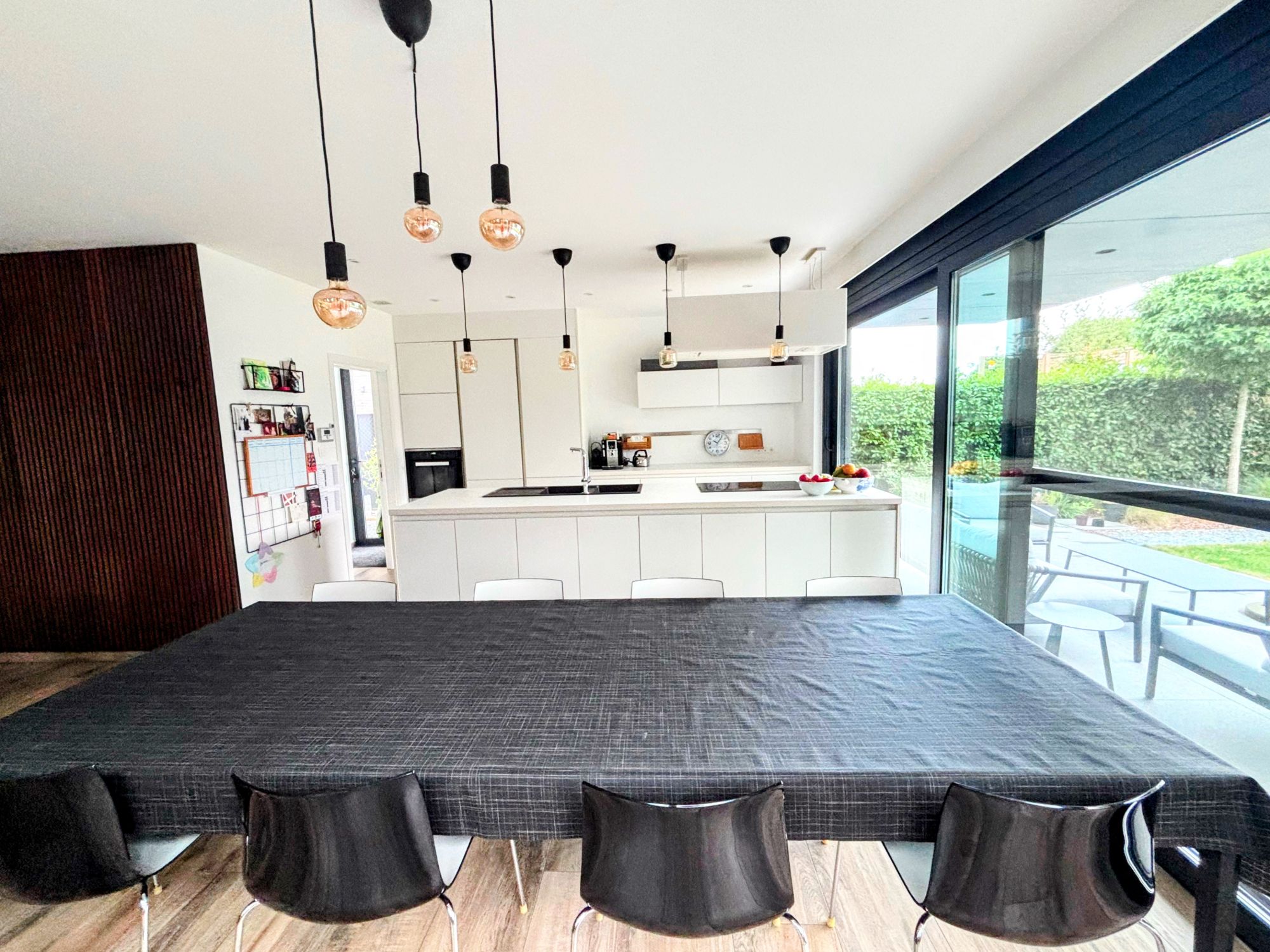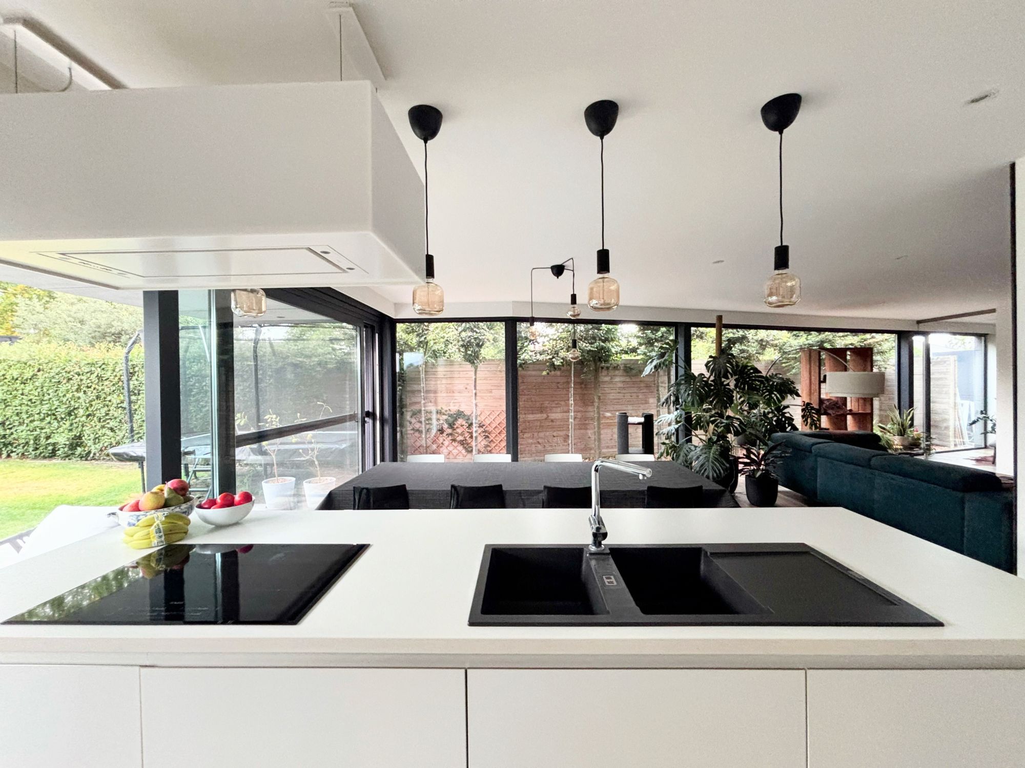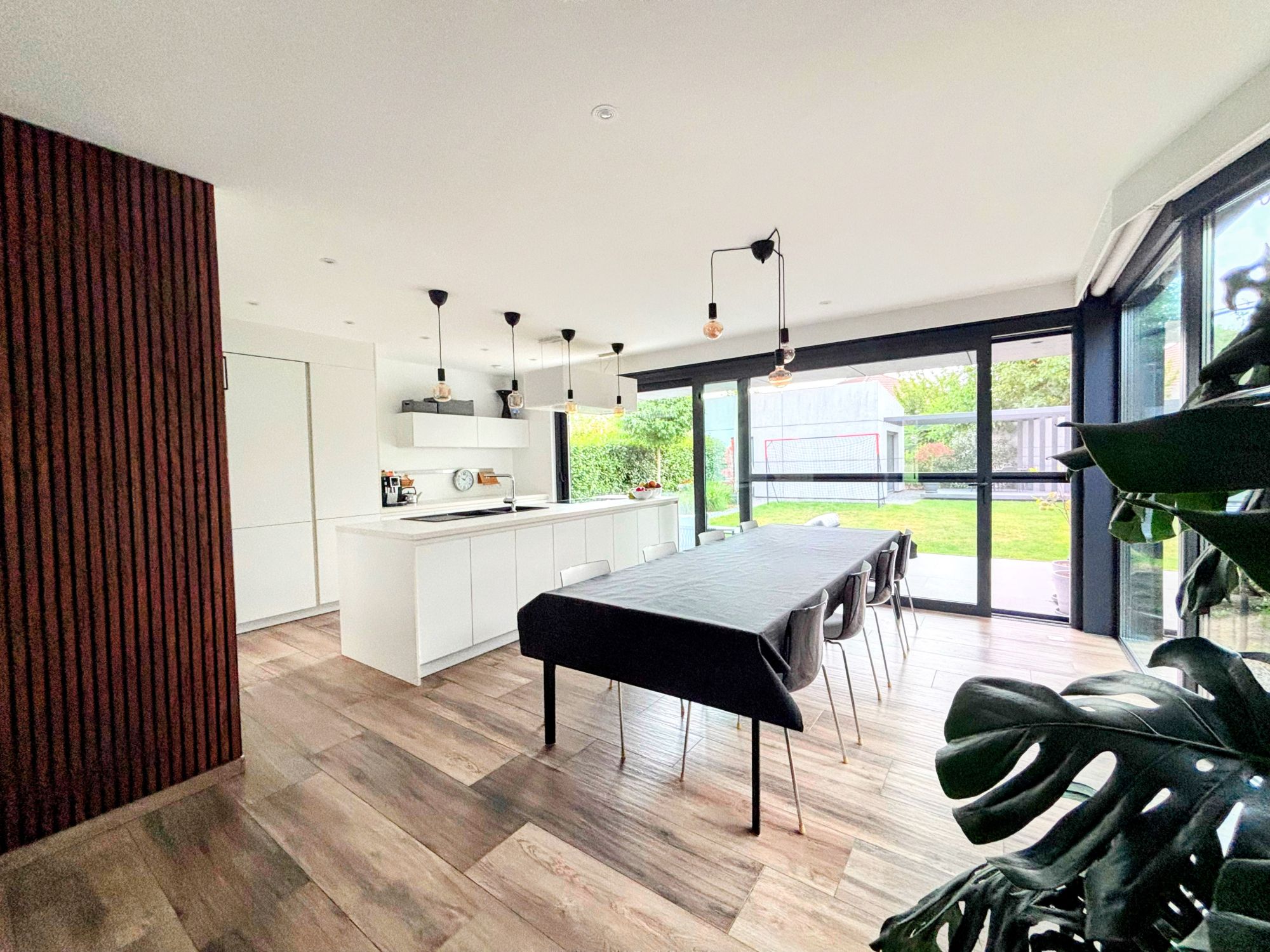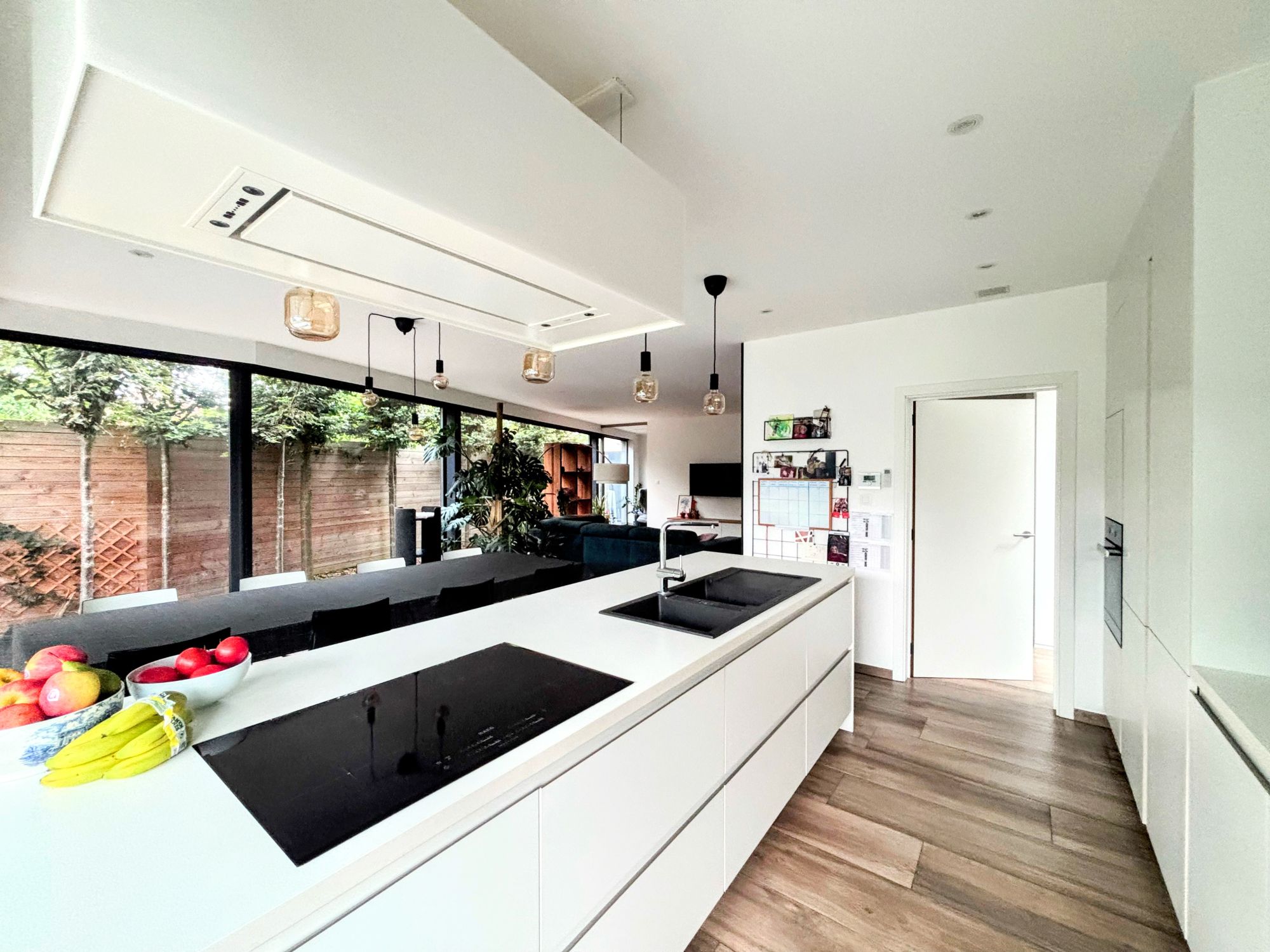 The home features a bright, open-plan living layout with large windows that seamlessly connect the interior to a beautifully landscaped garden. At the heart of the property is a contemporary kitchen with a central cooking island, ideal for professionals who enjoy cooking or entertaining guests. The adjacent dining area adds to the inviting and spacious ambiance of the house.
