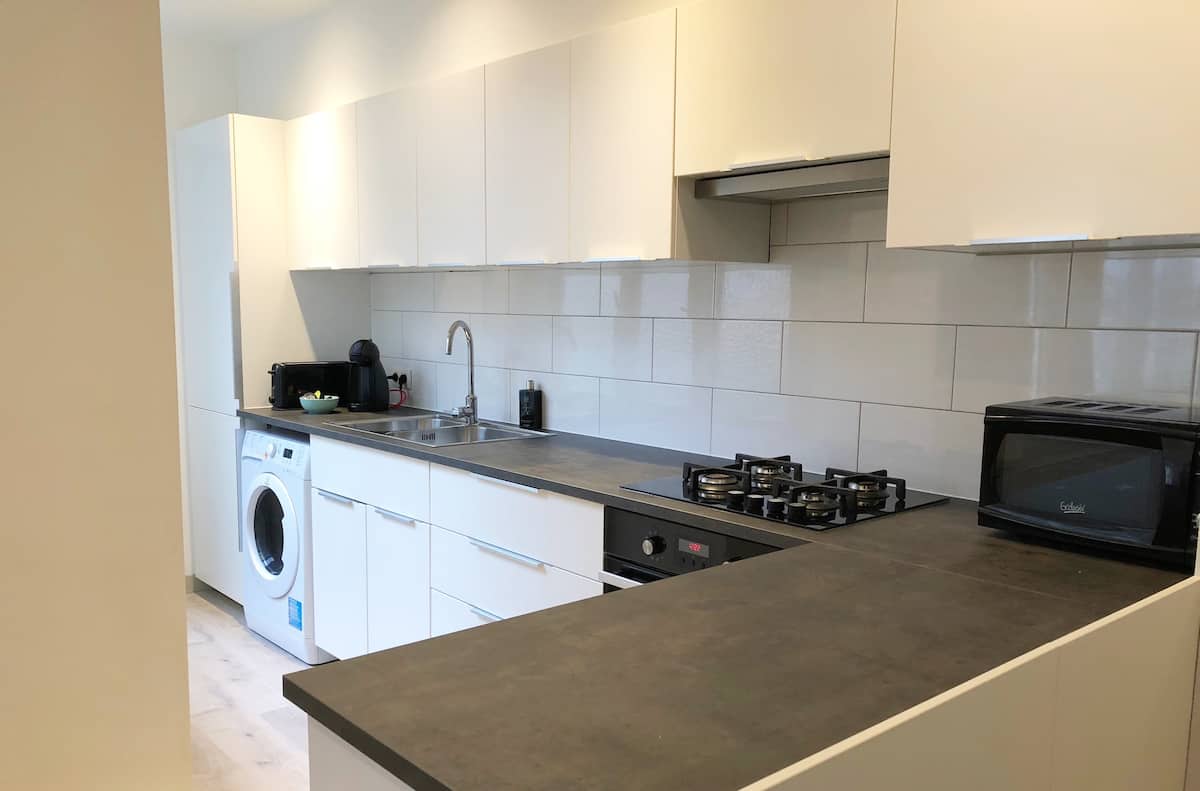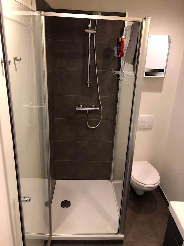 Meir is an entry ready expat flat in Antwerp. It has one master bedroom with a double bed. The bedroom is super spacious and bright, thanks to the windows! You have lots of storage room to store your stuff and there is even a desk. This comes in handy to get some work done! The bathroom has a shower, washing basin and of course, a toilet. It is clean and modern.