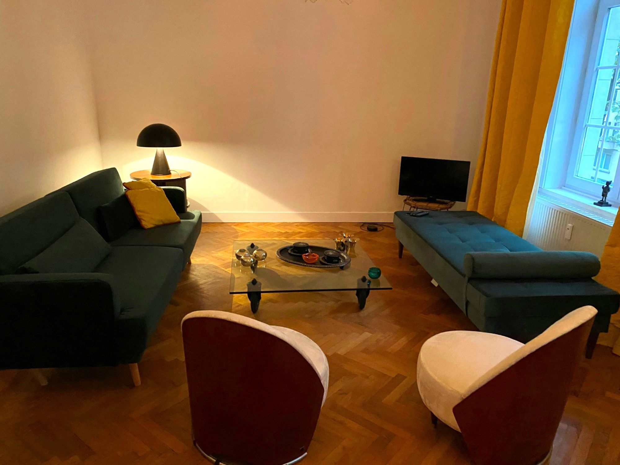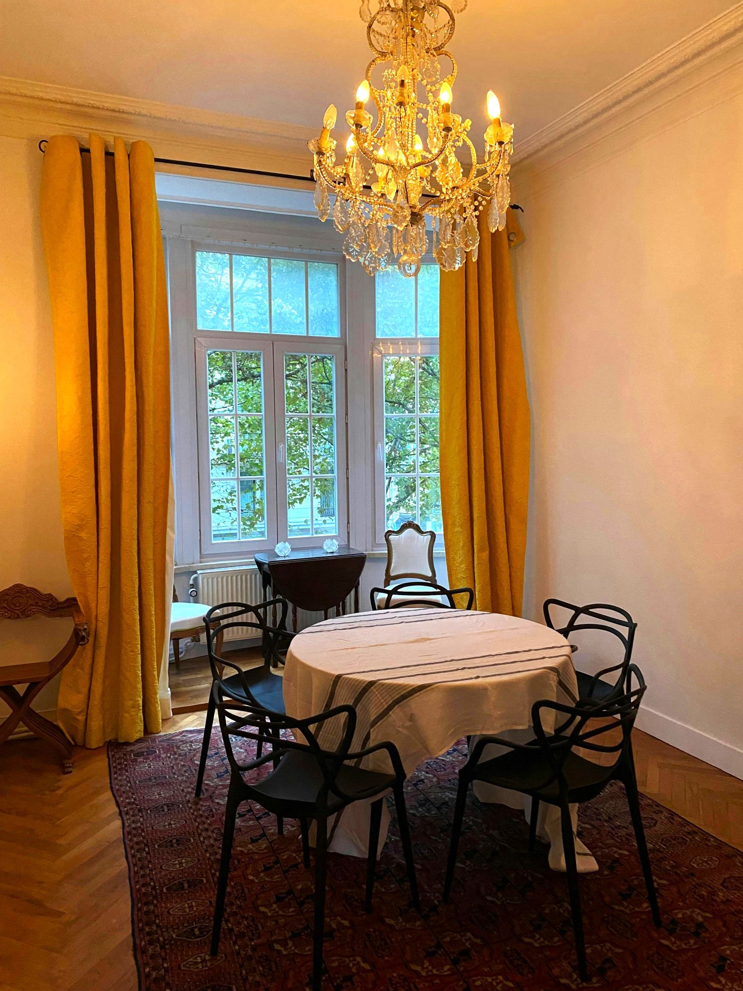 The living room is beautifully furnished with quality furniture. The high ceilings and large windows make it spacious and light. The comfortable sofa and the TV that come with it make it the perfect place to relax after a hard day´s work or at the weekend.