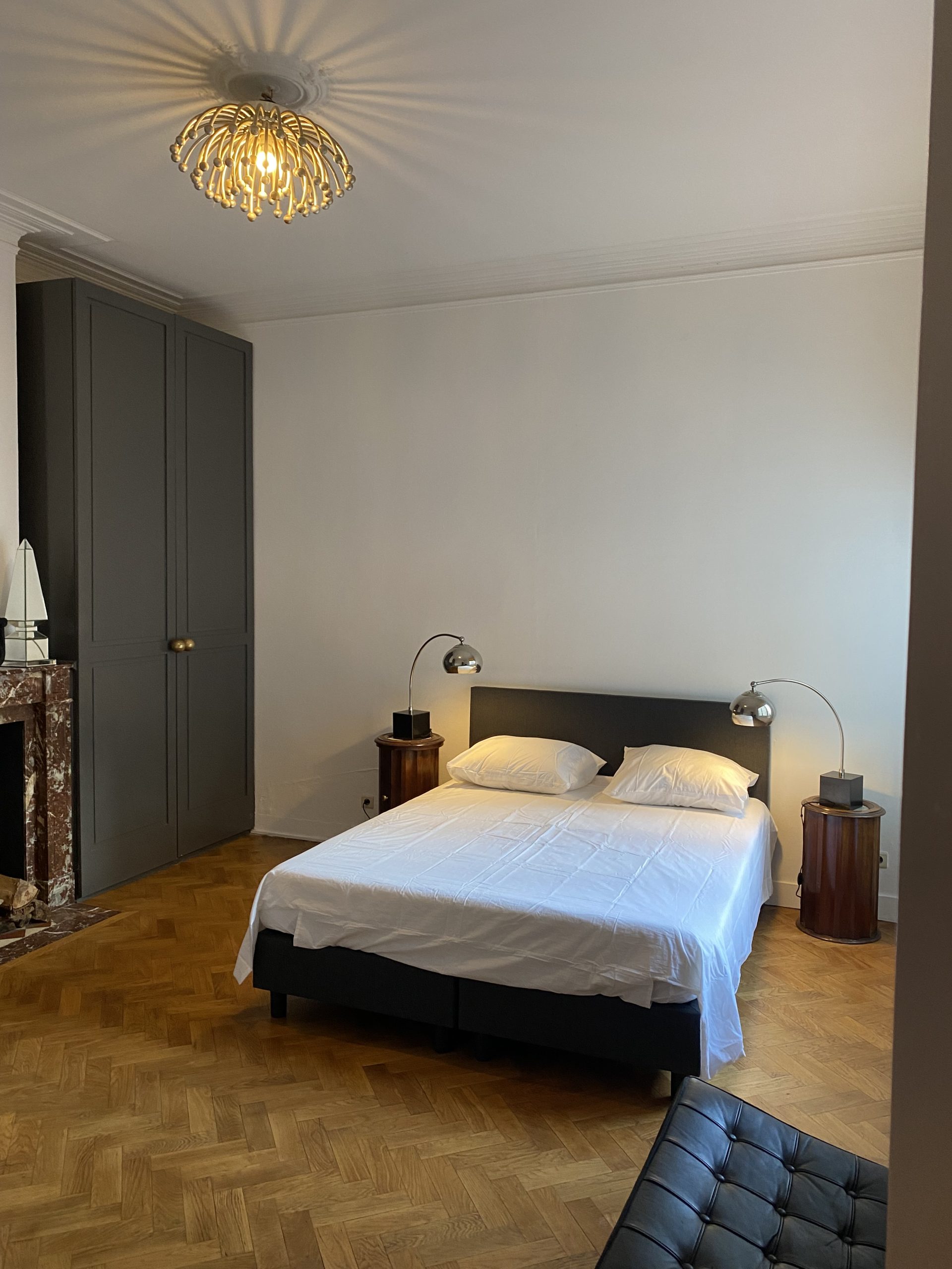 Behind an elegant (new) electric gate one arrives in a nice front garden where a spectacular Beaux-Arts building was built; at the Avenue Molière there is an exclusive apartment for rent in Brussels (Ixelles commune). It is a furnished apartment for monthly rental in Belgium. This beautiful apartment exudes luxury. It comes with 2 bedrooms and 1 bathroom. Both bedrooms have a double bed and plenty of storage space. The bathroom comes with a bathtub shower, sink, and a separate toilet.