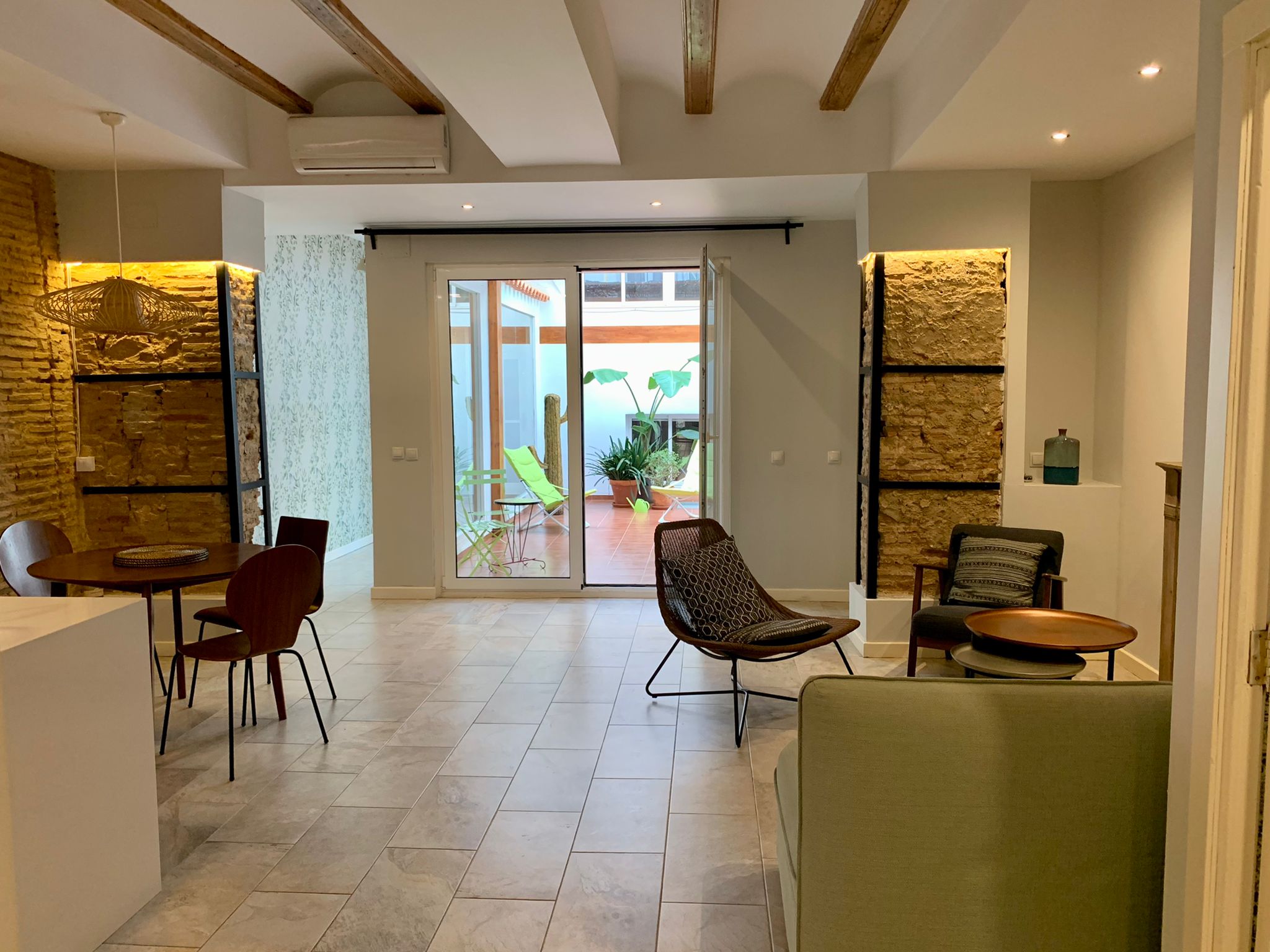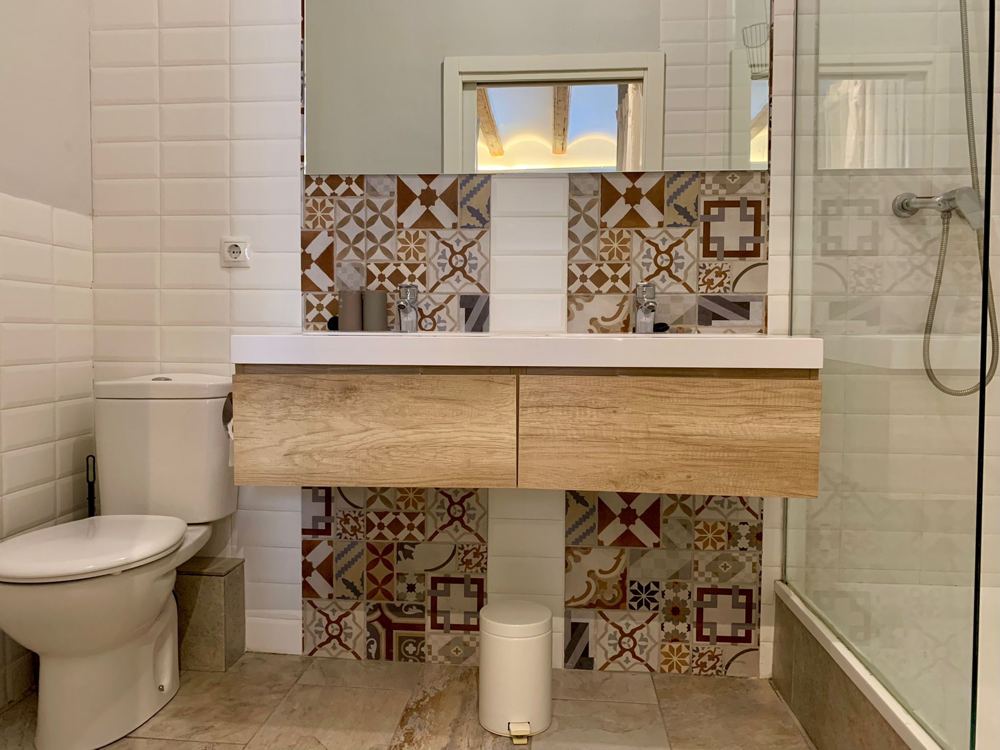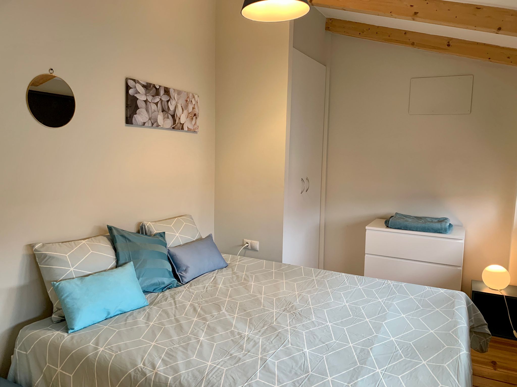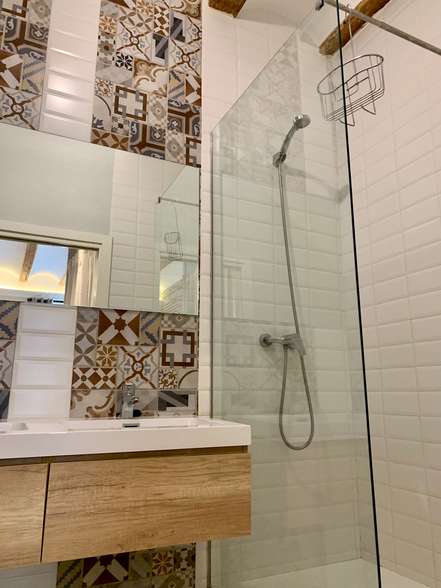 The entire flat is bright and catches plenty of natural light. The old elements like the beams in the ceiling etc have been kept but everything has been renovated in a modern way. This gives the flat a lot of charm. You will feel at home here from the moment you enter. Also, the mosaic floors, give the apartment character and style.