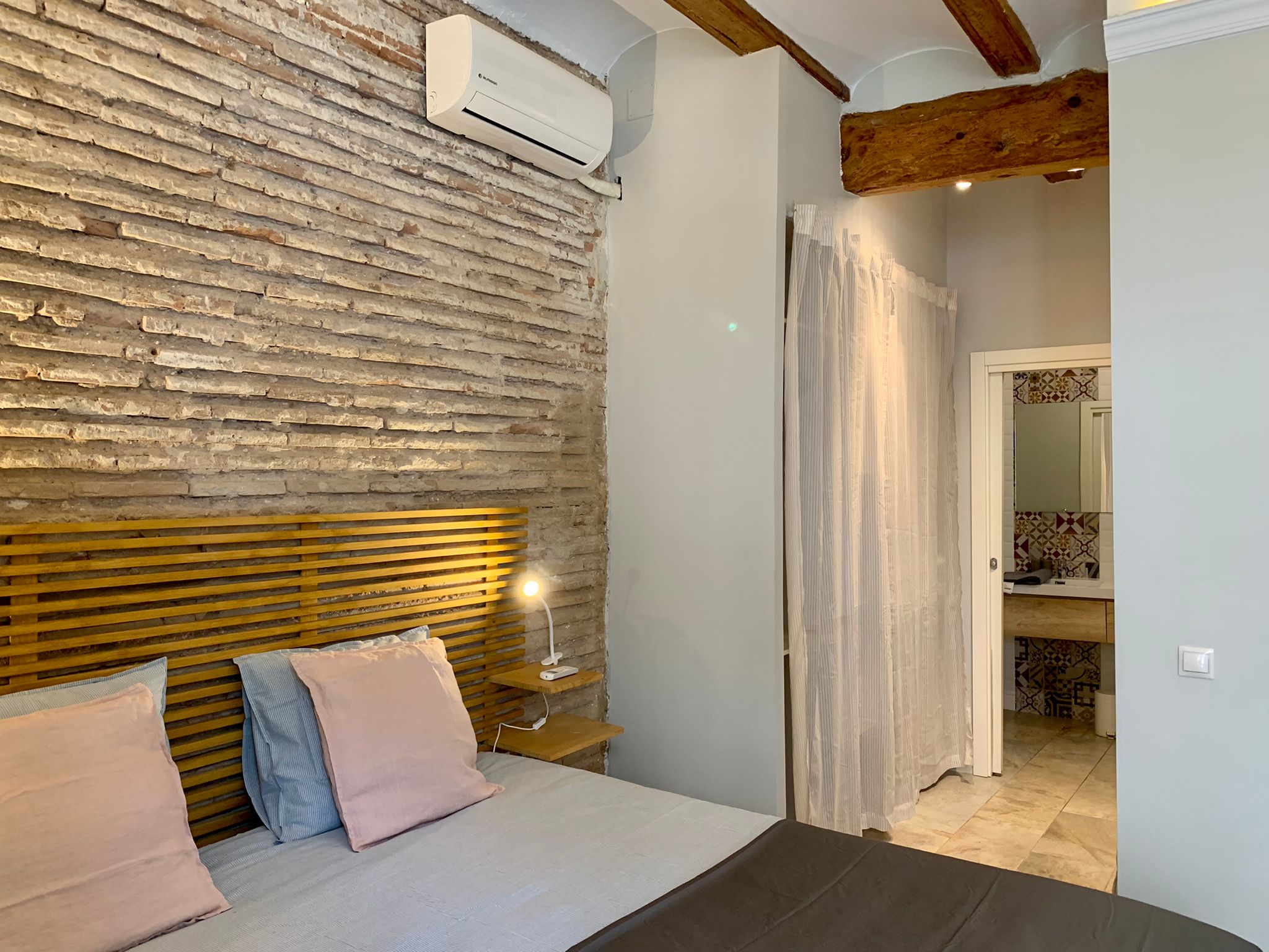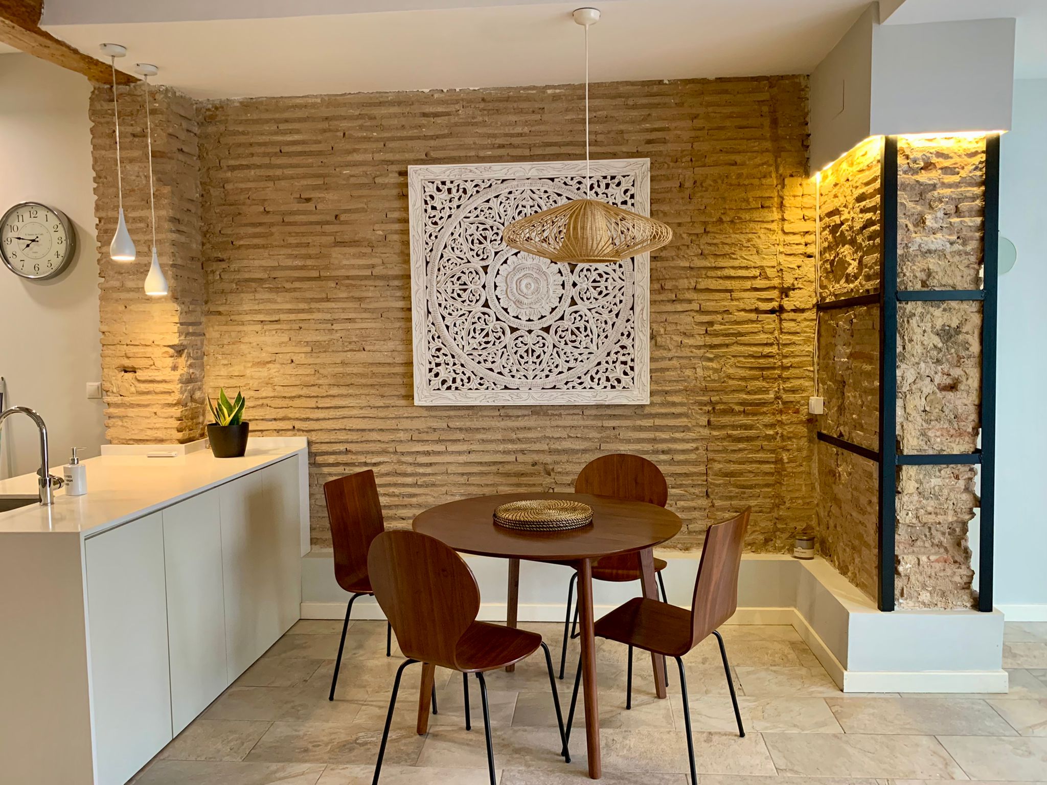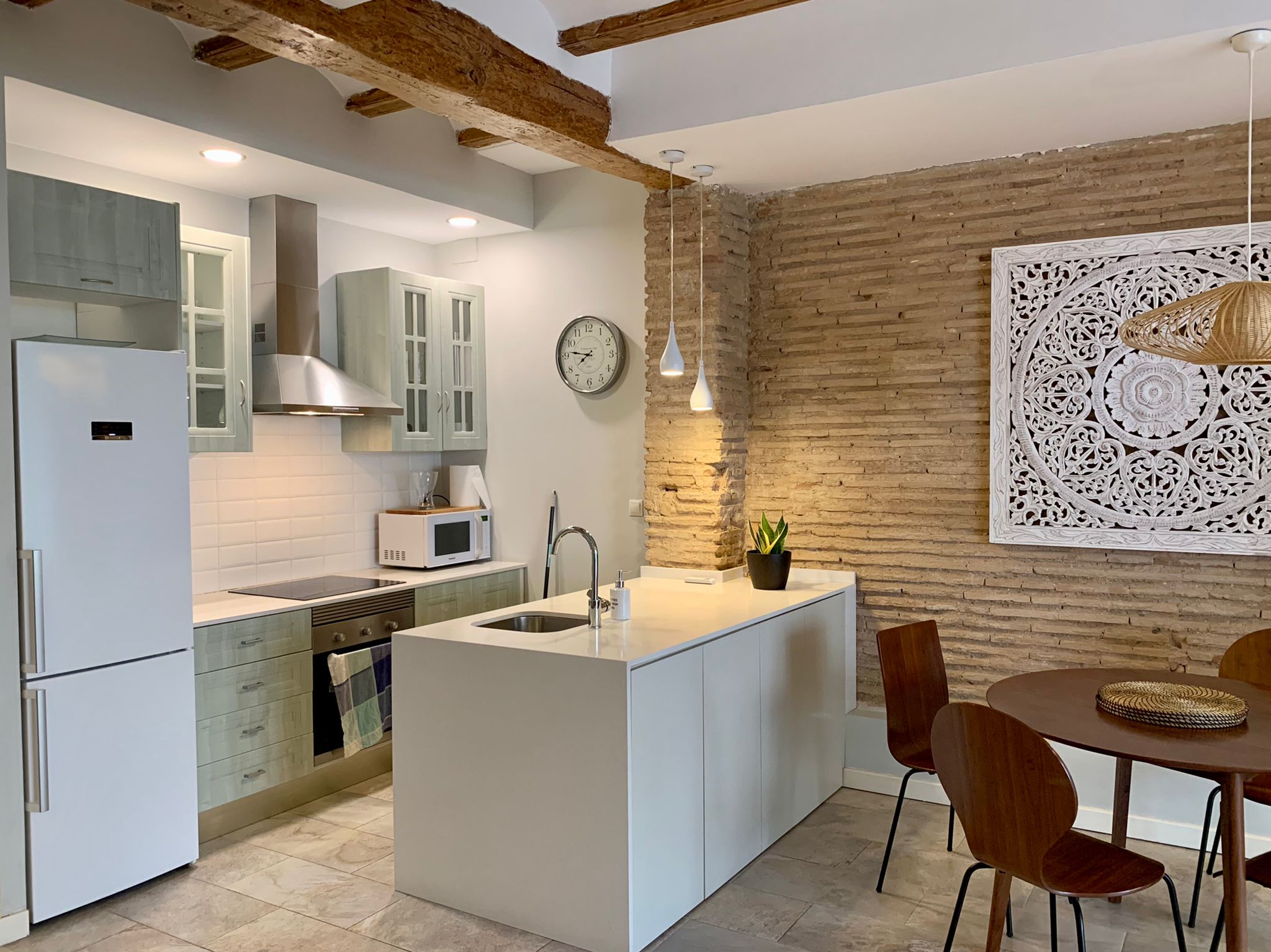 Convento is an exclusive apartment for rent in Valencia. It is an entry-ready accommodation in Valencia city center. This flat has three bedrooms and three bathrooms. The master bedroom has a double bed, dressing room, and ensuite bathroom. The bathroom has a walk-in shower, washbasins, and, of course, a toilet. The second bedroom has a single and plenty of wardrobe space. The second bathroom is in the corridor, it too has a shower, washbasins, and toilet. The kitchen is open-plan and fully furnished. There is a dishwasher, cooking island, fridge, freezer, everything you could need. The dining table can also be found here. It can seat up to four people, ideal for a cozy dinner evening!