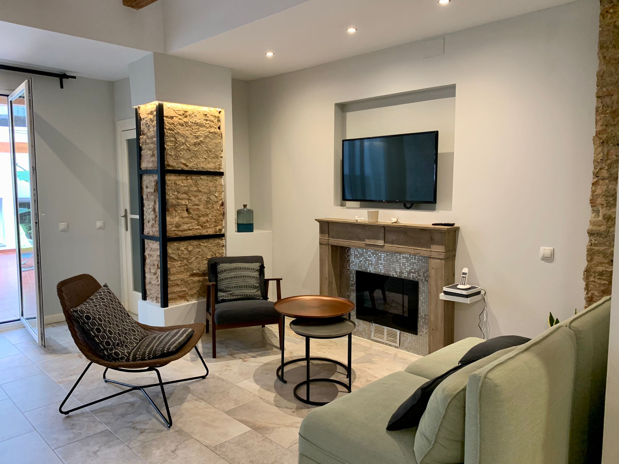 The living room is open and beautifully furnished with quality materials. You will find a comfortable sofa, a flat-screen TV, and chairs for relaxing. From the living room, you have direct access to the beautiful large terrace of this flat. The terrace has a long and large dining table and a lounge. There are also plants and a fireplace, ideal for winter.