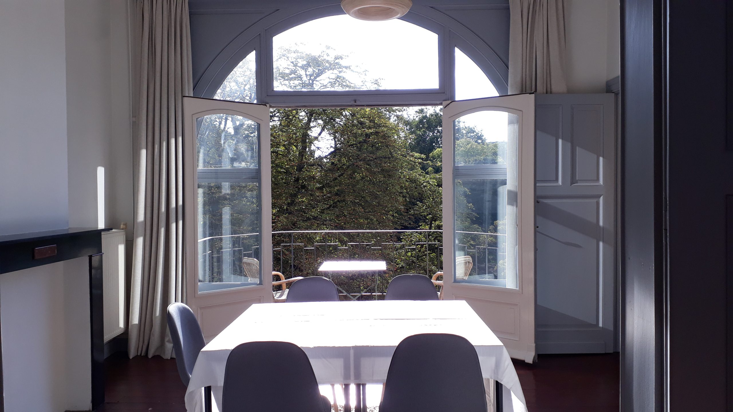 - Located on the second floor of a historic art deco house