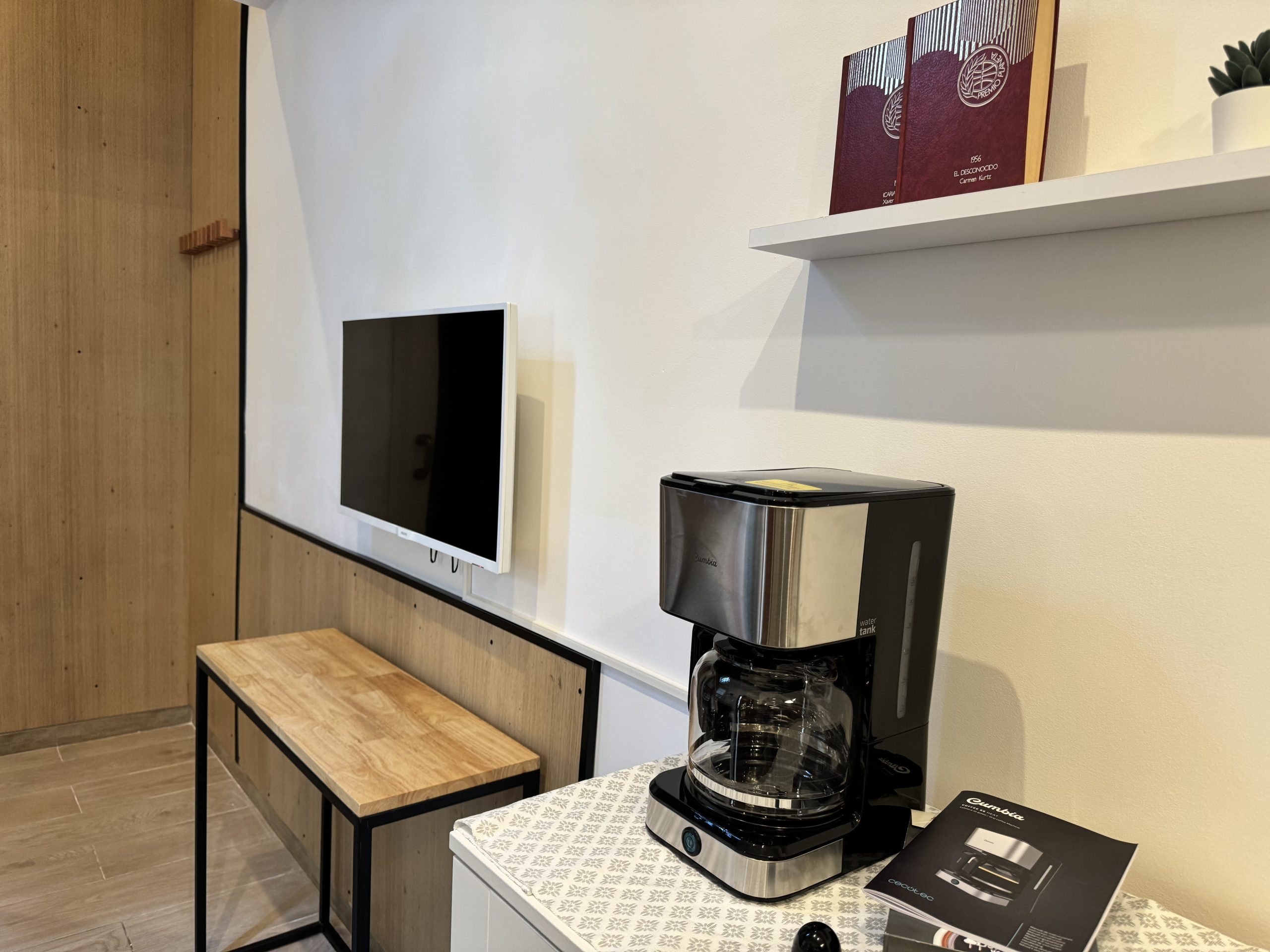 - Living room with TV and desk.