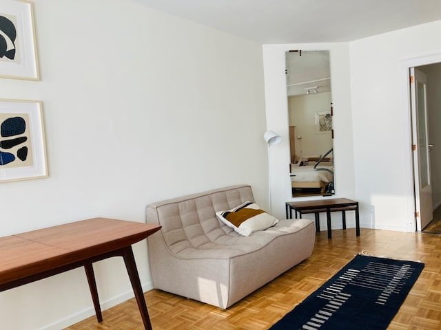 The living room is lovely furnished and super bright. This in combination with the wooden floors gives it a warm atmosphere. You will feel at home from the moment you walk in. There is a comfortable couch. This might be the perfect spot to relax after work or on the weekends.