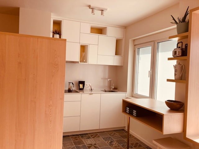 Grote 3 is a lovely studio for rent in Antwerp. It is a furnished monthly rental in Antwerp. The studio has one bedroom that comes with a double bed and built-in closets. The bathroom has a walk-in shower, washing basin and of course, a toilet. Here, you will also find the washing machine, which always comes in handy!