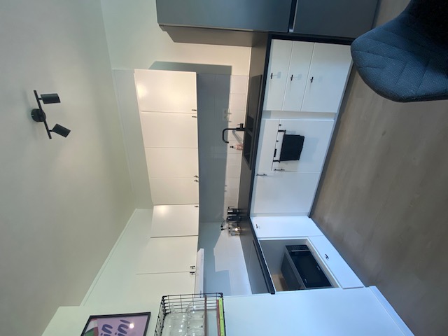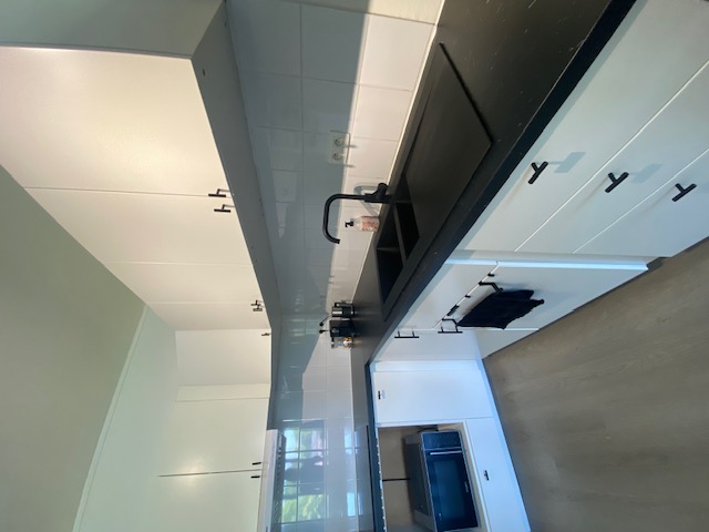 The open-plan kitchen is fully equipped and includes a cozy dining area. The bedroom features a comfortable double bed and leads into a walk-in dressing room and a sleek, modern bathroom with a walk-in shower. A separate toilet adds convenience, and both a washer and dryer are included for added comfort. The apartment also includes a private garage – ideal for parking, bike storage, or extra belongings – making it a complete, move-in-ready solution for temporary stays.