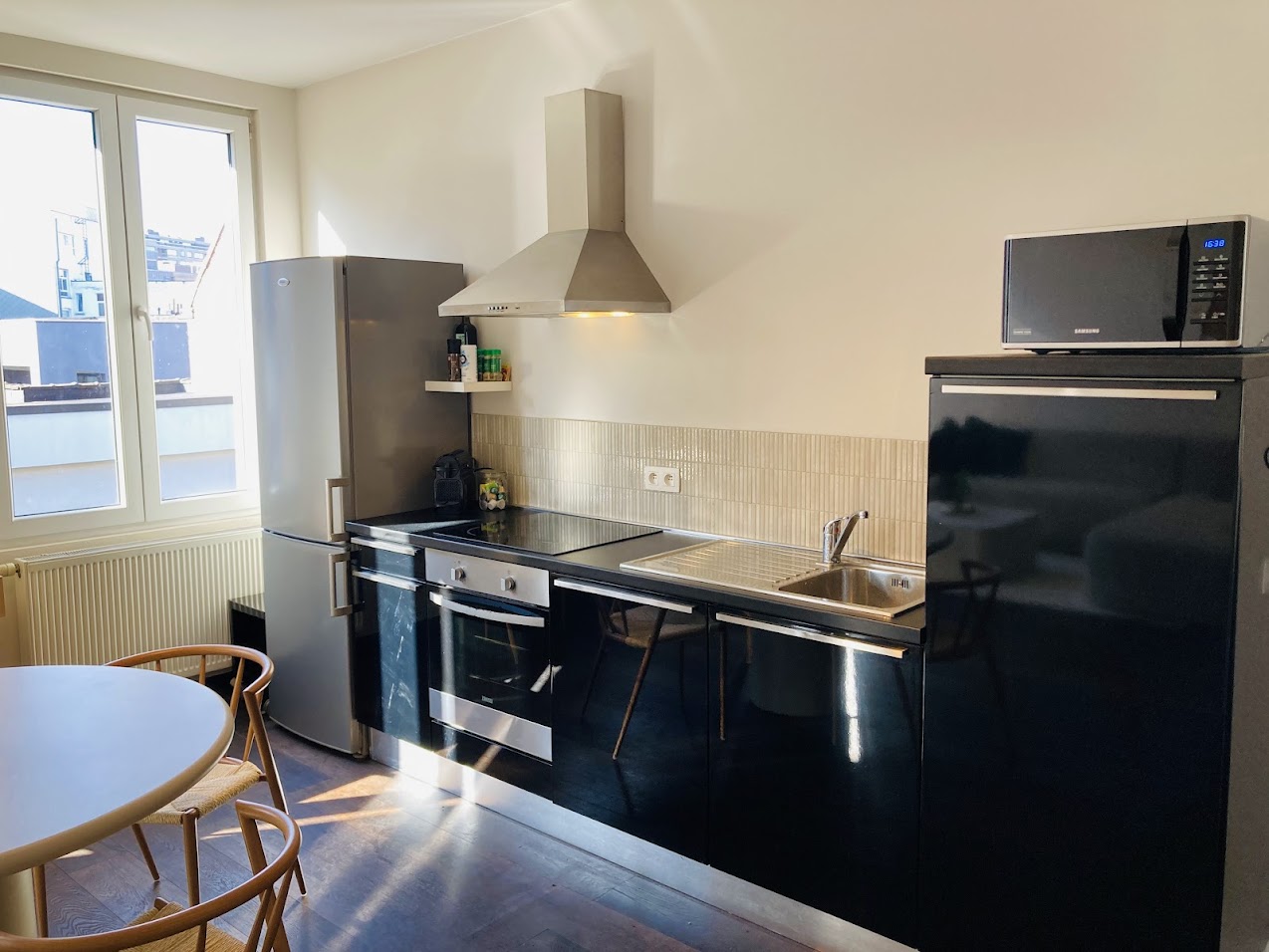 This luxurious one-bedroom apartment is a true gem in the heart of Antwerp’s trendy Zuid district. Featuring elegant wooden flooring and abundant natural light, the open-plan living space seamlessly blends comfort and modern design. The fully equipped kitchen includes a large refrigerator, freezer, oven, microwave, and dishwasher—perfect for those who love to cook.