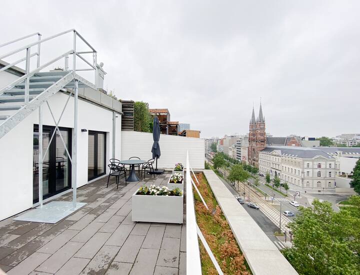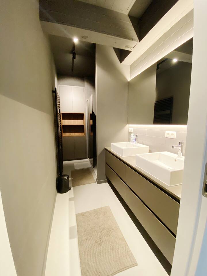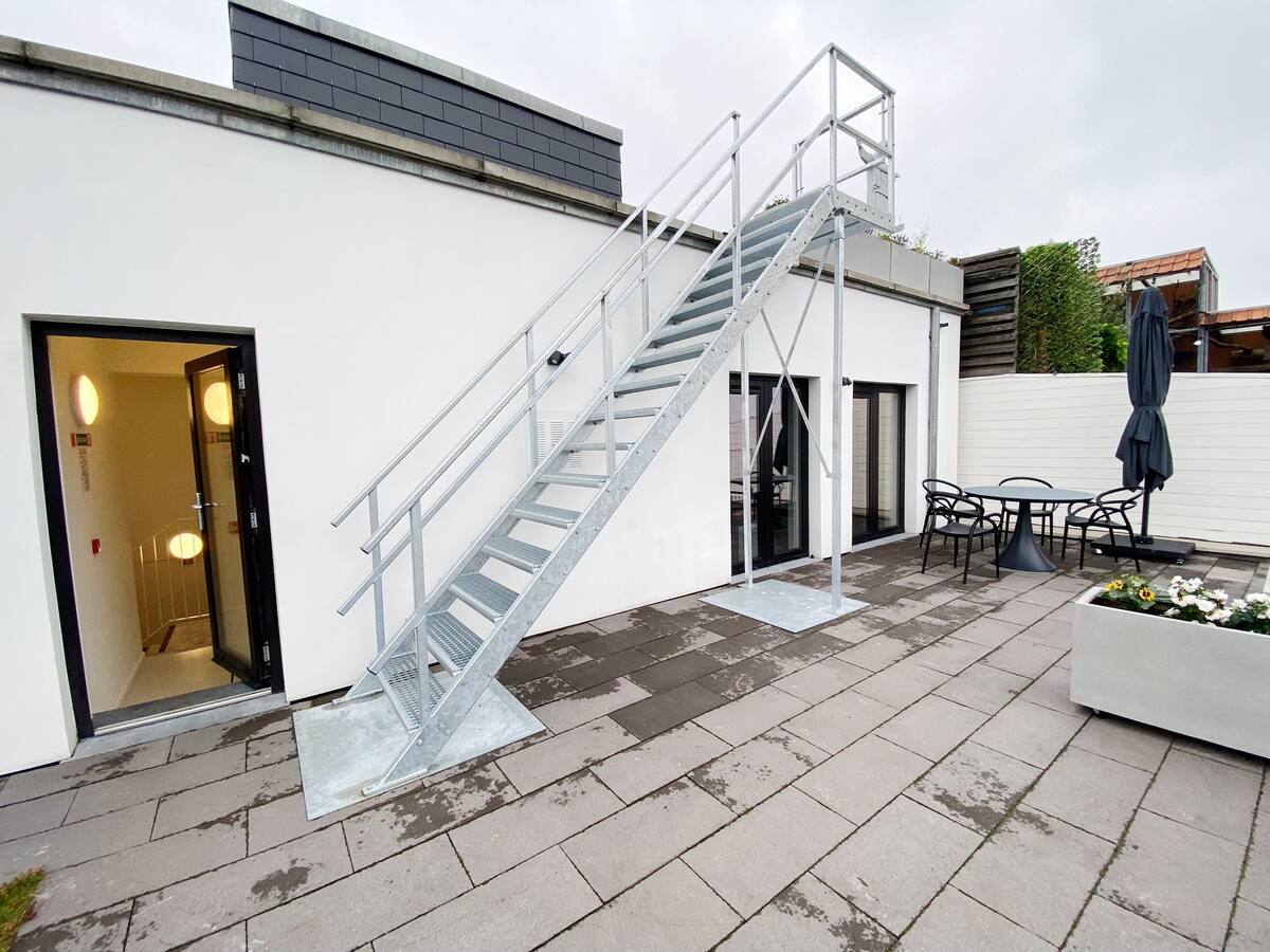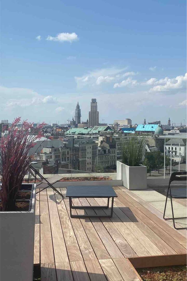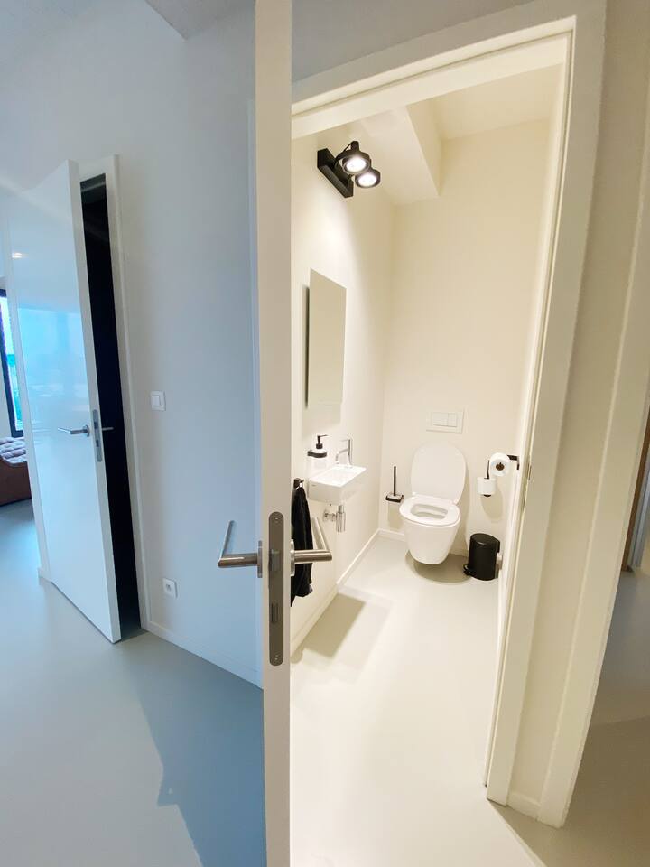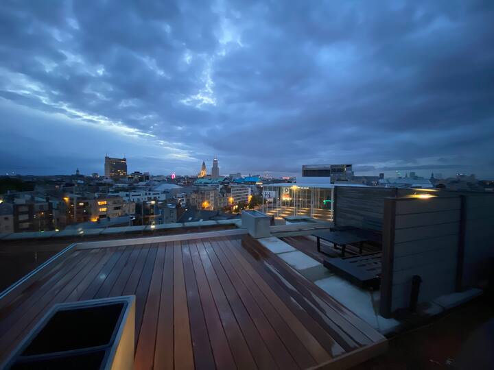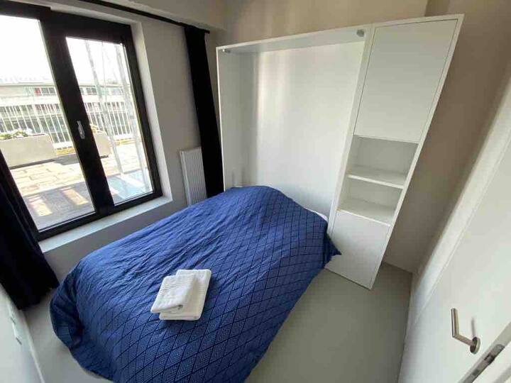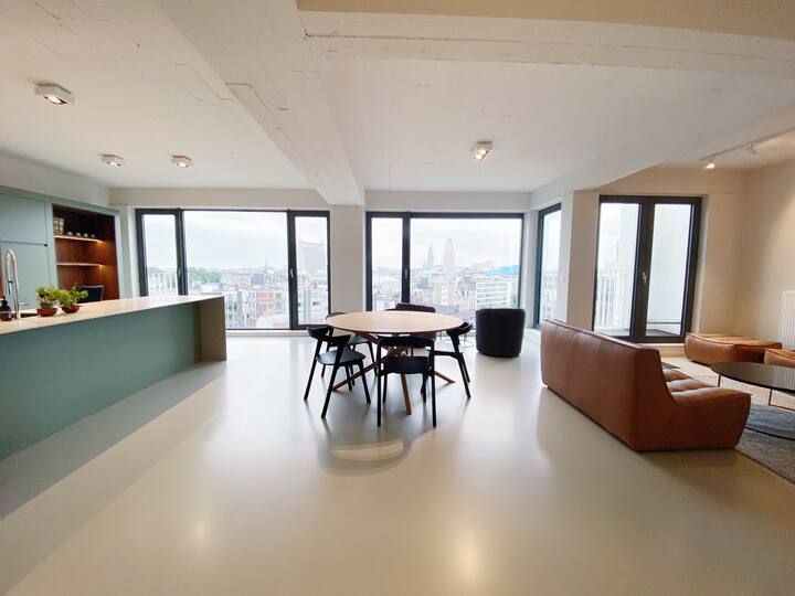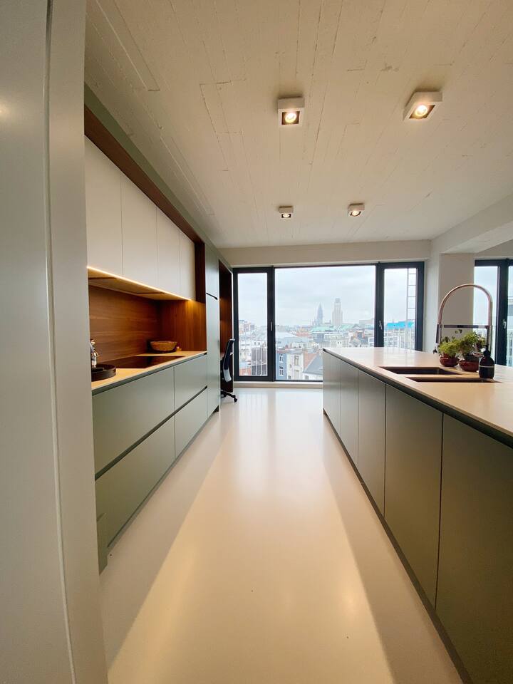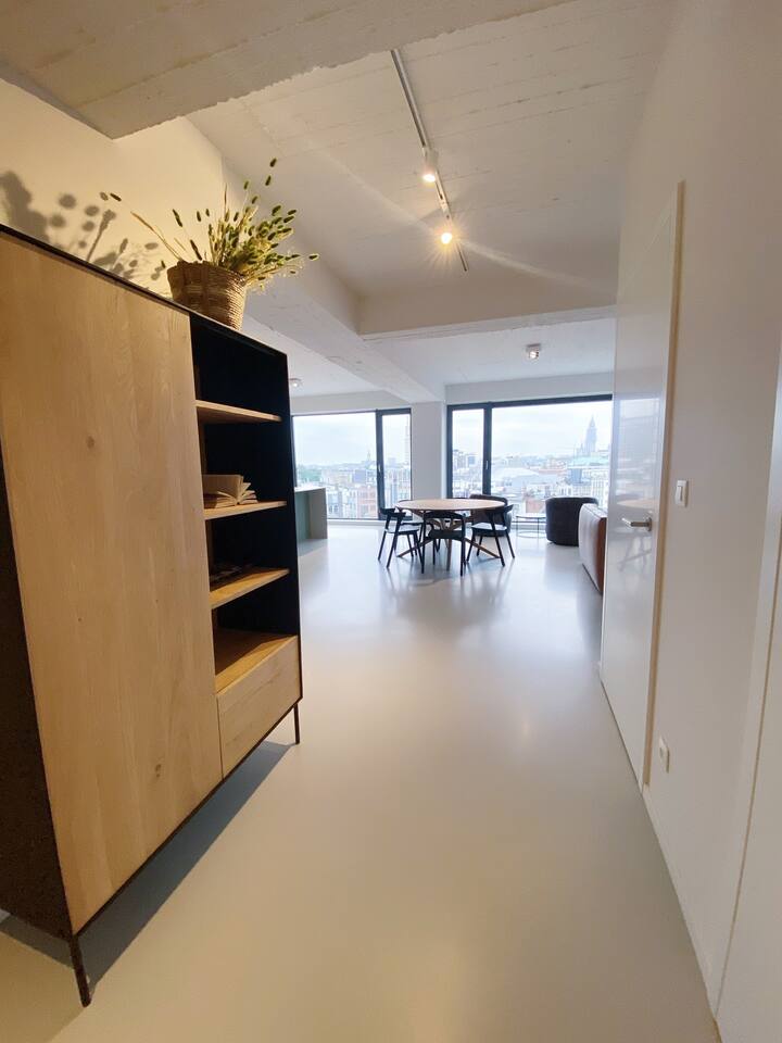 This is the perfect spot to relax after a long day of work or on the weekends. From the living room you also have access to the large terrace that comes with this apartment. The terrace has amazing panaromic views over the city of Antwerp. Here, you will find a lounge set, to enjoy the sunrise and sunset. There is also a washing machine and dryer as well as two parking spaces. This is very convenient.