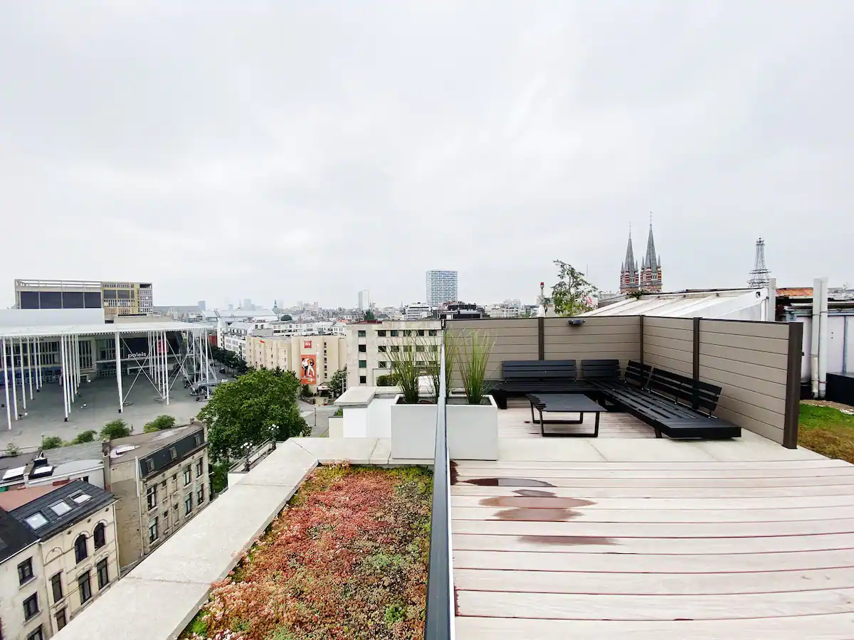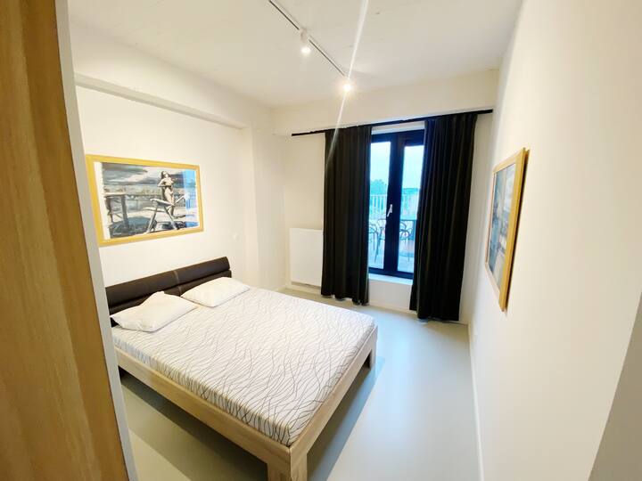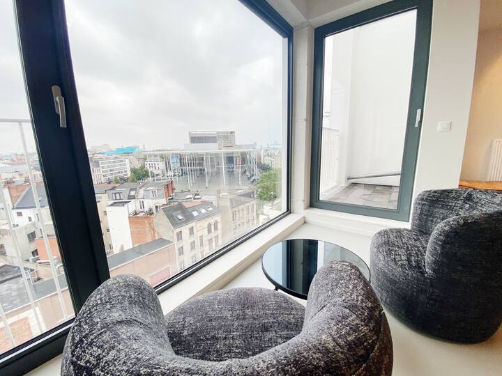 Theater is a luxury furnished apartment for rent in Antwerp. It is an exclusive apartment in Antwerp with a terrace. This apartment has two bedrooms. Both bedrooms have a double bed and closet space. The bathroom has a walk-in shower and a washing basin. The toilet is separate. The kitchen is fully equipped and has everything that you may need. Time to bring out your cooking skills! The kitchen is open and is located in the same area as the living room. There is also a dining table, ideal to host a dinner night with friends or family. The living room is spacious and bright. There is a comfortable couch and of course, a flat-screen TV.