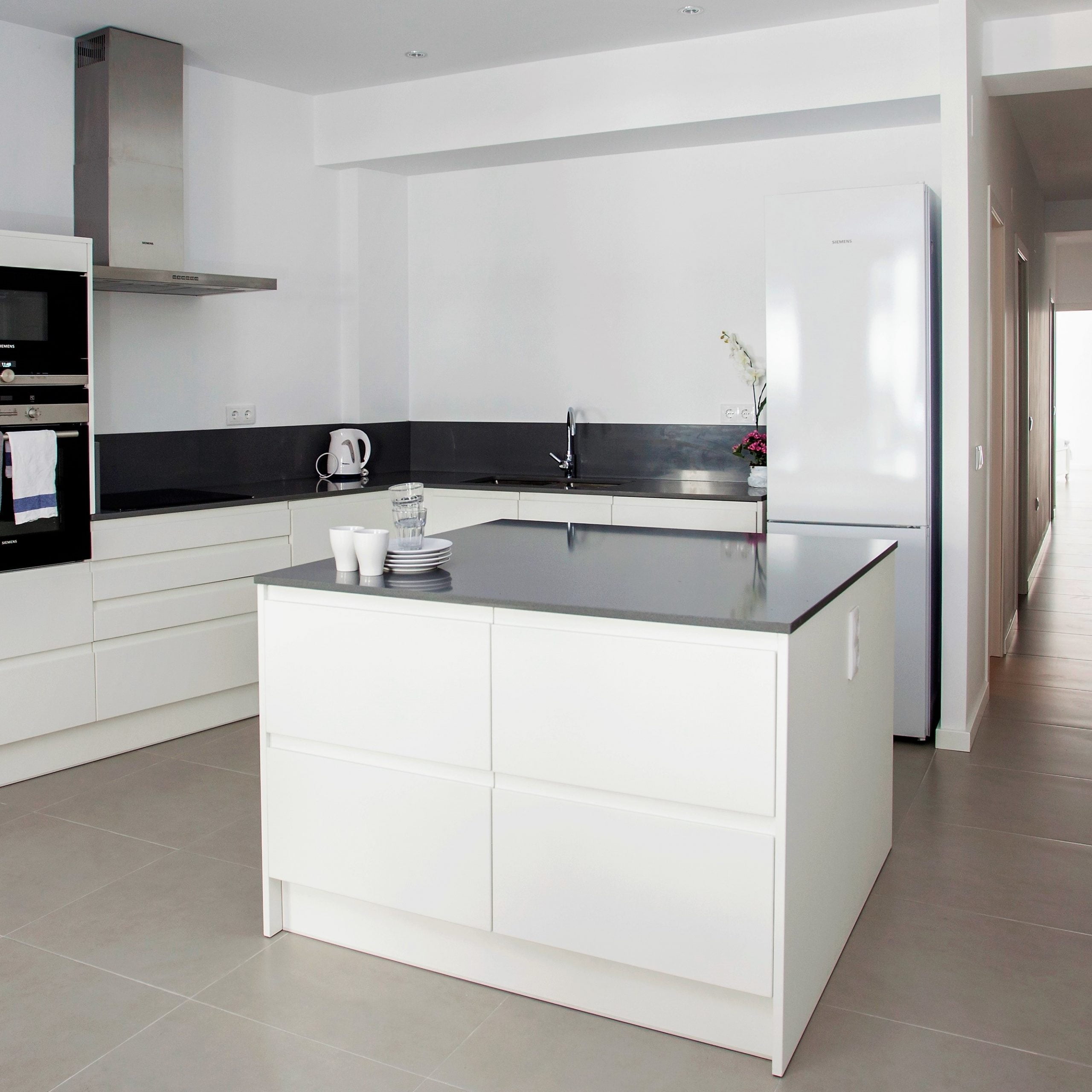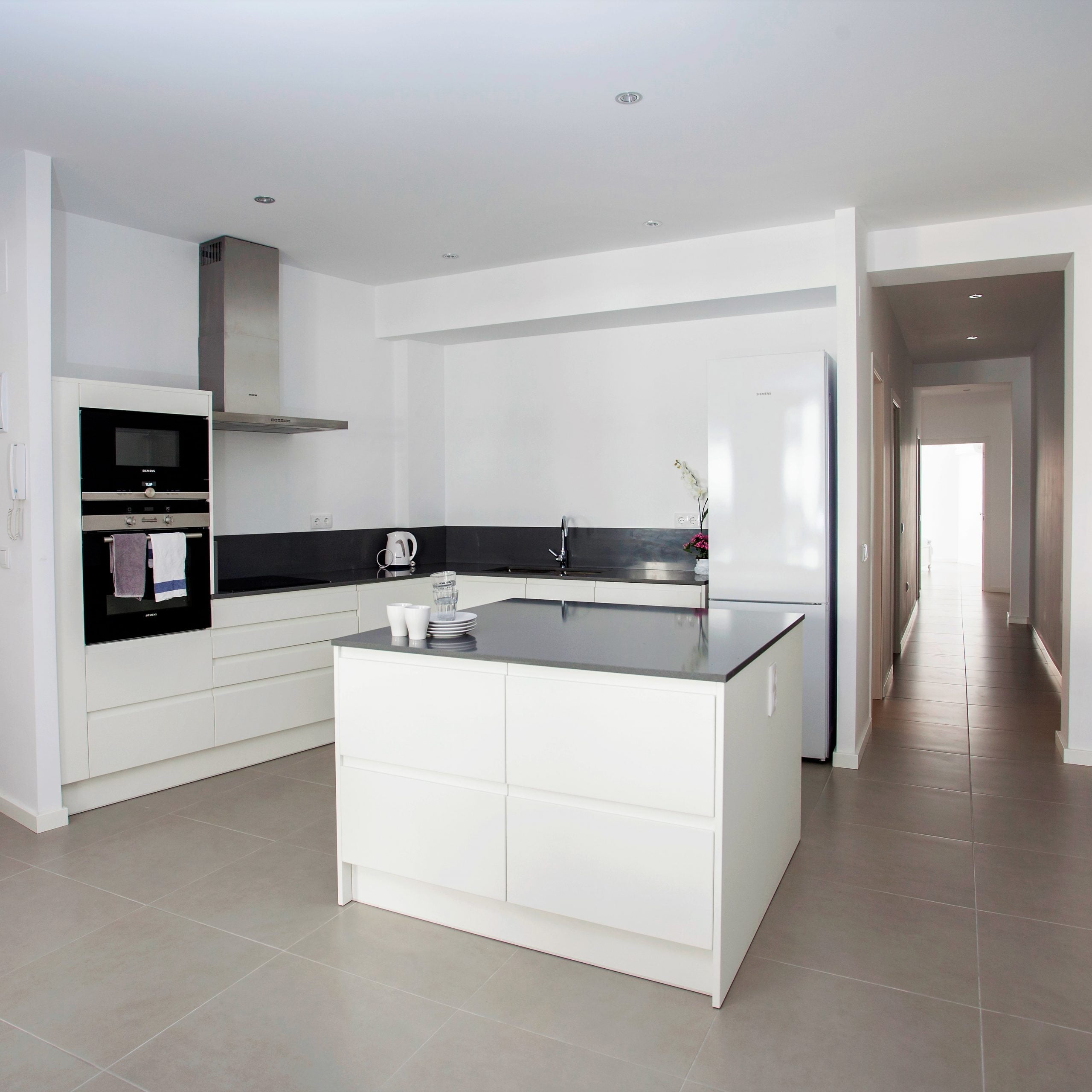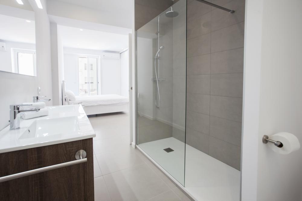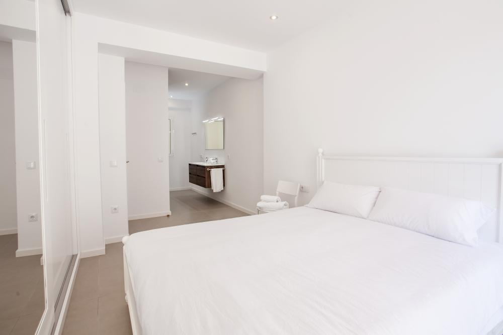 The layout of this apartment is unique to Spanish style apartments, you enter this apartment immediately in the living room and the open kitchen. The kitchen comes with a lot of counter space and an island. You will find ample storage space around the kitchen. The build-in appliances show a sleek design. The living room hosts a flatscreen TV with a comfortable couch. Adjacent to the living room, you will find the dining room that can sit up to six people. The living room gives access to the first balcony that overlooks the street in front of the building. The balcony is perfect to enjoy your breakfast while you see the city waking up and getting ready for the day.