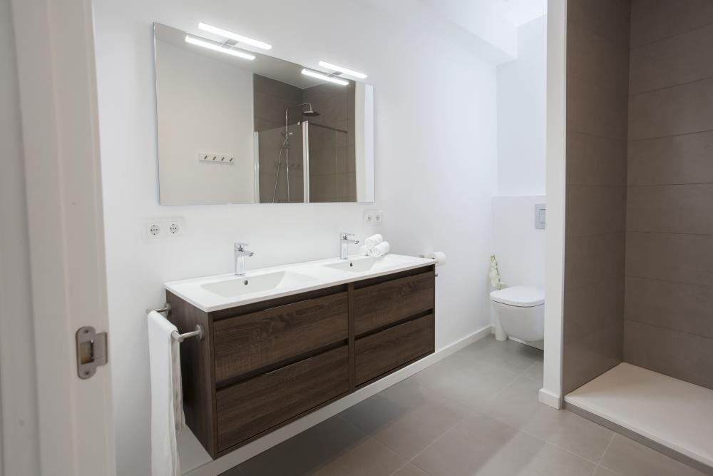 Walking through the corridor you will find the guest toilet, conveniently located close to the community space and the guest bedroom. The first guest bedroom is equipped with two single beds and comes with hotel-quality bed sheets. On the other side of the first bedroom, you will find the full guest bathroom with toilet, his and hers sink and walk-in shower. At the end of the corridor, you will find the second guest bedroom that is equipped with a double bed and hotel quality bed sheets. Your guests will not want to leave.