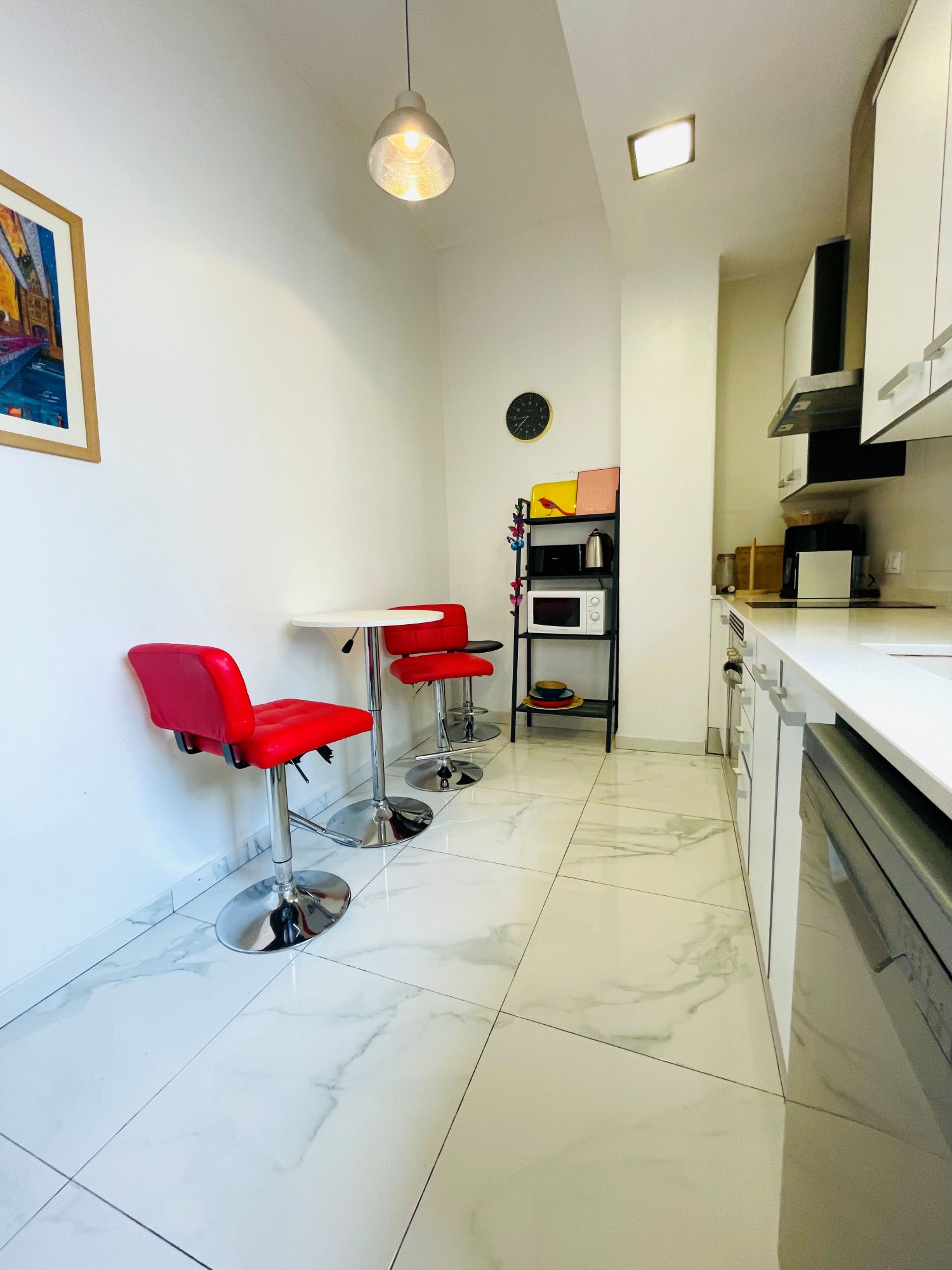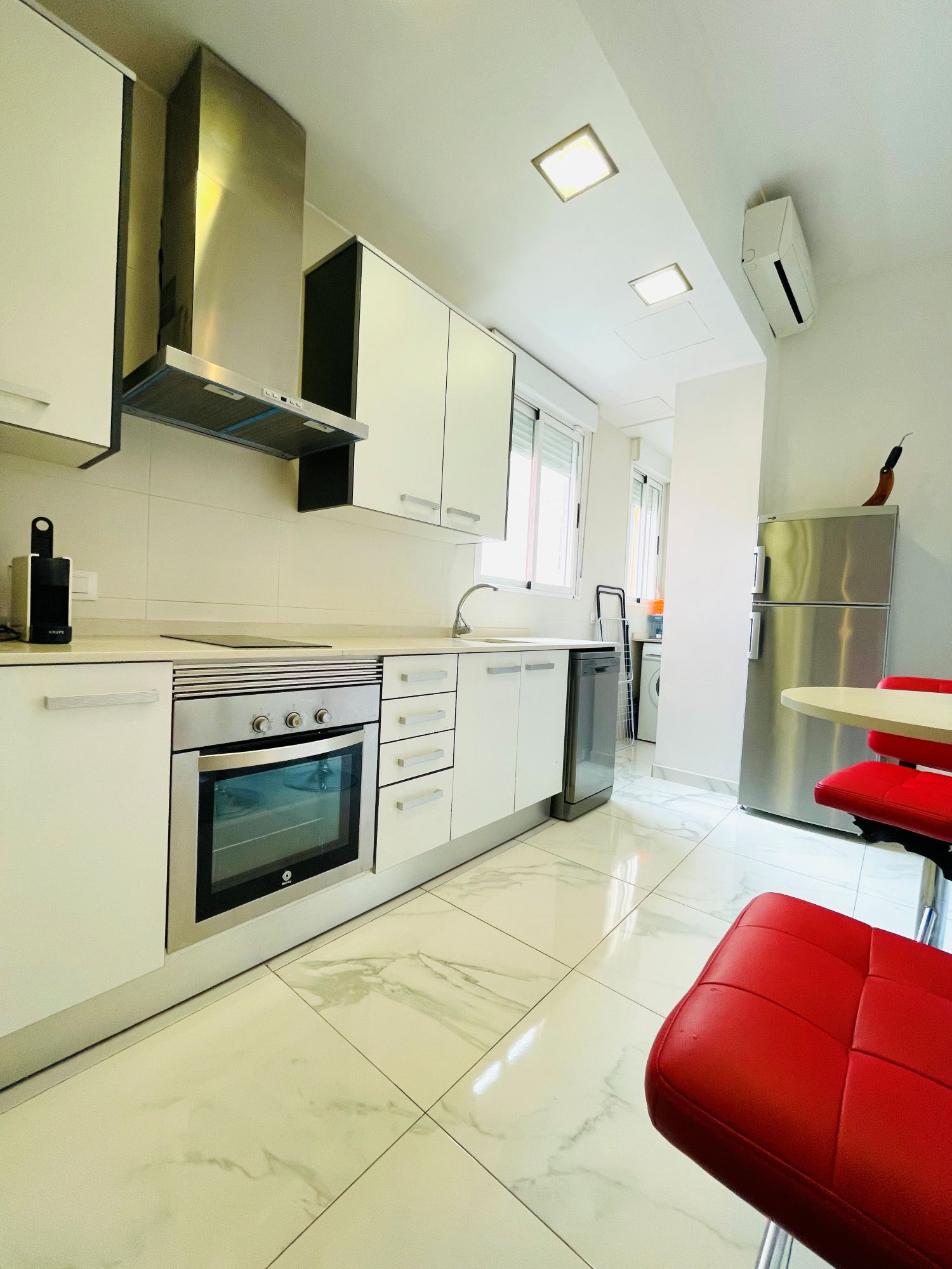 The kitchen of this place is modern and fully equipped. It has a dishwasher, oven, everything that you may need. It comes with a small table with two chairs. Also you will find the ac in the kitchen which will serve the whole apartment.