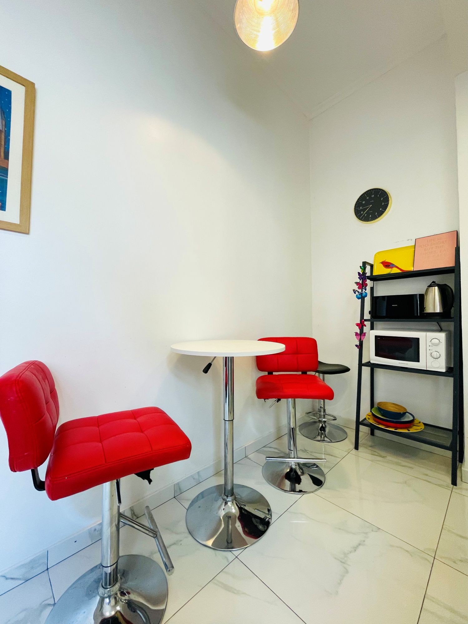 The living room is spacious and bright. There is a small dining table with three chairs, ideal to eat your home cooked meals. The living room also comes with a comfortable couch, Tv and chair. This is the perfect spot to relax on the weekends. From the living room you also have direct access to the balcony. The balcony comes with a table and chairs as well. Ideal to enjoy your morning coffee.