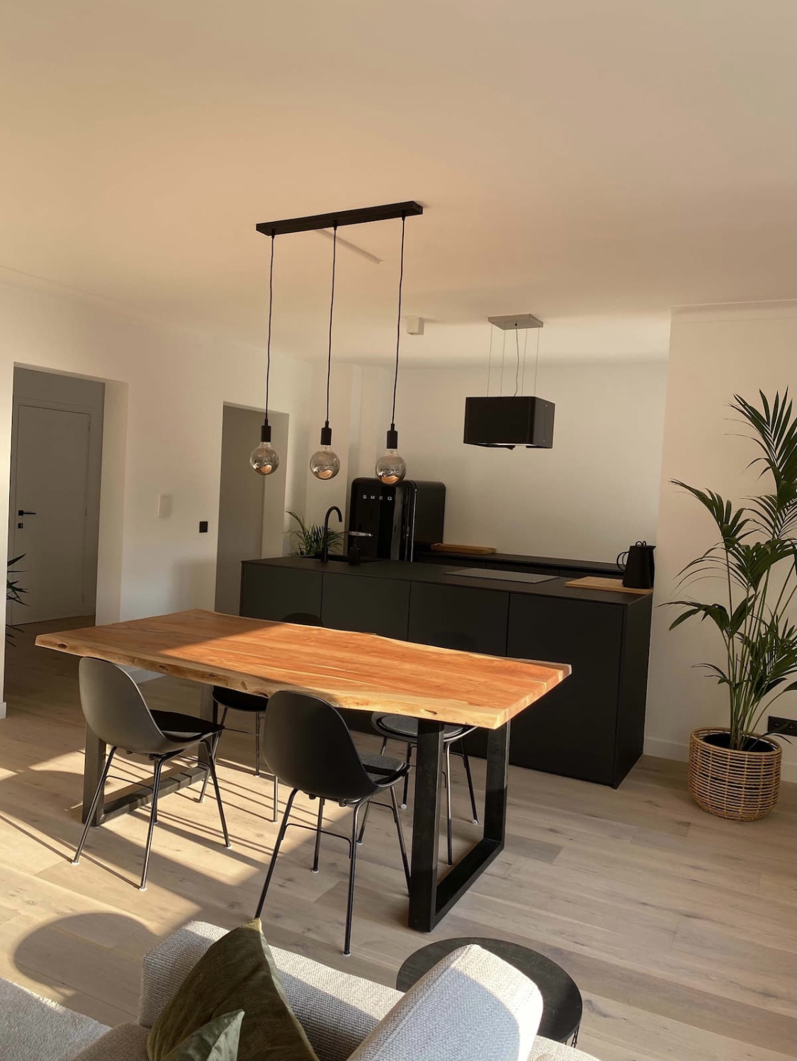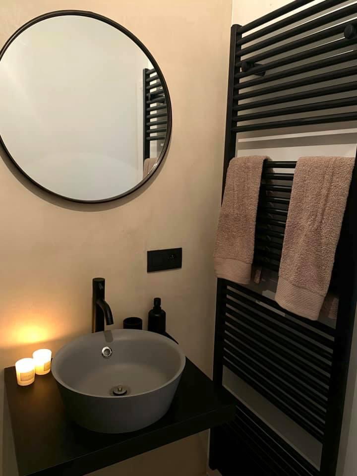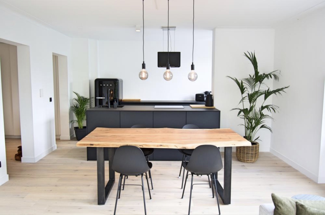 The trendy open kitchen is equipped with a built-in oven and dishwasher, induction hob, design cooker hood and a matt black sink with ditto tap. Behind the kitchen island, there is an extra worktop with more storage space & equipped with a modern SMEG fridge. The trendy and qualitative furniture creates a modern and luxurious look, with the necessary homely atmosphere.