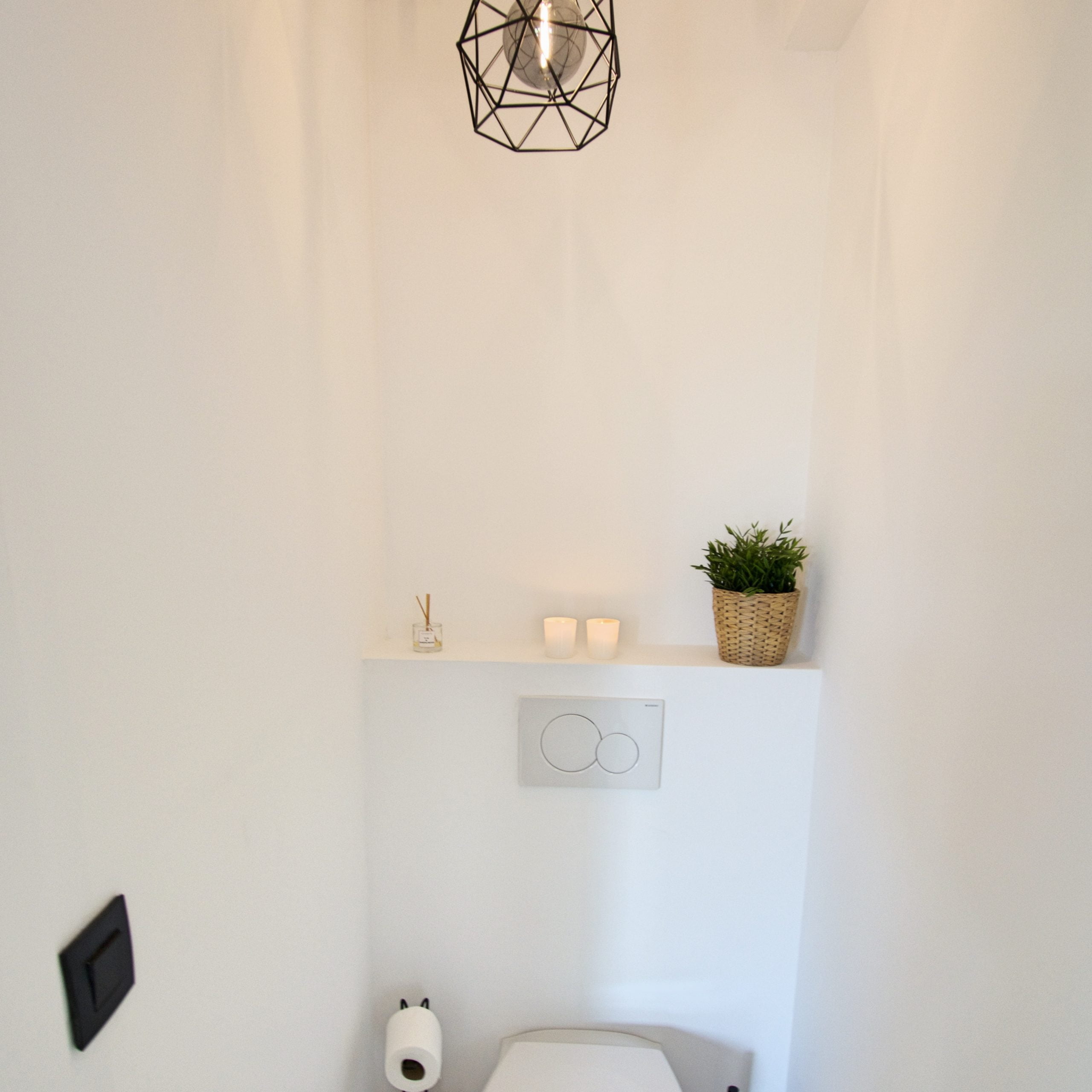 The hall has built-in closets where you can find the washing machine and dryer. The toilet is located next to the entrance, is very easy to maintain thanks to the Geberit hanging model and is equipped with mechanical ventilation. The spacious living room with fully equipped open plan kitchen enjoys lots of natural light thanks to the large and numerous windows. The use of light and earthy colours further enhances the feeling of space.