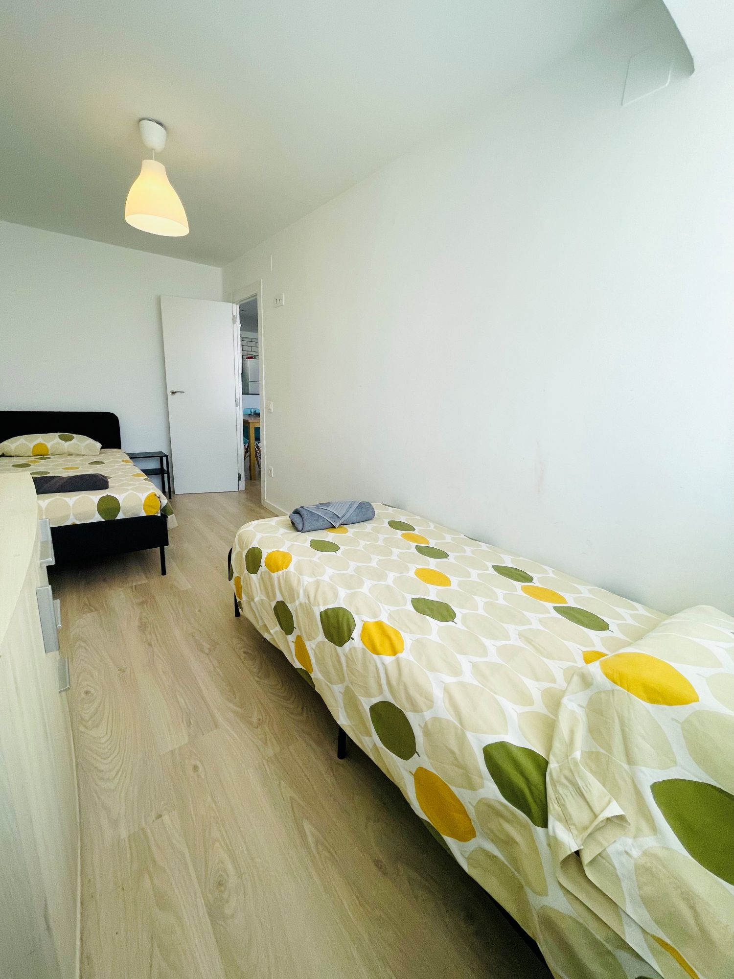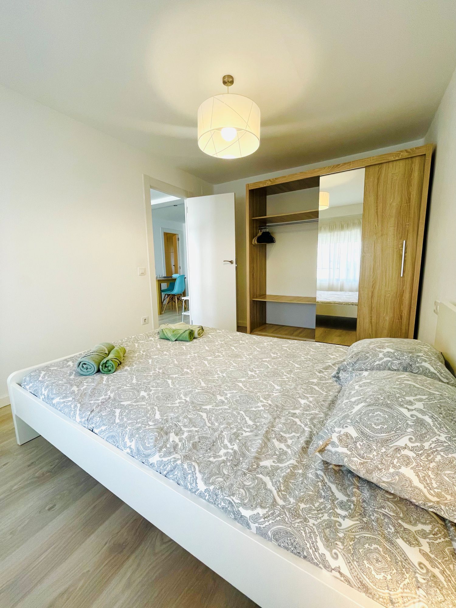 The rental for expats is located on the second floor of a building with elevator. The main bedroom has a double bed, whereas the second one comes with two single beds. If needed, these can be put together to make it a bigger bed.