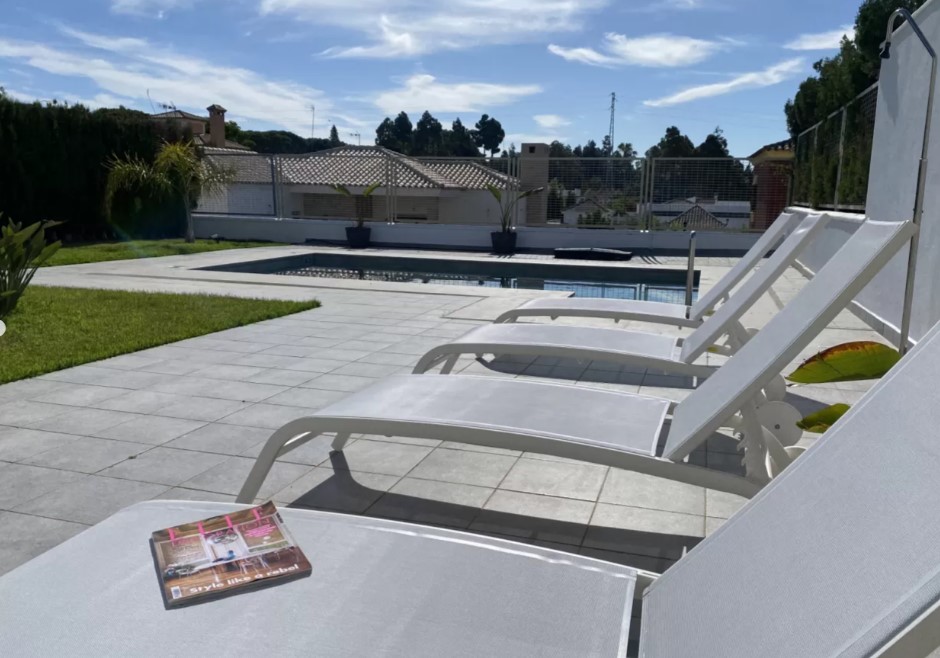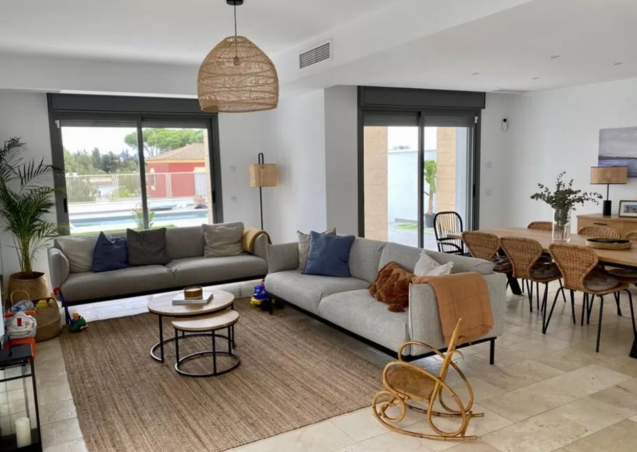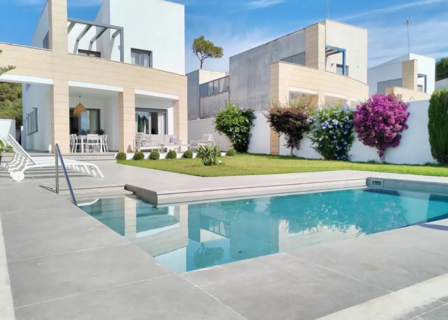 Discover unparalleled luxury and comfort in this stunning villa located on Calle Otoño in the serene town of Chiclana de la Frontera, perfect for expats, business professionals, and digital nomads seeking temporary housing. This fully furnished villa boasts modern and elegant architecture, offering a spacious and inviting living environment tailored for those working temporarily abroad. With four well-appointed bedrooms and three luxurious bathrooms, this property ensures ample space and privacy. The expansive lounge-dining area is perfect for relaxing and creating unforgettable moments with friends and colleagues. Large windows flood the space with natural light and provide panoramic views of the lush garden and sparkling pool, seamlessly connecting indoor and outdoor living.