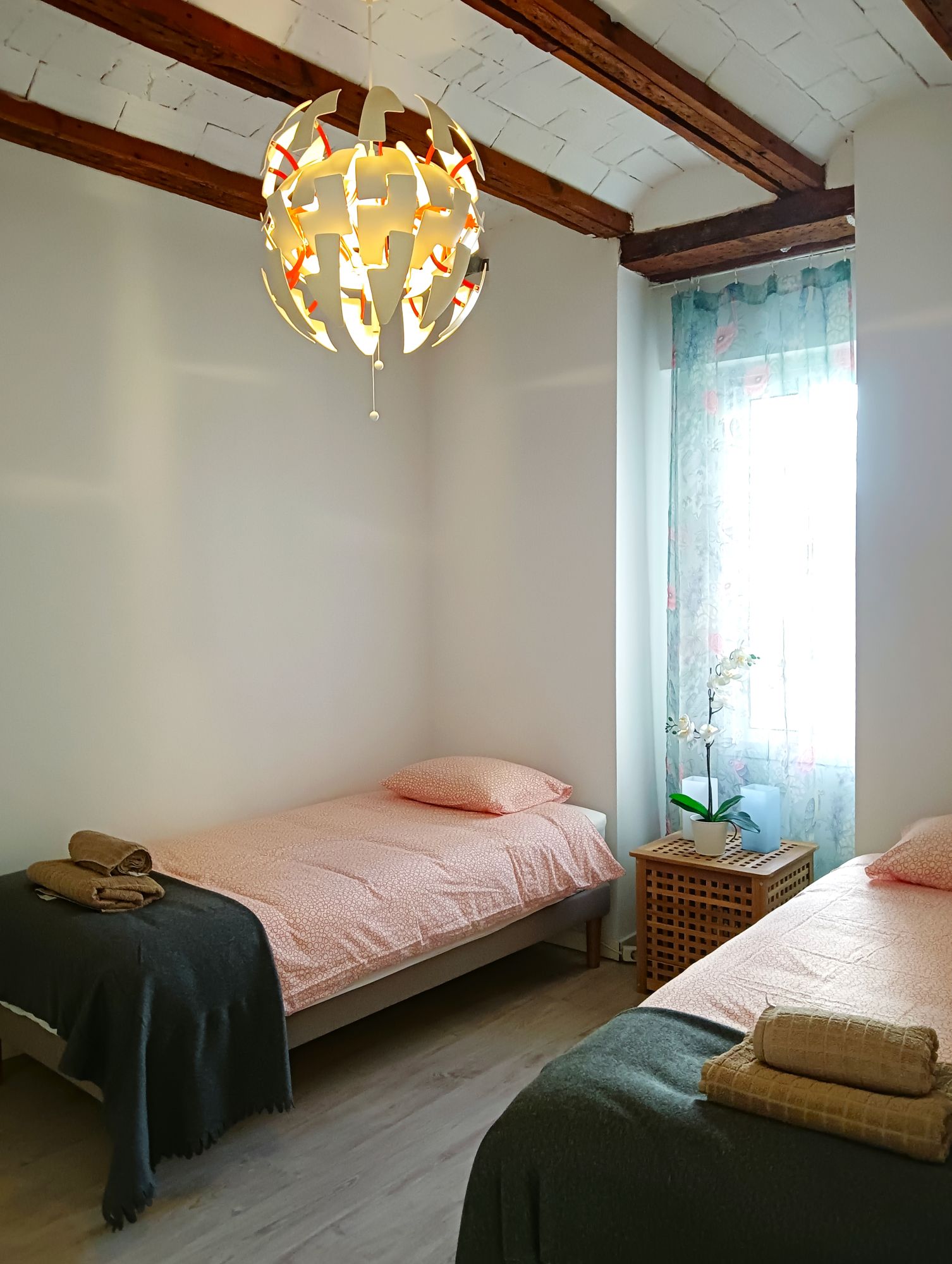 - 2 bedrooms (1 with double bed, 1 with 2 single beds)