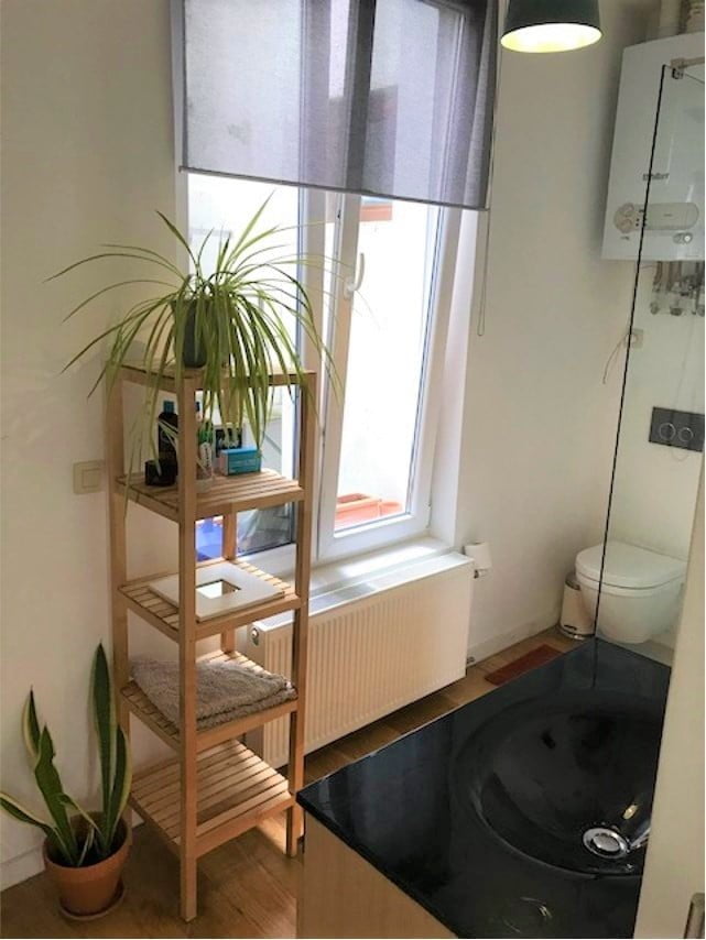 Volkstraat is an amazing rental flat in Antwerp for expats. It concerns a spacious bedroom with a double bed and lots of storage space, a bathroom with walk-in shower, wash basin and a toilet. The living room is lovely furnished with quality couches, a TV, a carpet, lots of plants,... There is also a dining area with an amazing wooden table, which gives character to the whole room. The kitchen is a beautiful open kitchen and is fully equipped. The large windows throughout the flat provide lots of natural light. The wooden floors and high ceilings give this flat a great atmosphere.