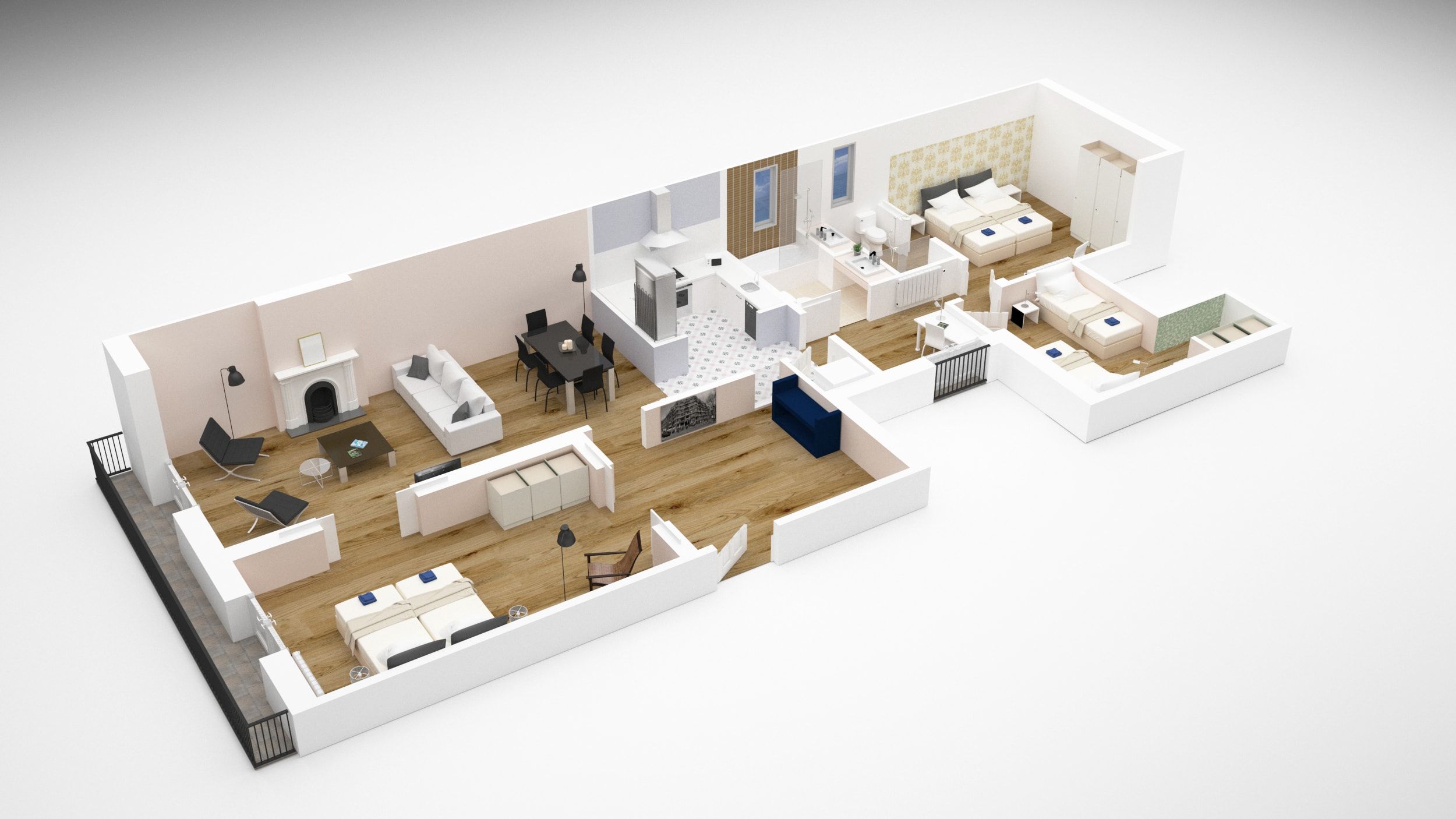There are 3 bedrooms, two of them have a double bed and the other has two single beds. The bathrooms have a shower, sink and toilet.