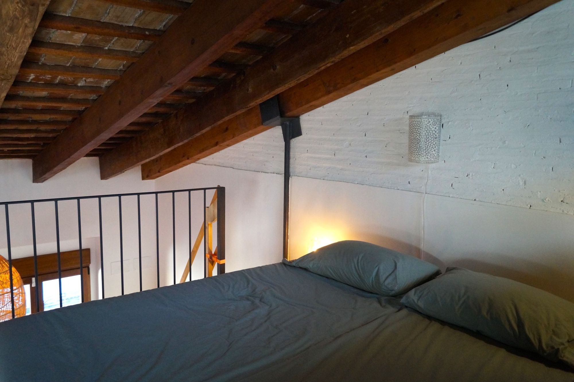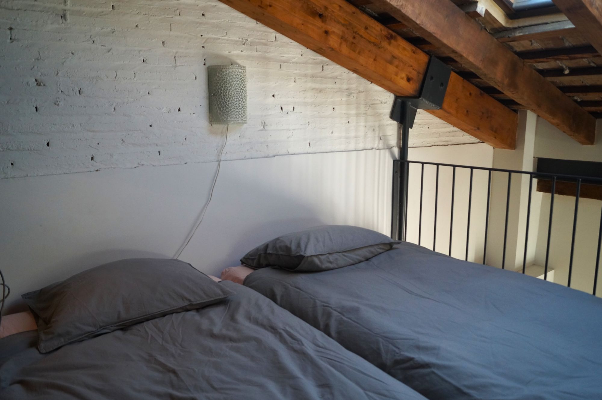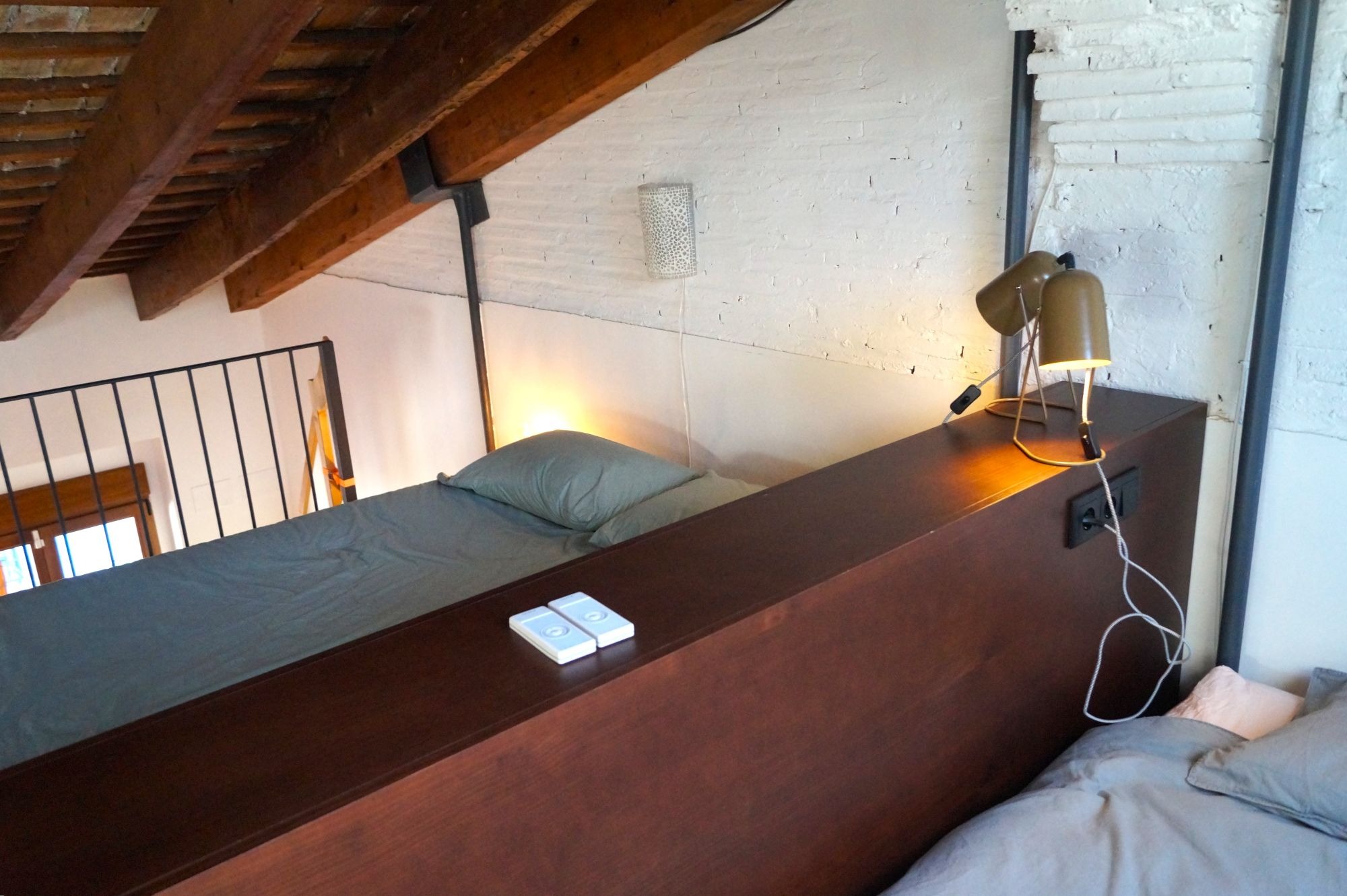 A cozy mezzanine bedroom sits above the main space with one double bed and two single beds placed side by side—ideal for a couple and occasional guests, though without privacy due to the open-plan layout.