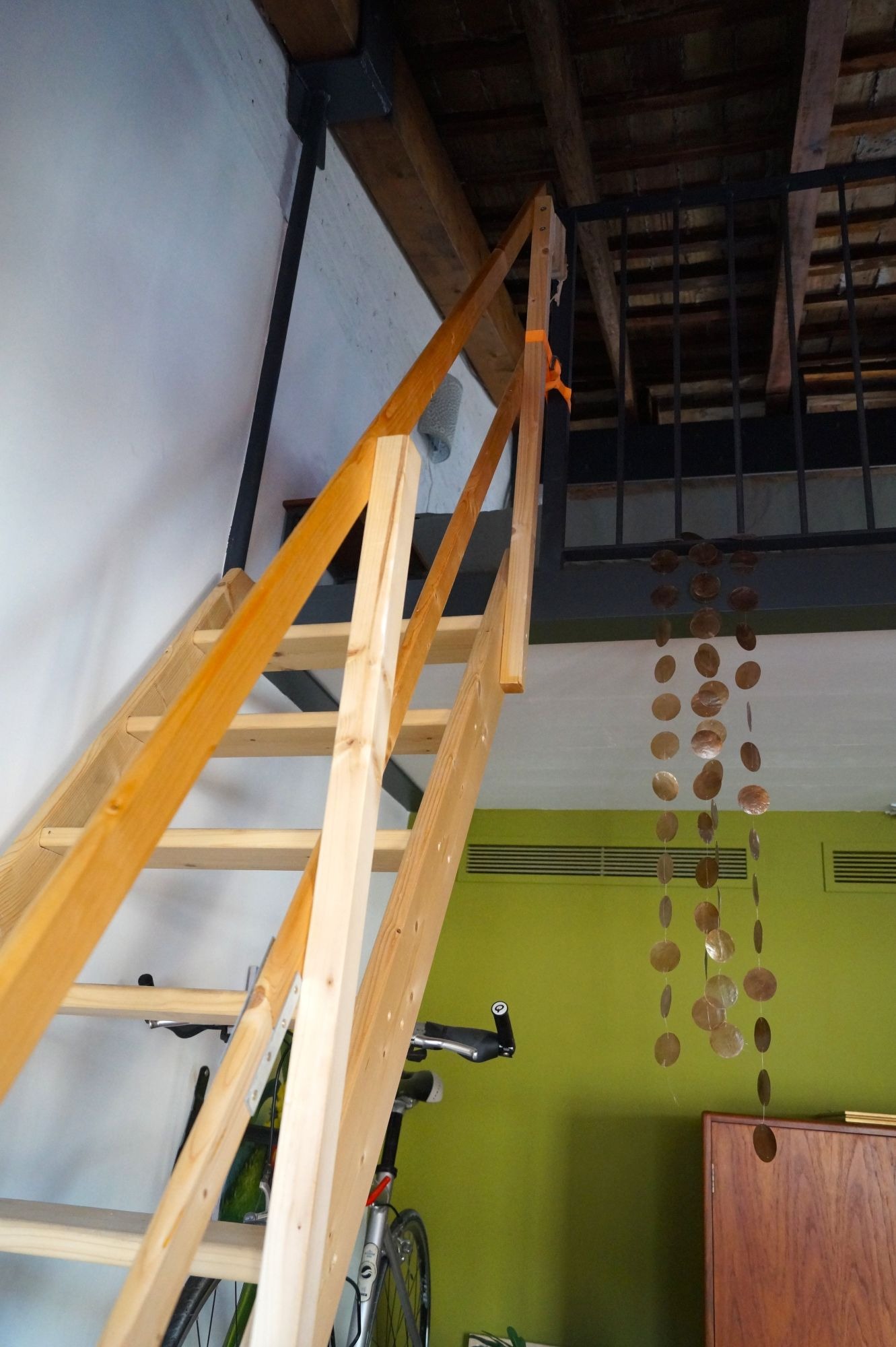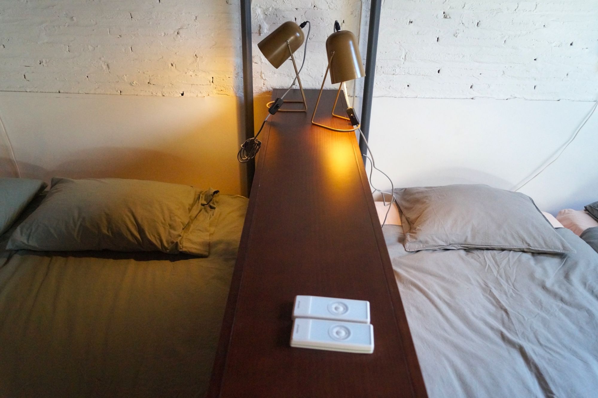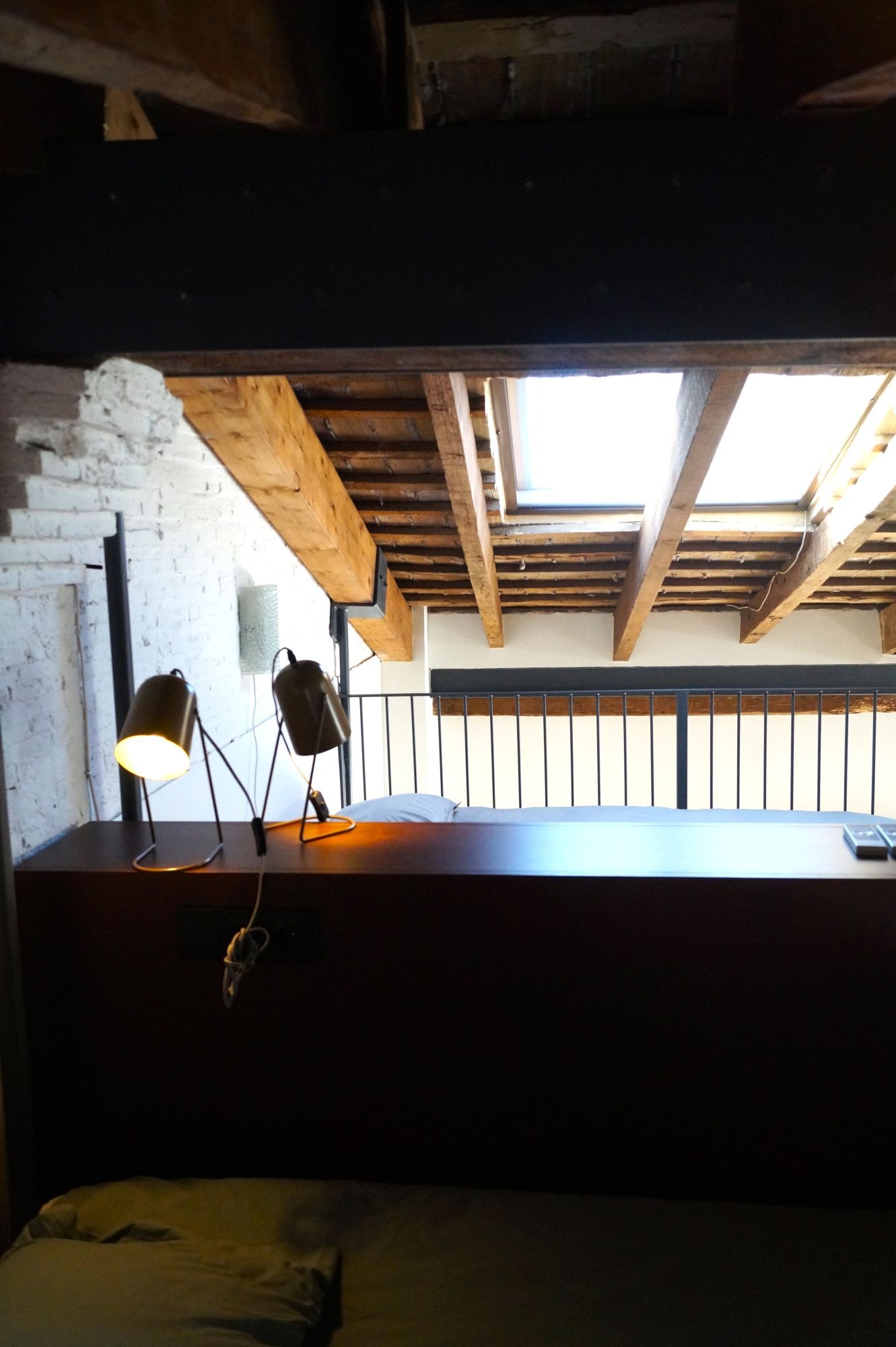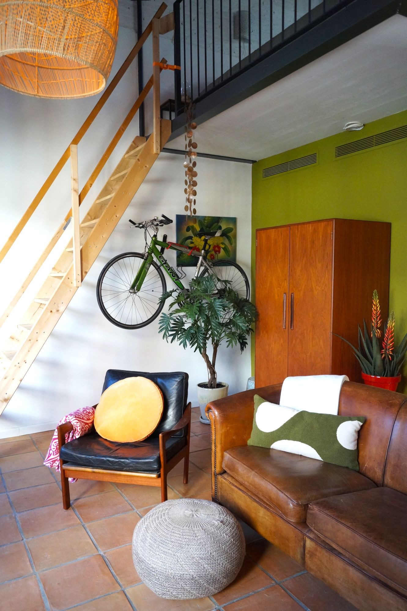 A cozy mezzanine bedroom sits above the main space with one double bed and two single beds placed side by side—ideal for a couple and occasional guests, though without privacy due to the open-plan layout.