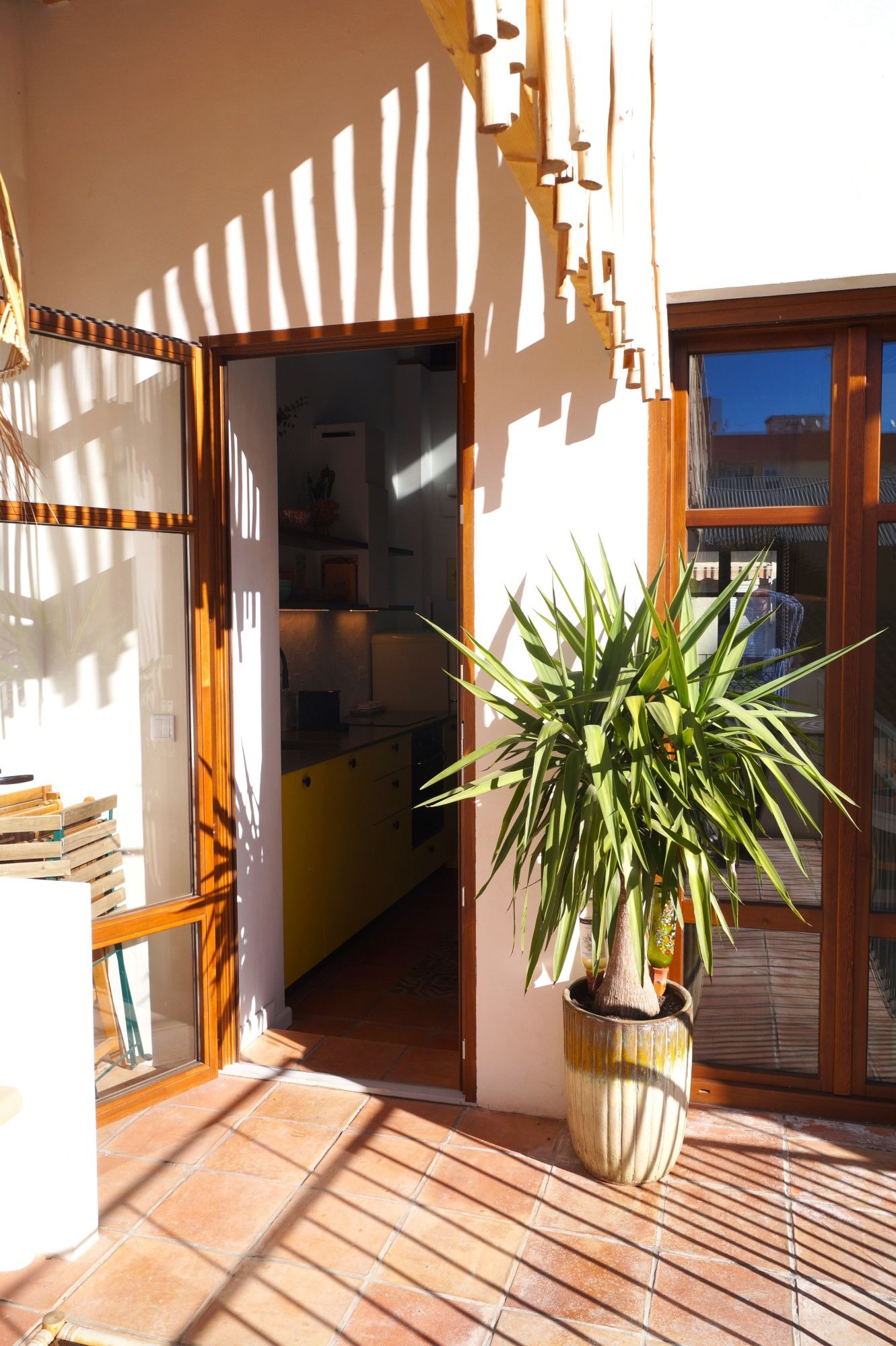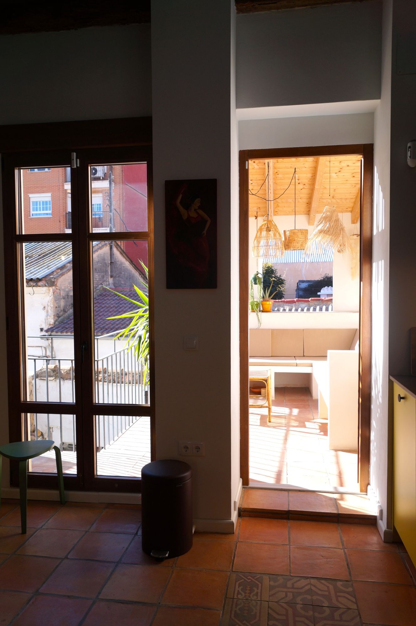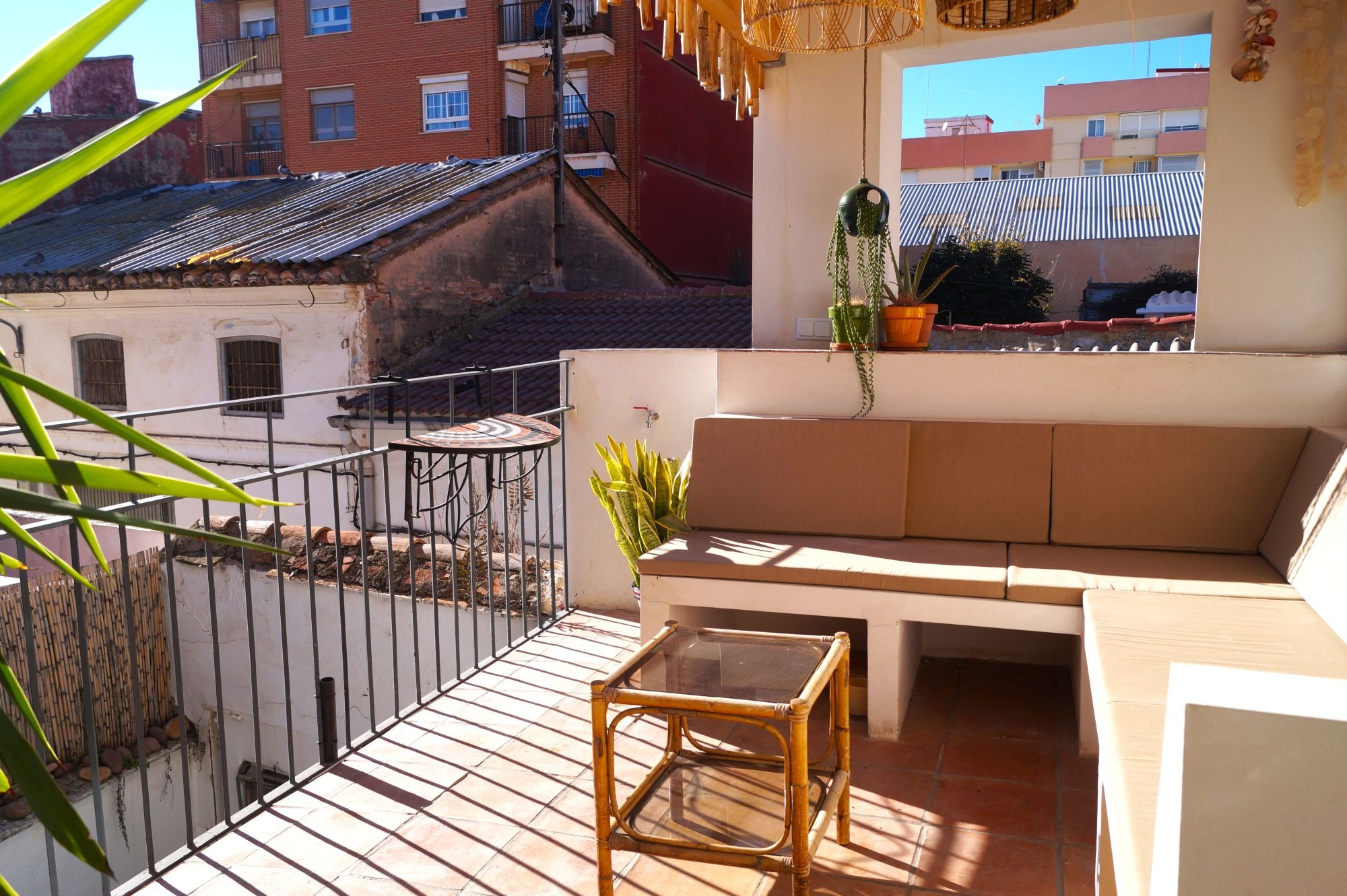 The fully equipped kitchen includes a microwave, oven, and coffee machine, leading into a bright dining room and the highlight of the apartment: a sun-drenched terrace with a lounge area and potted plants, offering picturesque views over the rooftops of Cabanyal.