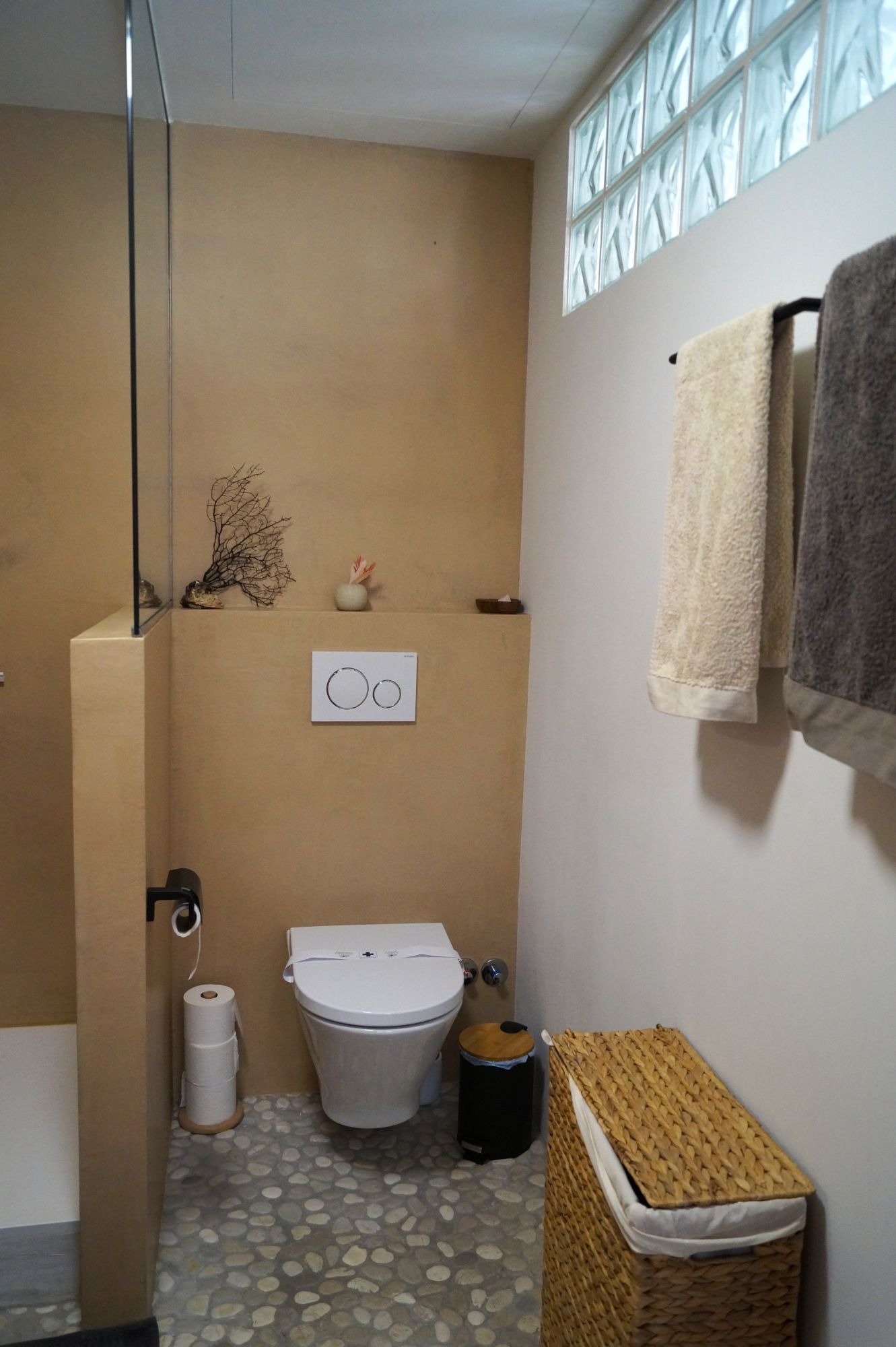 Located on the first floor (no elevator) and accessible via a steep, typical staircase, the apartment offers tranquility with only one neighbor next door and no one above or below. The living space is open and luminous, enhanced by floor-to-ceiling windows and automated blinds, creating a warm and welcoming atmosphere throughout. The spacious living room includes a comfortable sofa and TV, ideal for relaxing after work.
