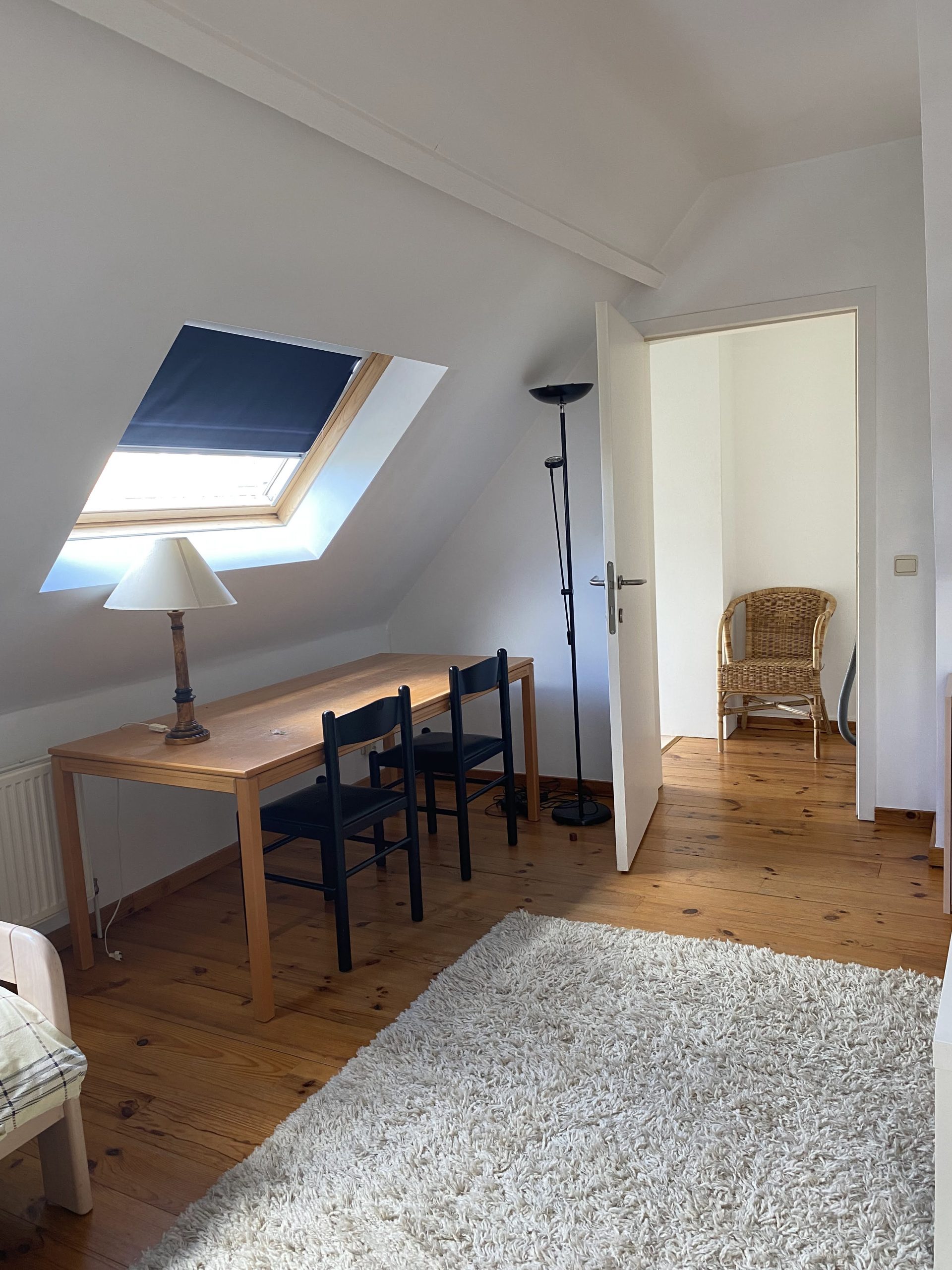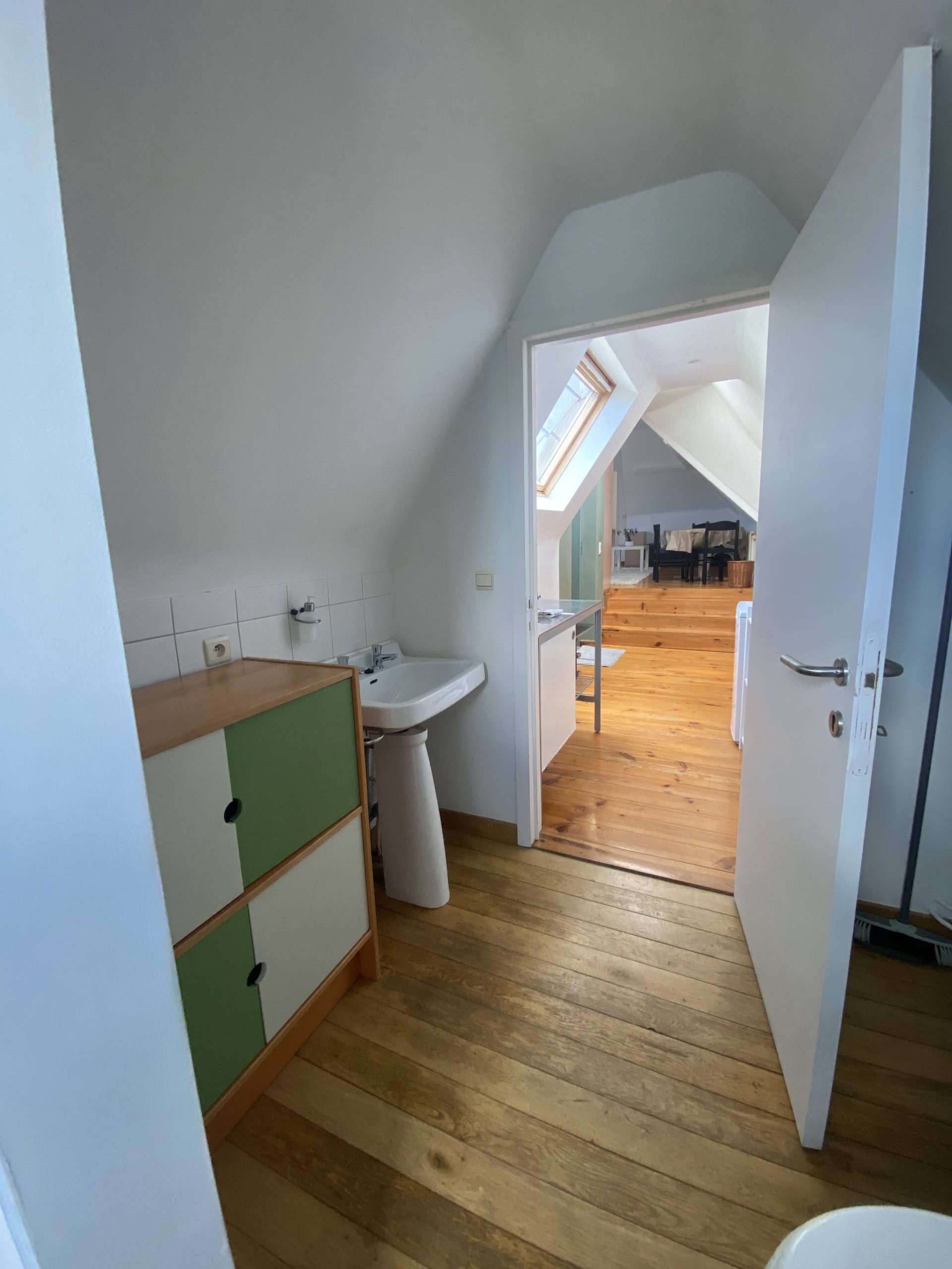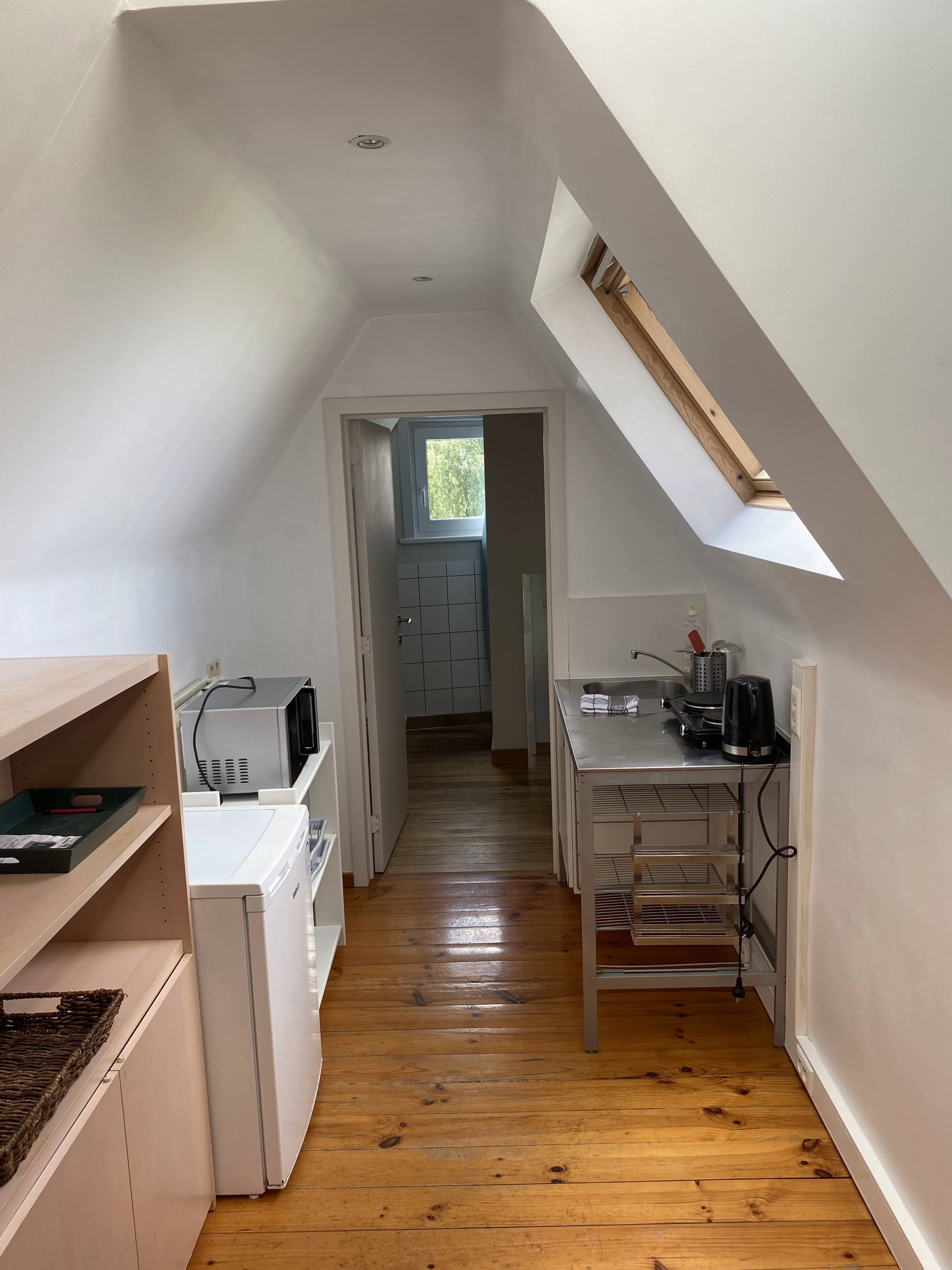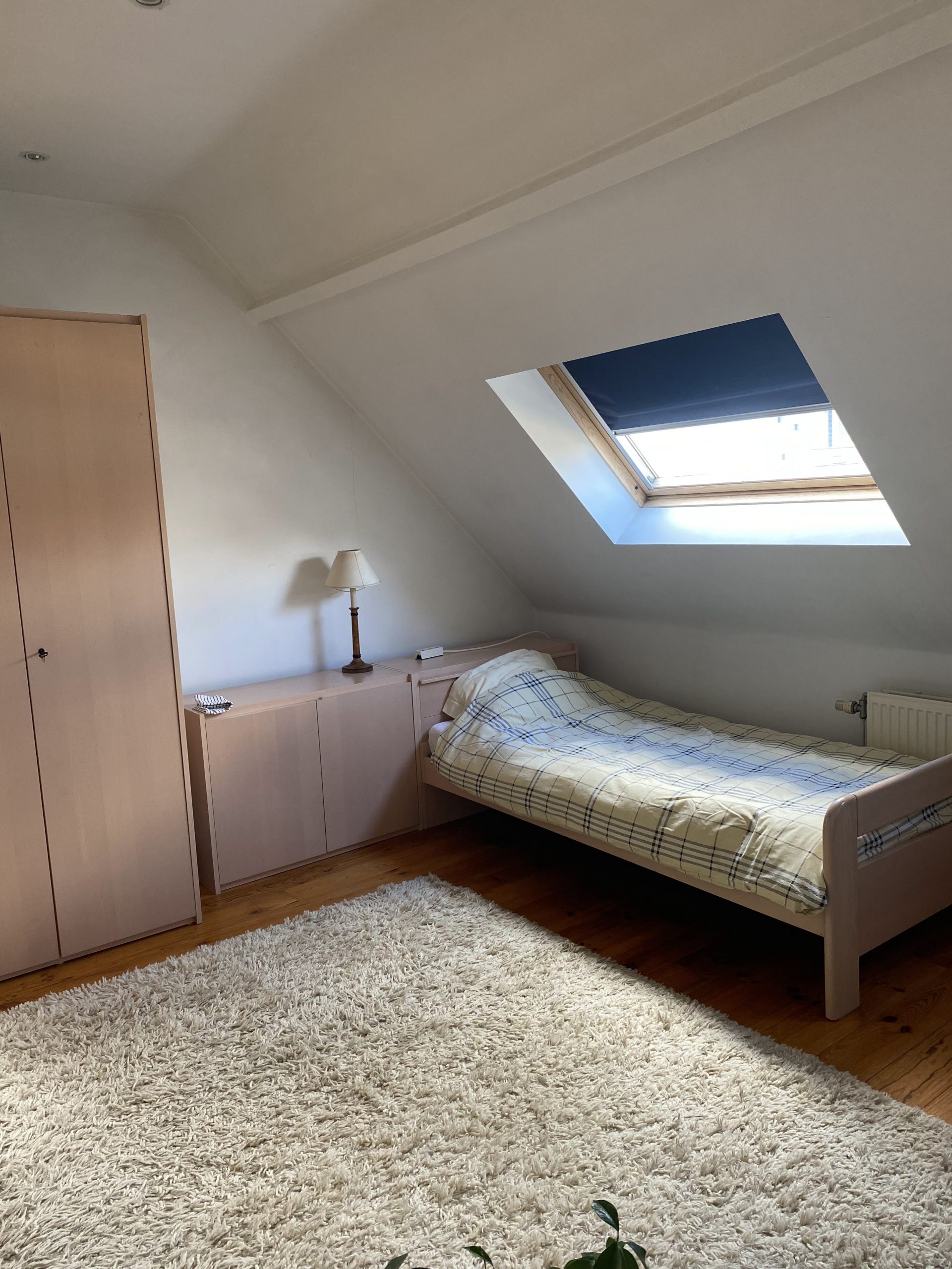 This is a monthly rental in Ghent. It has one single bed and the bathroom with shower. As a studio, all is in the same space, basic kitchen, living and dining room.