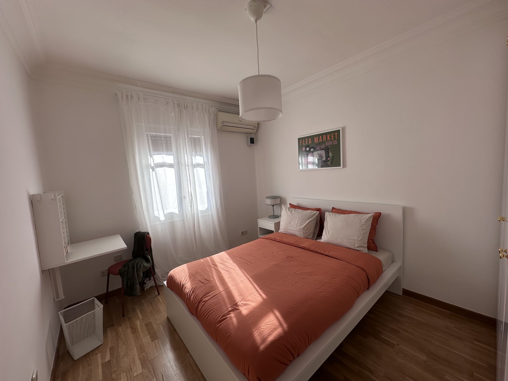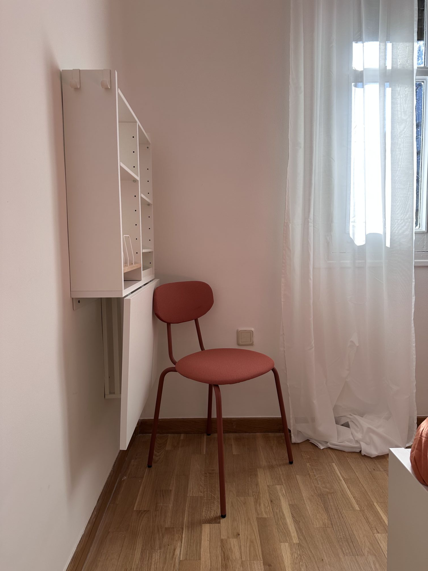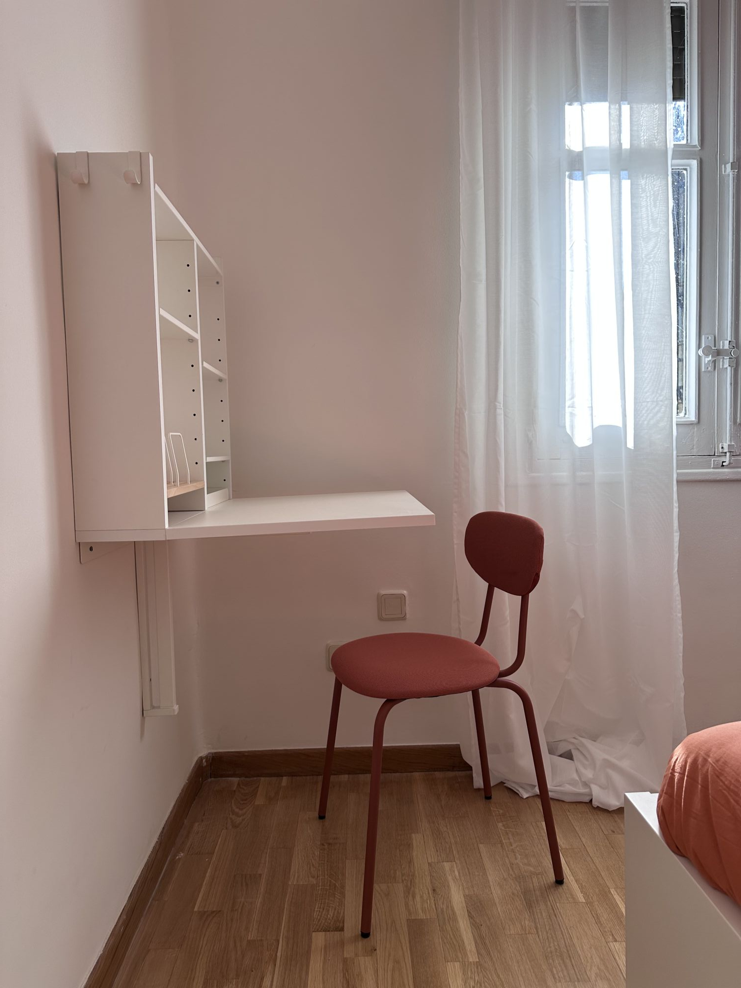 The Prado Room is designed for a longer stay, and comes fully furnished with a 140x200 bed, bedside table, storage space, desk, AC, heating, and a window with natural light and urban views.