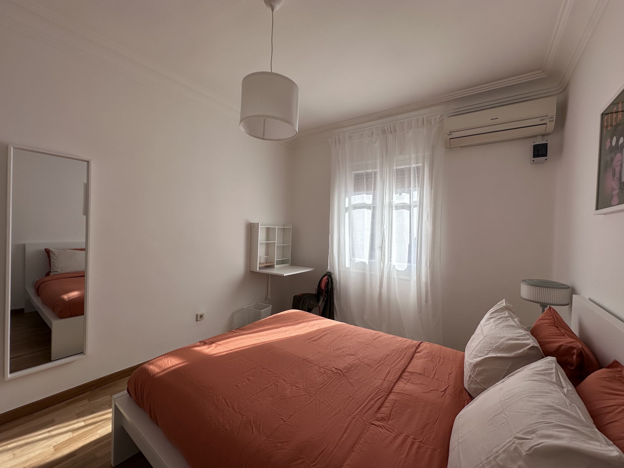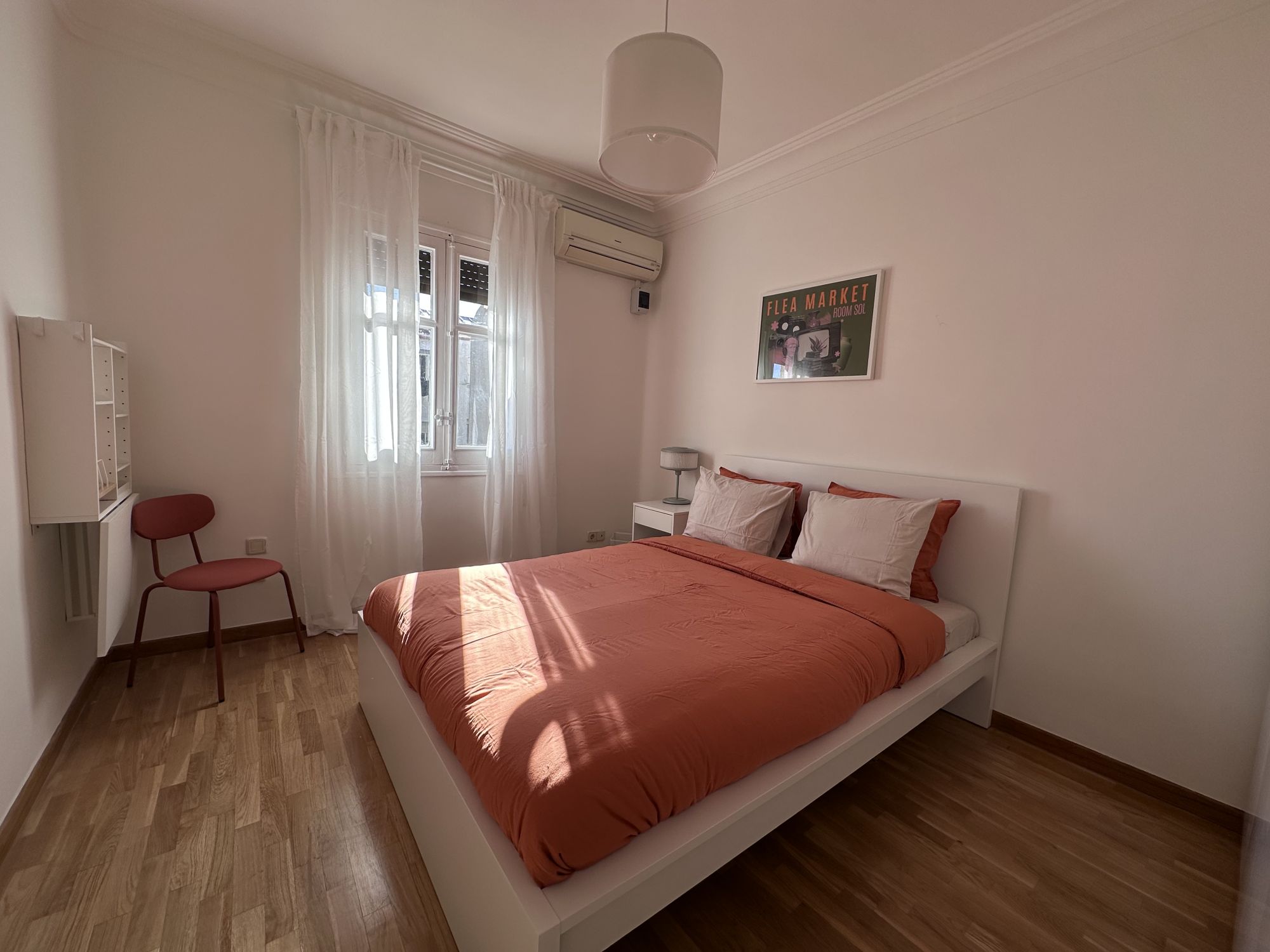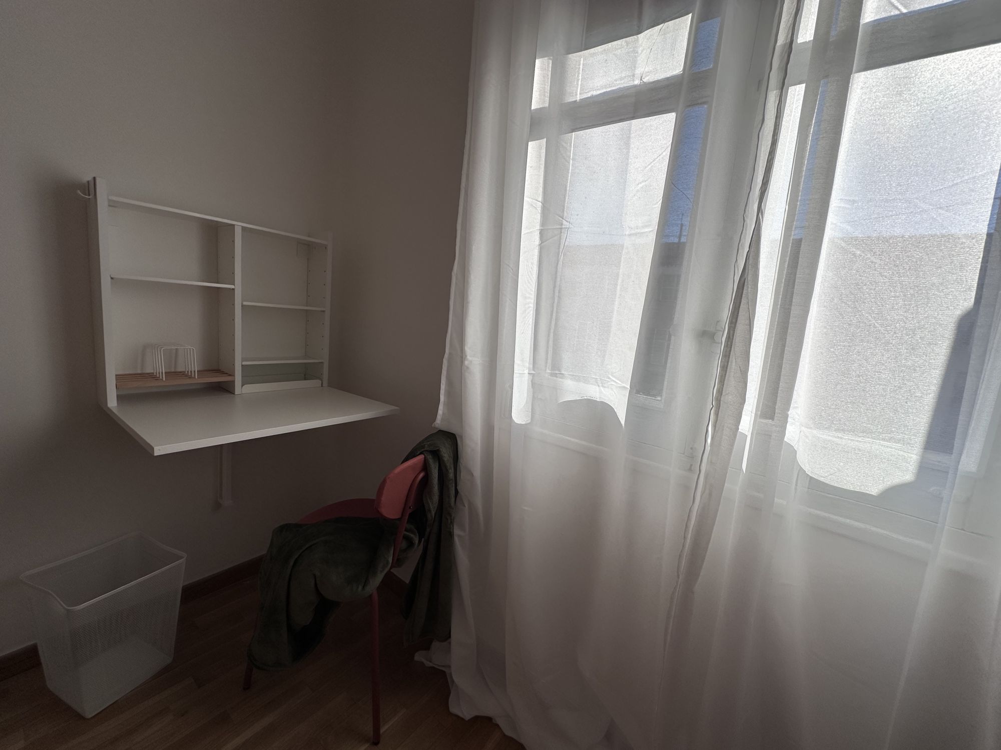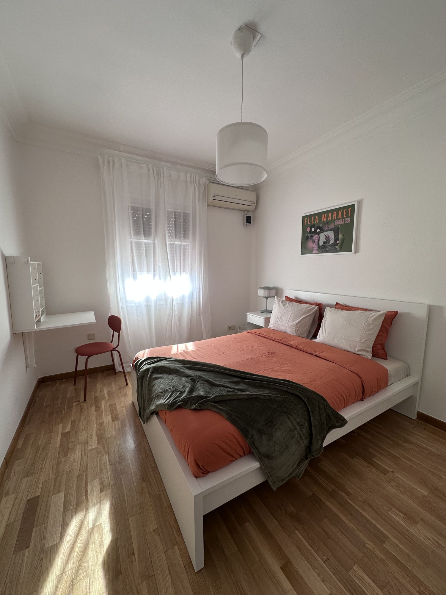 The Prado Room is designed for a longer stay, and comes fully furnished with a 140x200 bed, bedside table, storage space, desk, AC, heating, and a window with natural light and urban views.