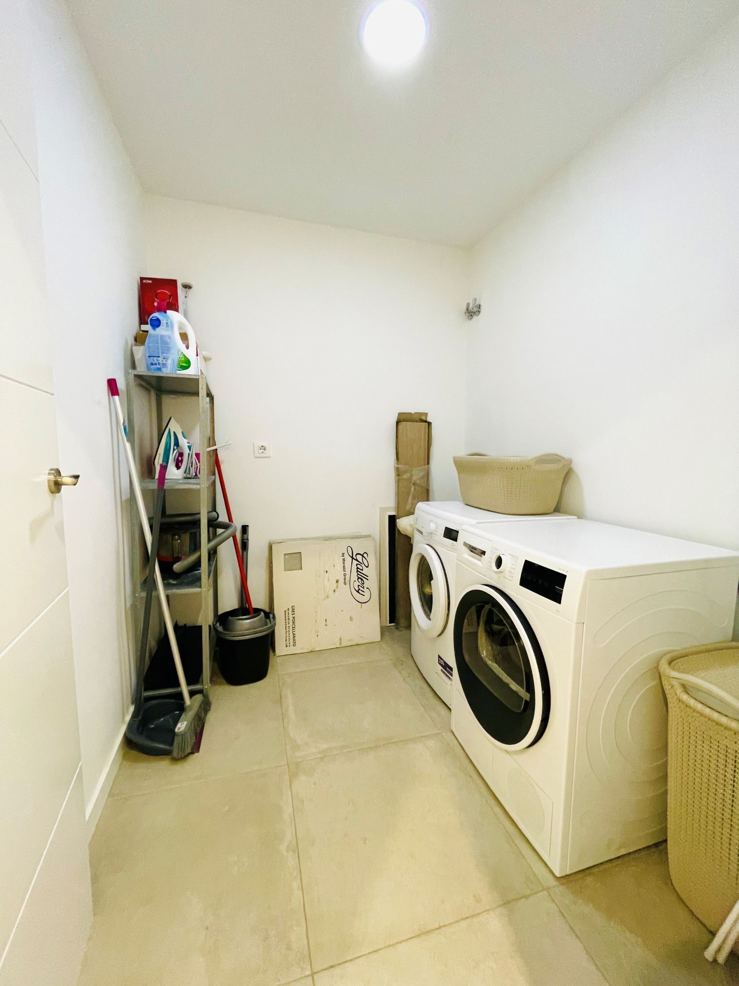 One of the two bathrooms comes with a double sink which is very convenient when you have a full house. The second bathroom is a cosy space with a walk-in shower, sink and toilet. The separate laundry room has a washer and ample space to dry your clothes.