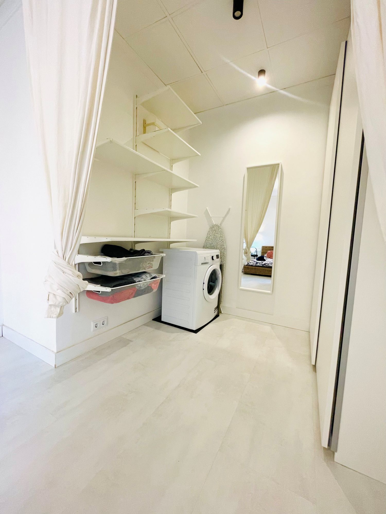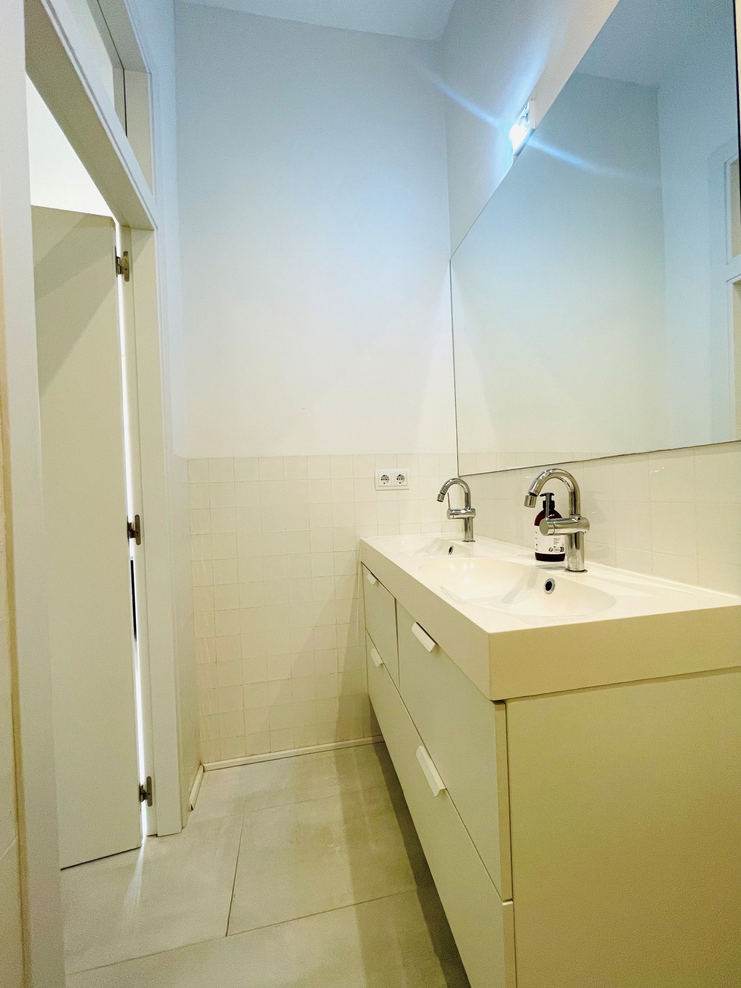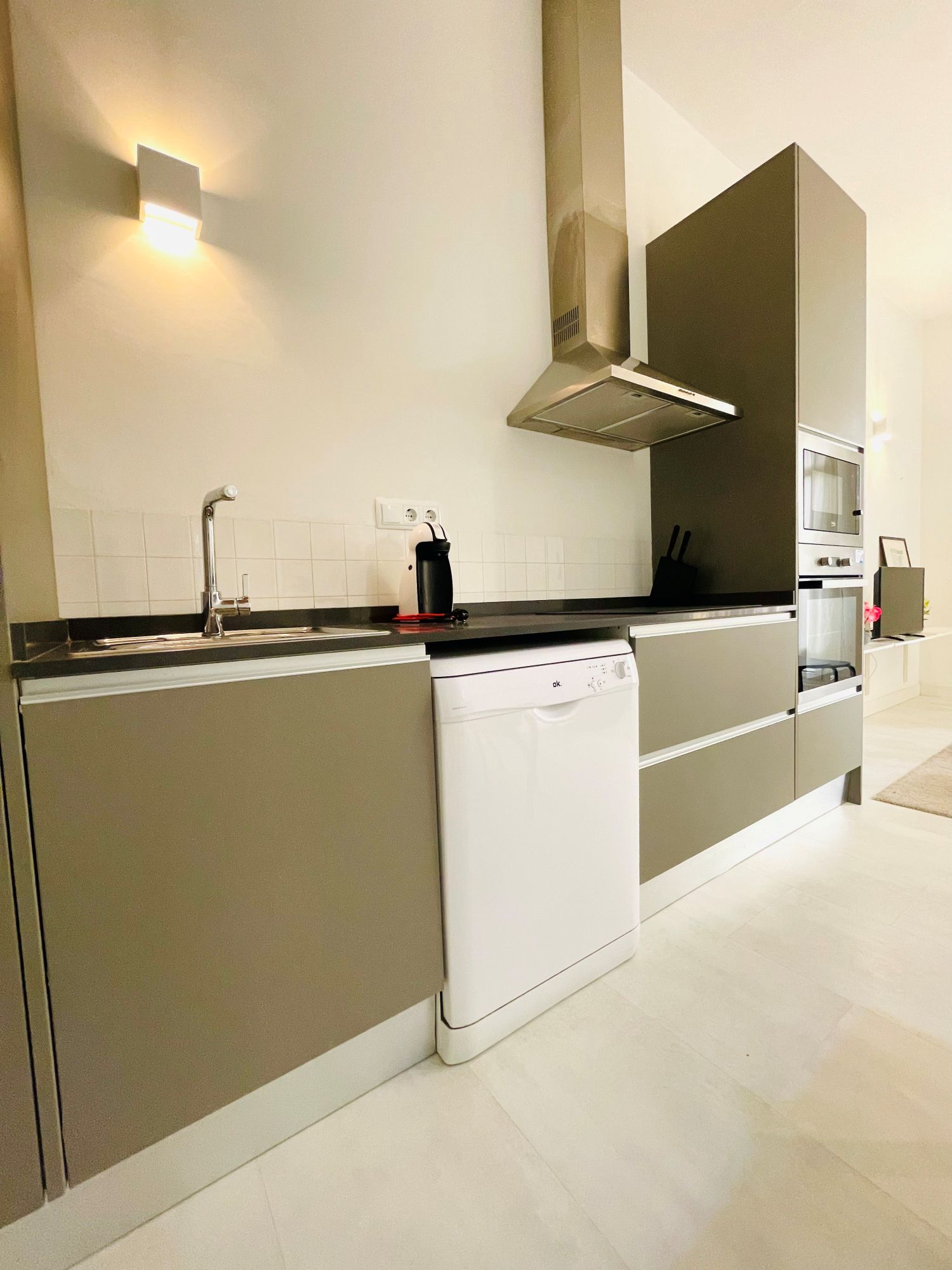 Upon entering this spacious apartment, you will notice immediately the high ceiling that gives you a great feeling of space. The living room has a very comfortable couch with a flatscreen TV. The shelf mounted to the wall, blends in perfectly with the design of the apartment and leaves plenty of space when you bring your own entertainment devices.