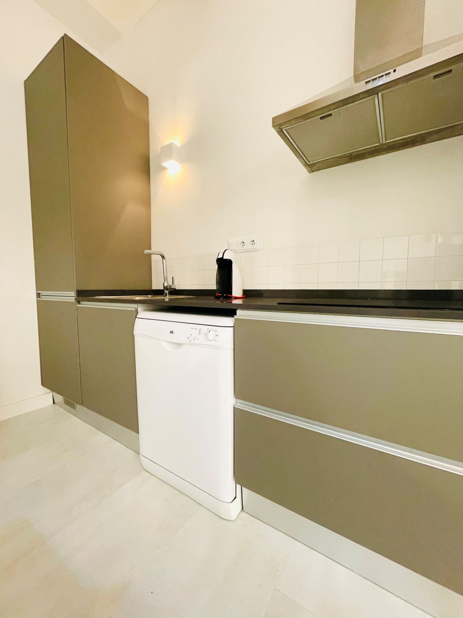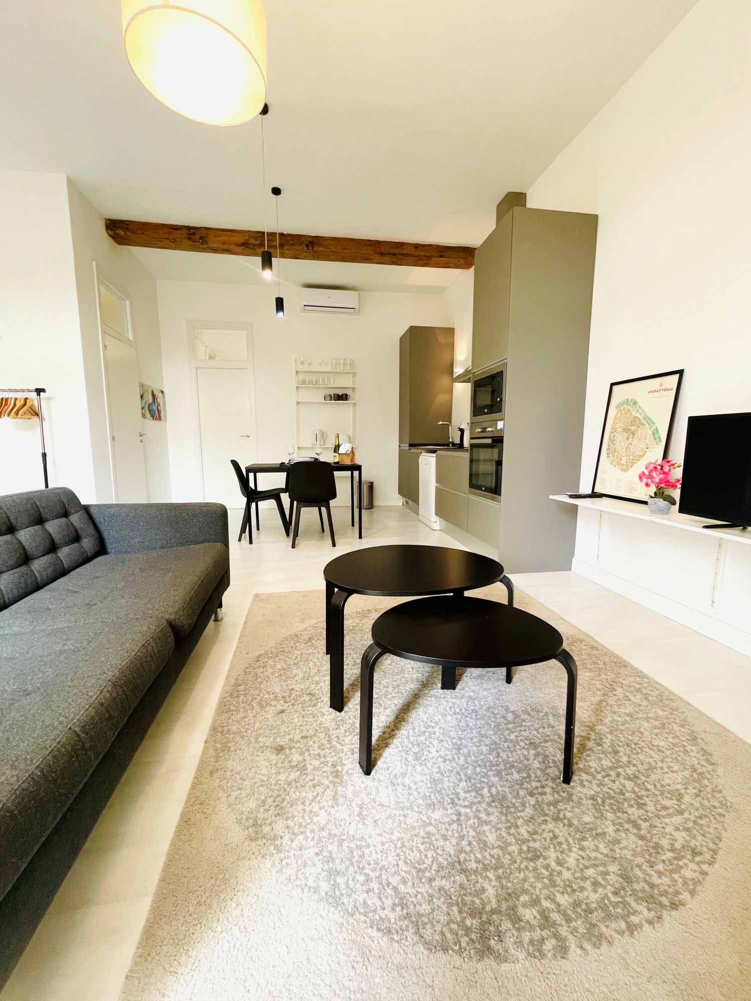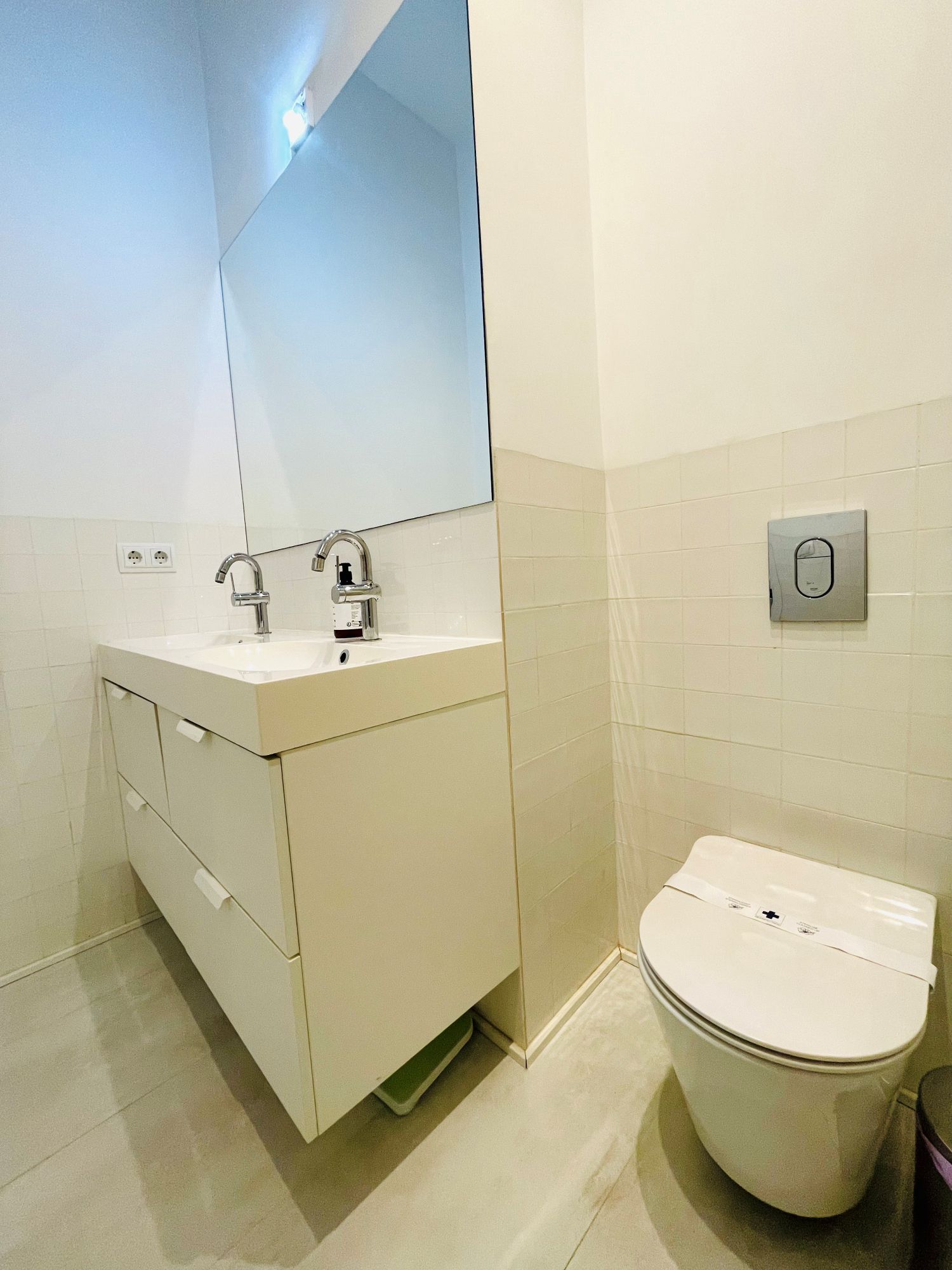 Upon entering this spacious apartment, you will notice immediately the high ceiling that gives you a great feeling of space. The living room has a very comfortable couch with a flatscreen TV. The shelf mounted to the wall, blends in perfectly with the design of the apartment and leaves plenty of space when you bring your own entertainment devices.