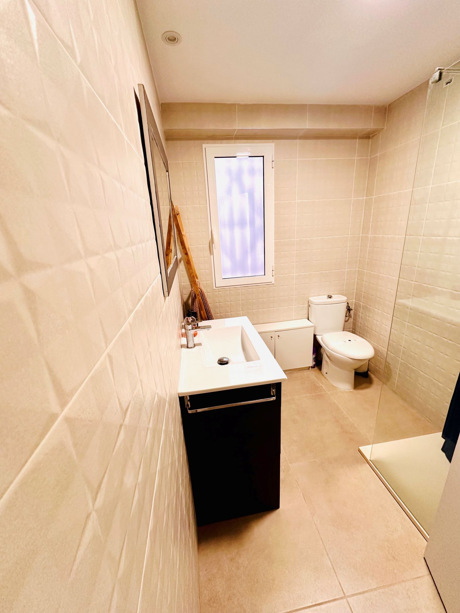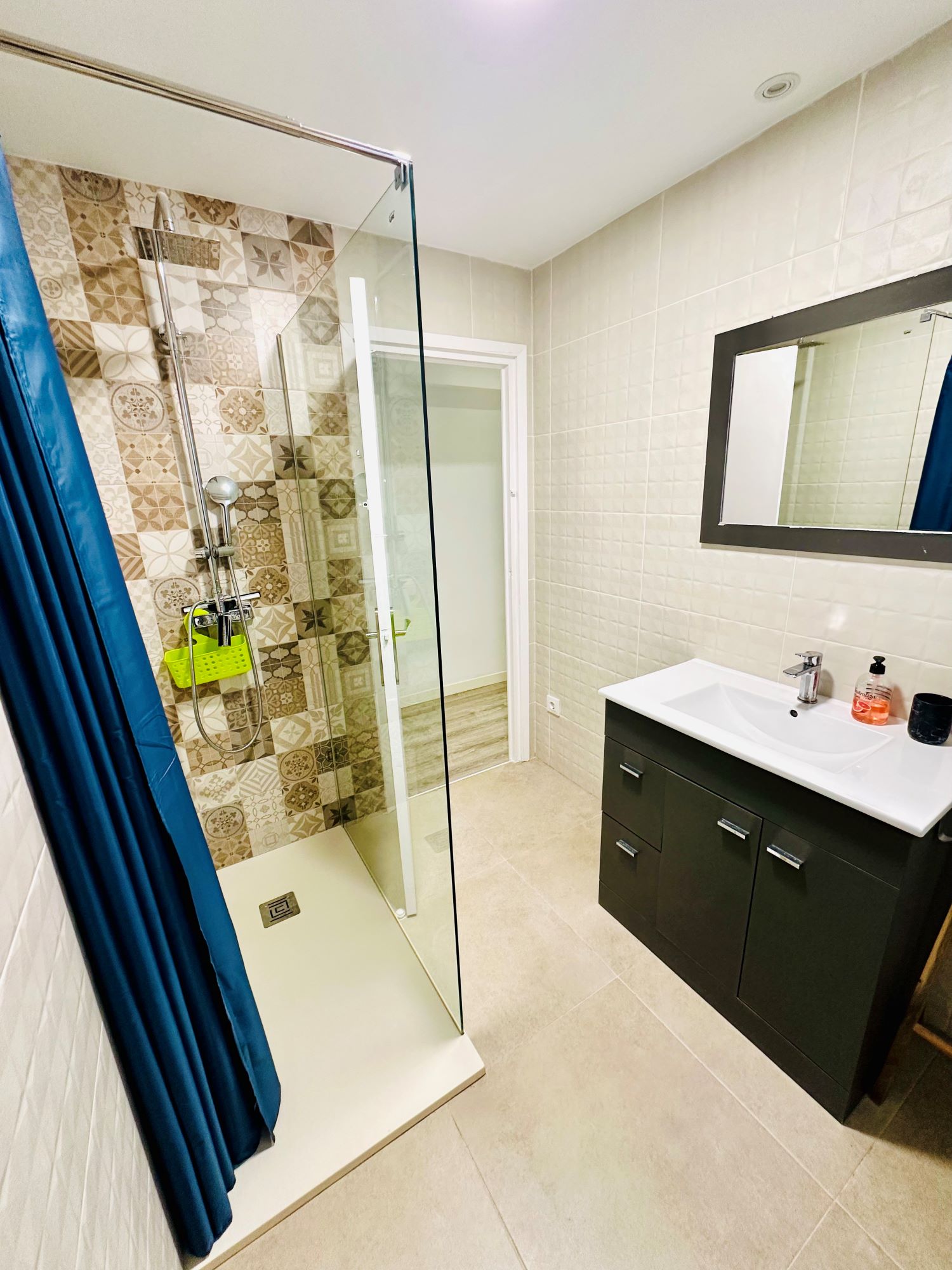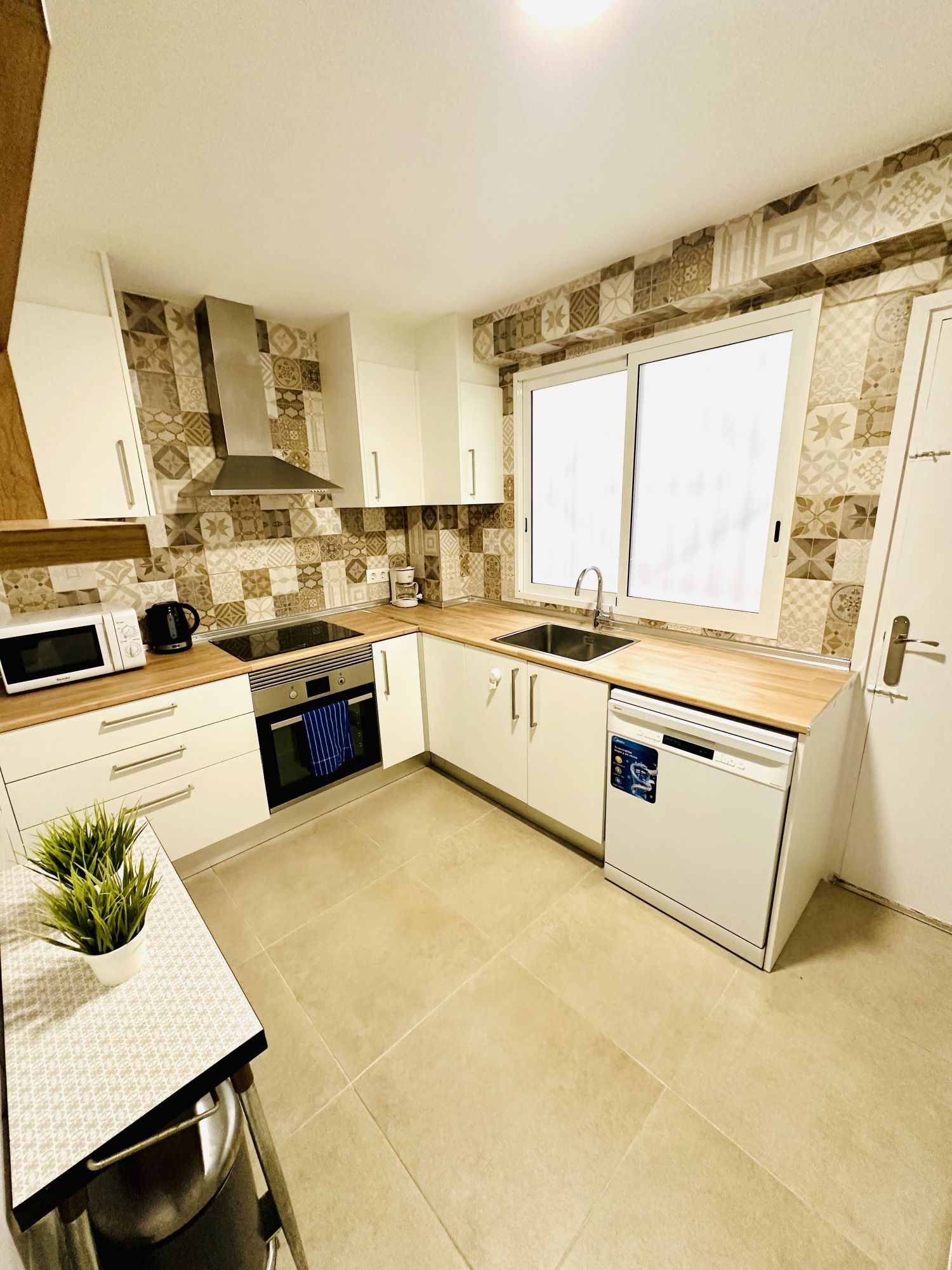The layout of this apartment is typical of Spain. The living room area is conveniently sized to host the family for TV watching or dining. The two comfortable loveseats will be enjoyed by the whole family while watching a movie on the fantastic Smart TV. The living room gives access to the cosy balcony overlooking the street. When you walk through the hallway, you will find the third bedroom first. This is the third bedroom because it has a single bed compared to the other two bedrooms that have a double bed. Next to the third bedroom, you will find a spacious, authentic bathroom with tub-shower combination.