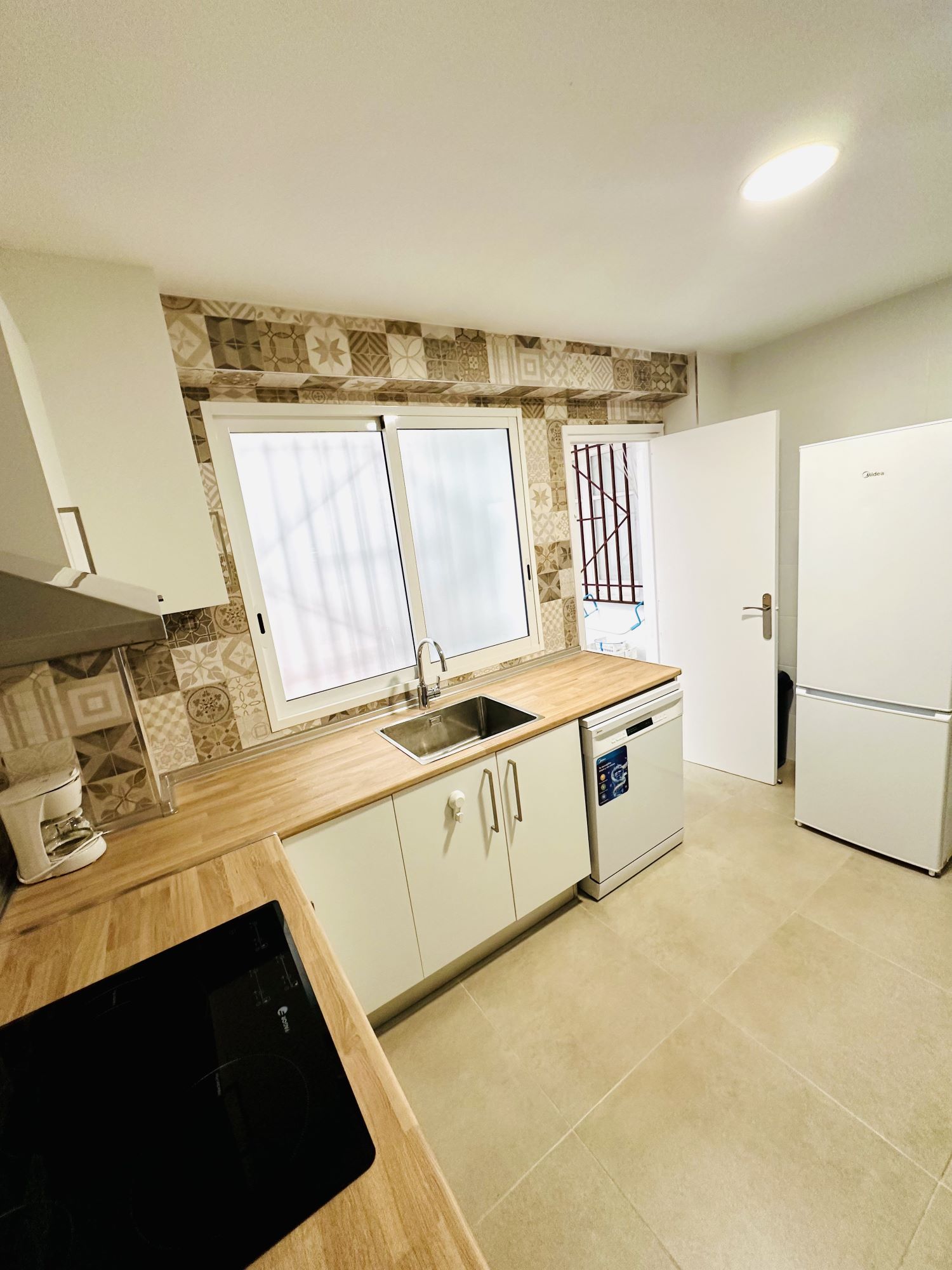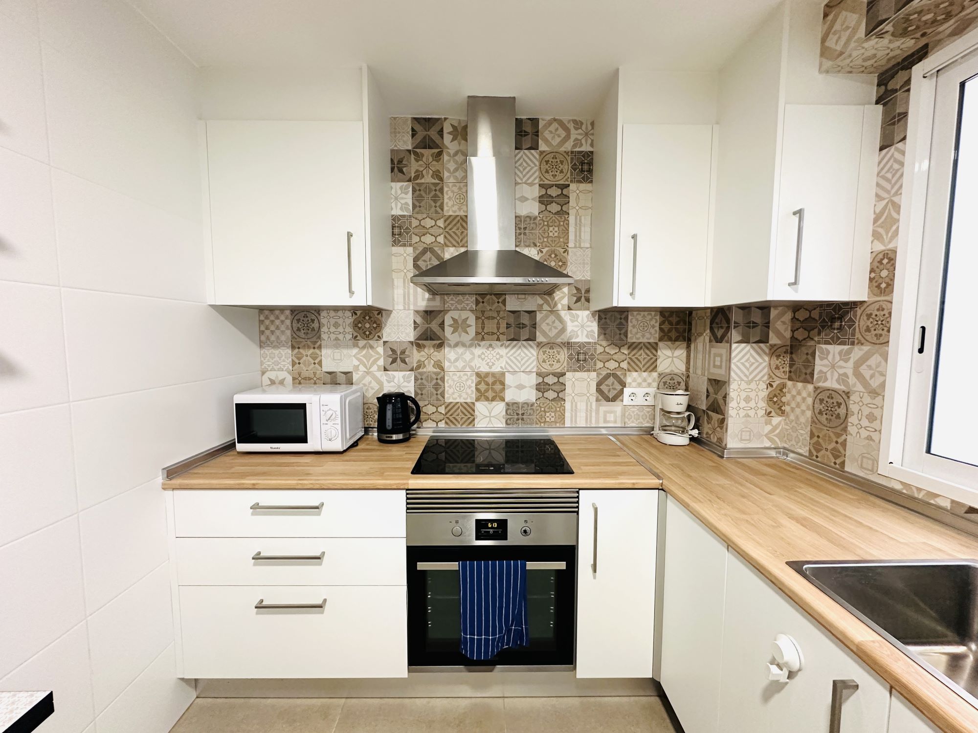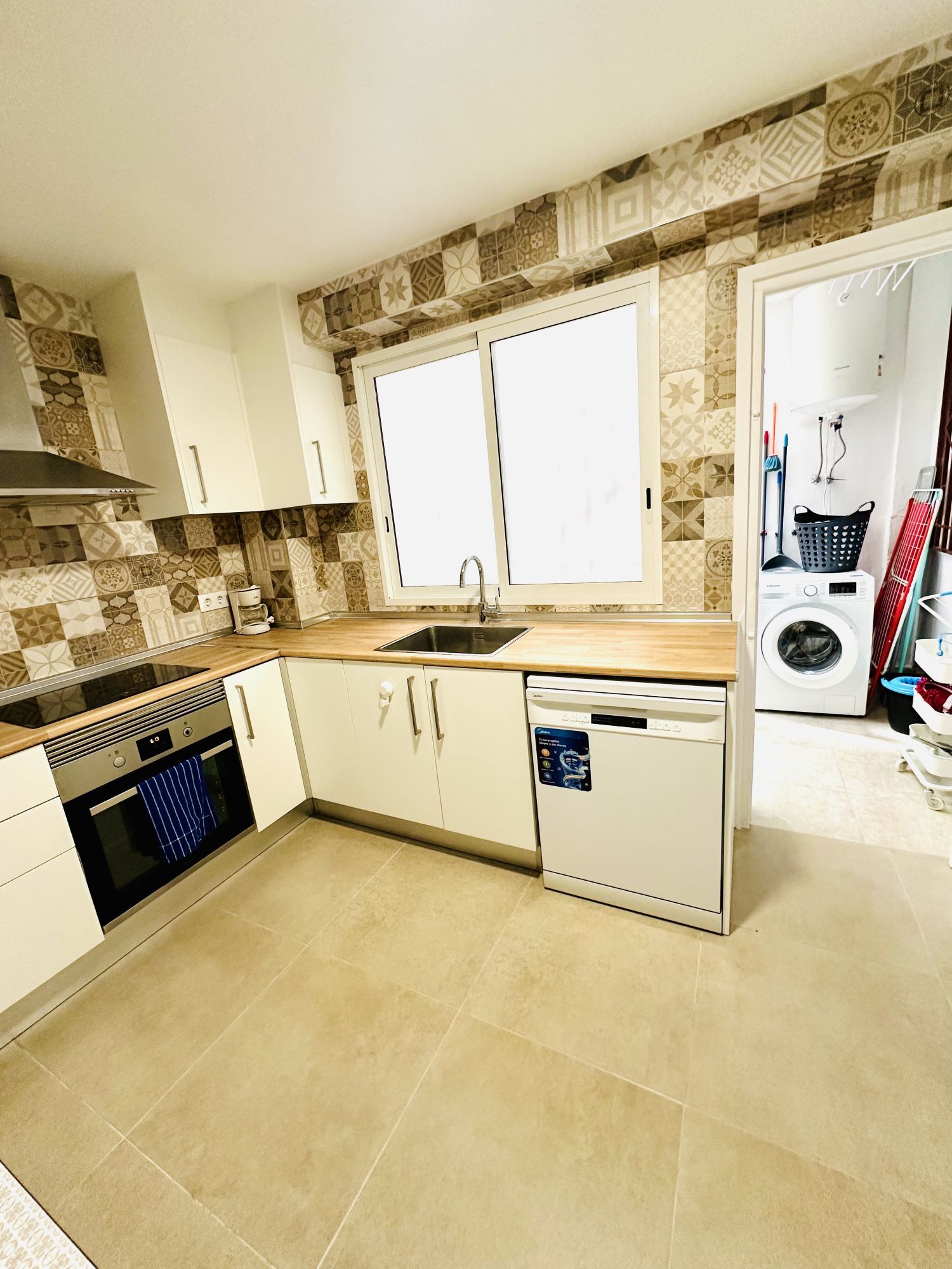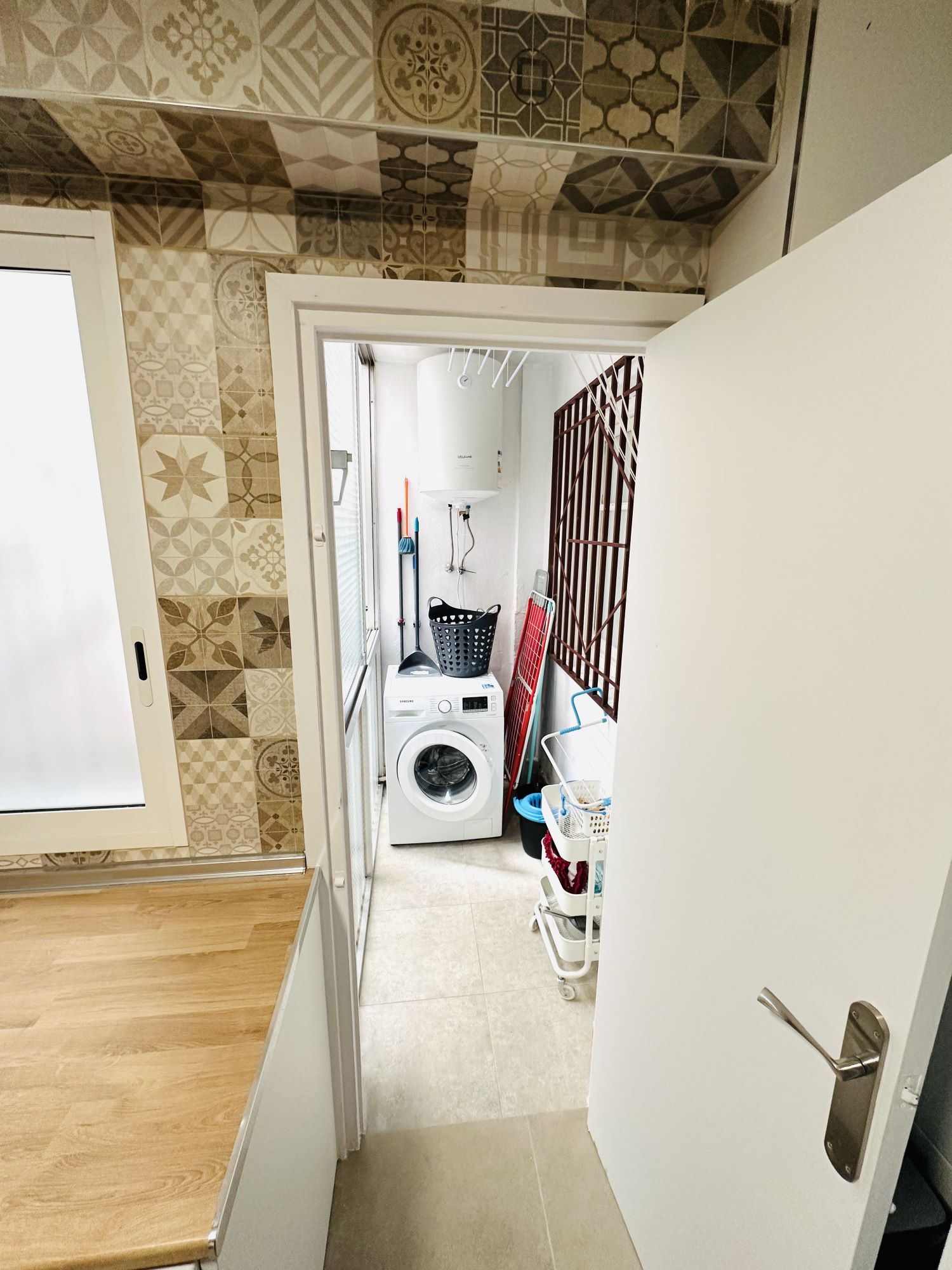 When you walk further, you will be able to access the kitchen and laundry room. The kitchen is very roomy in Spanish tradition because meals are important if not the most important thing of the day. People prepare their dinners for the whole day sometimes. This kitchen is also fully equipped and comes with all modern appliances. In the back, you will find the laundry room with a washing machine.