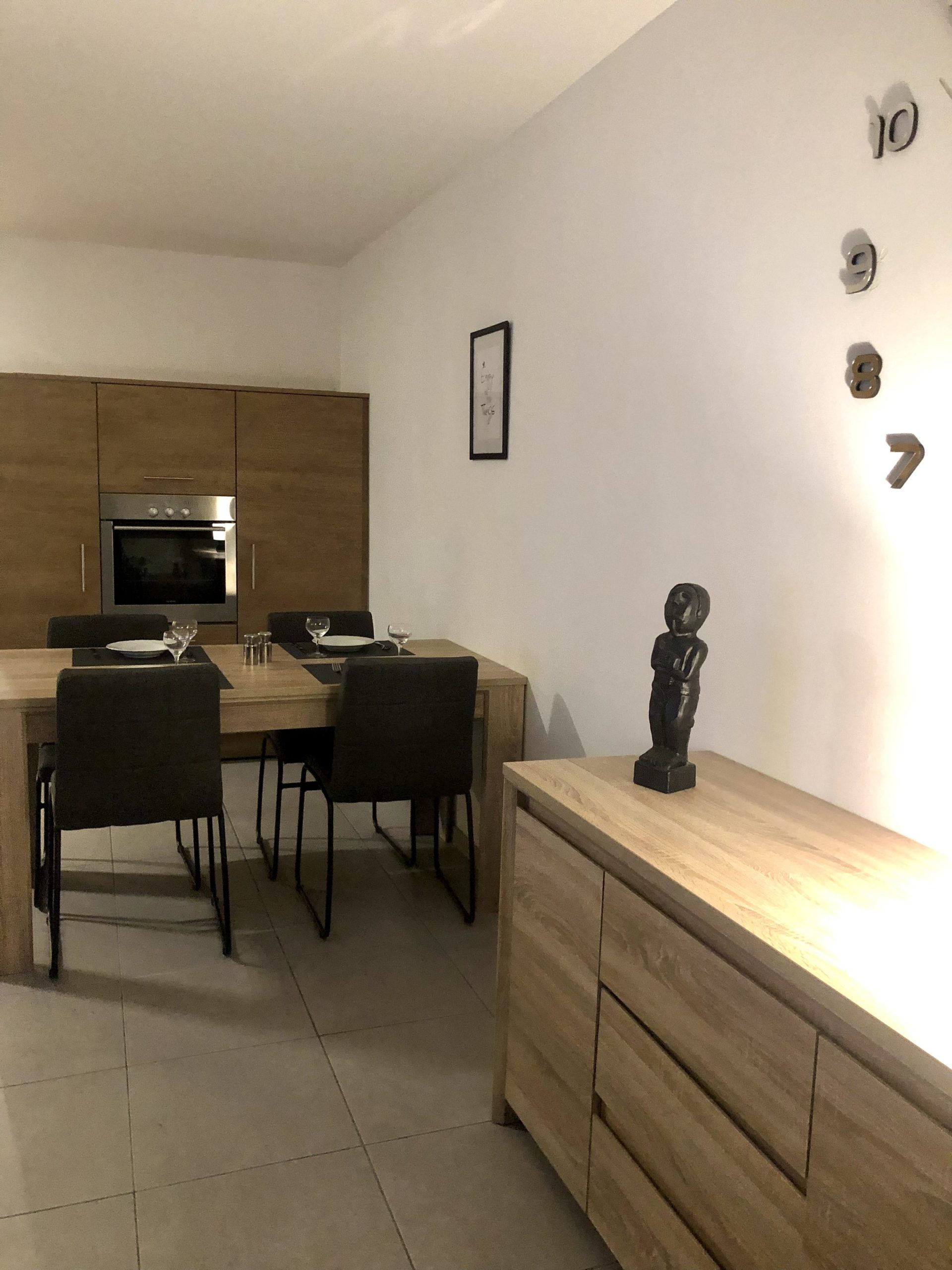 La cocina es abierta, lo que significa que la sala de estar se encuentra en la misma área. La sala de estar cuenta con un sofá cómodo y, por supuesto, un televisor de pantalla plana. Este es el lugar perfecto para relajarse después de un largo día de trabajo o los fines de semana. También tienes acceso directo al balcón. ¡Ideal para disfrutar de aire fresco!