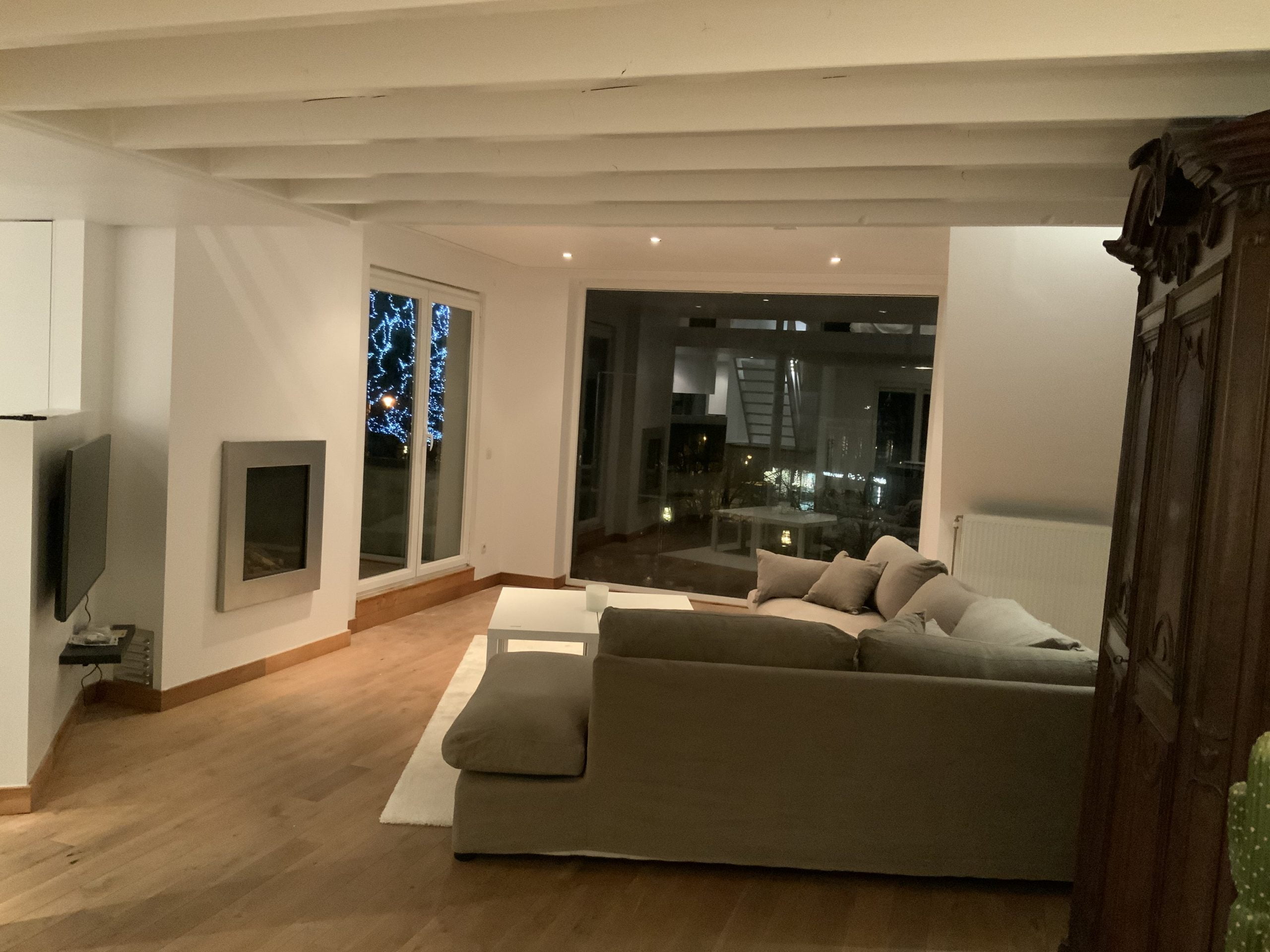¡La sala de estar también viene con una vista! La gran ventana da al centro del pueblo.