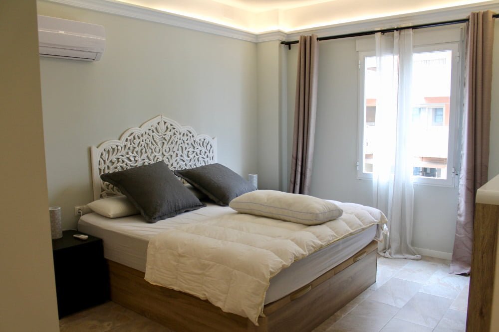 Este apartamento con terraza en Valencia puede alojar cómodamente hasta seis personas y cuenta con aire acondicionado en todas las áreas.