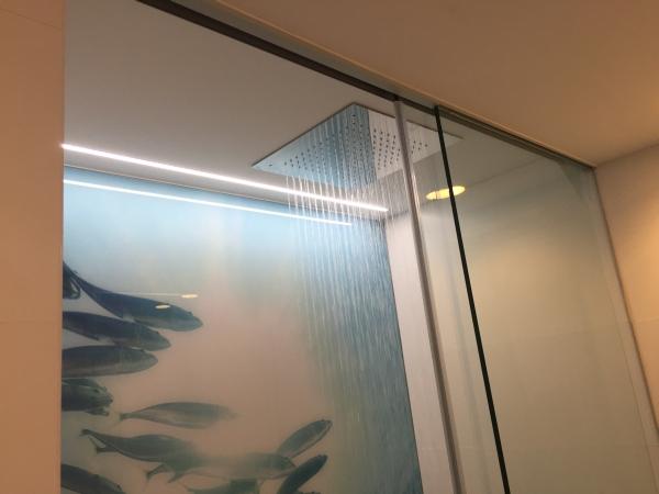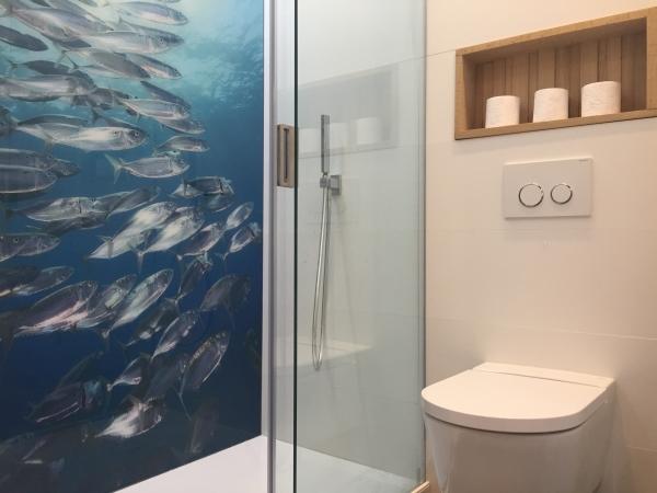 El baño con ducha a ras de suelo está decorado con un tema oceánico. Te ducharás entre los peces (en el buen sentido) mientras la gran ducha de lluvia en el techo te despierta o te prepara para una noche en la ciudad.